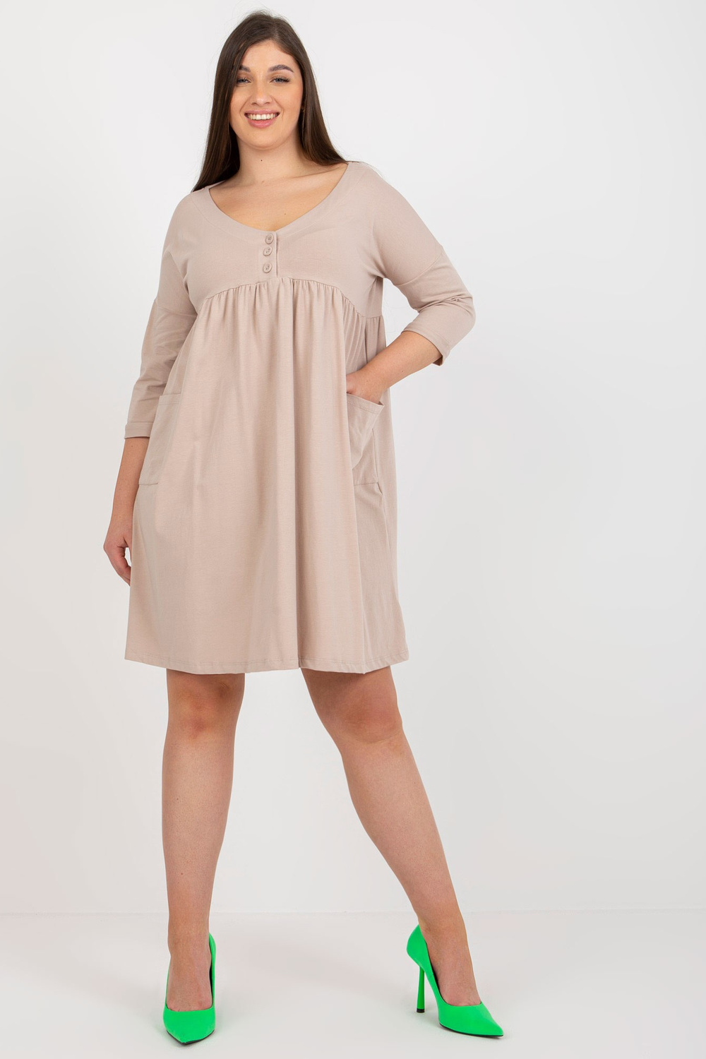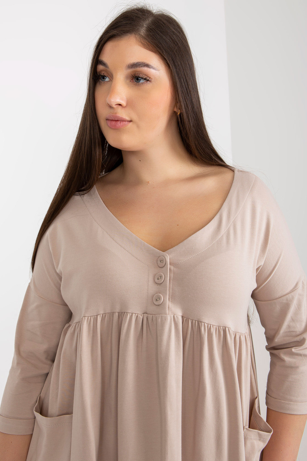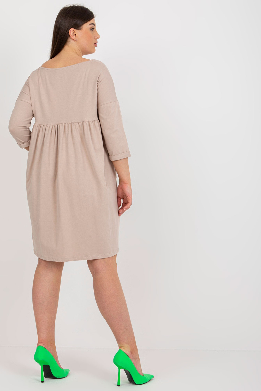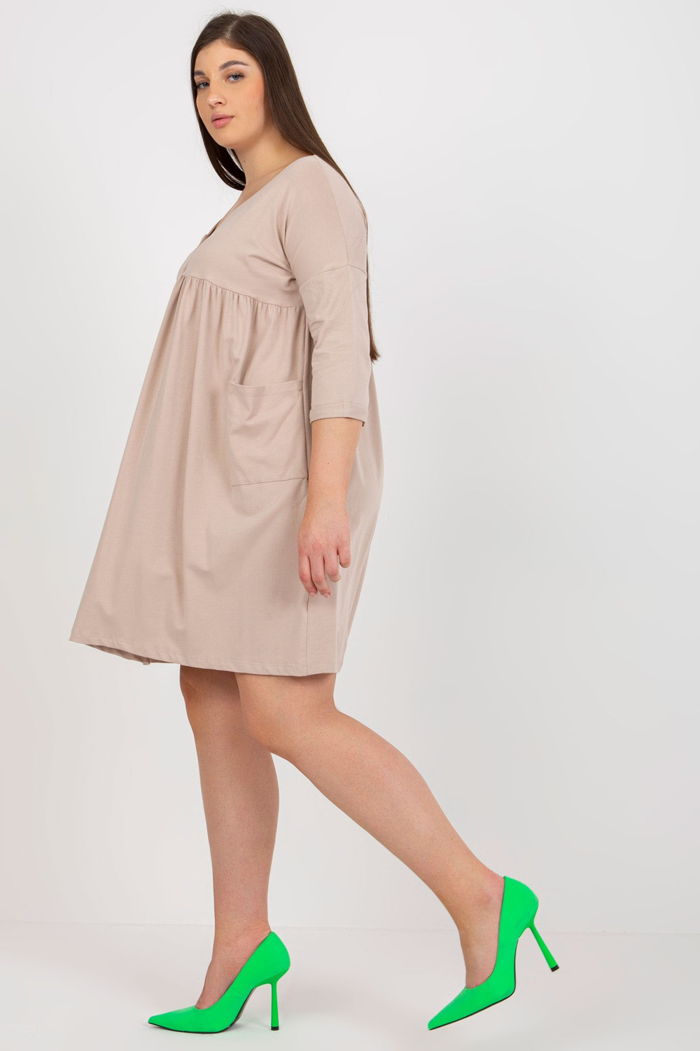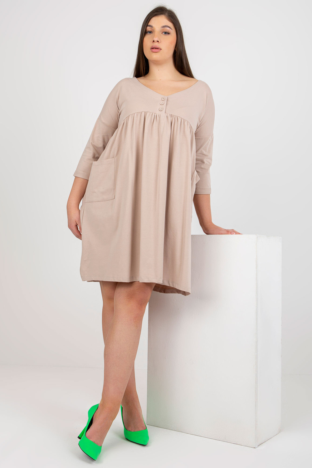 Bēša liela izmēra džemperkleita ar 3/4 piedurknēm. Produkta kods: RV-SK-8529.37P Dominējošais raksts: gluds Stils: ikdienišķs gadījums: ikdienišķs, ārpus pilsētas, pastaigāties Modele valkā viena izmēra izmēru. Modeļa izmēri: augums 174 cm, krūtis 100 cm,