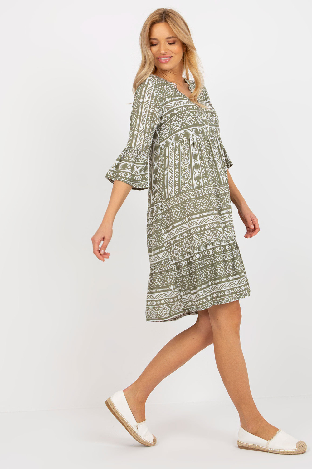 Klasiskā haki krāsas apakšlīmeņa boho kleita ir ideja katrai modernai sievietei. Izgatavots no augstas kvalitātes materiāla tikai jūsu ērtībām. Ērts piegriezums ar garām piedurknēm un sasienamu jostu jostasvietā būs lielisks jūsu garderobes elements. Boho stilā gludais haki audums ir dekorēts ar smalkiem rakstiem, kas piešķirs jums nedaudz oriģinālu raksturu. Tas derēs katru dienu, pastaigā vai pilsētā. Modele valkā S izmēru. Kleitas izmēri S izmēram mērīti plakani: platums zem padusēm - 48 cm, piedurknes garums - 41 cm, kopējais garums - 98 cm. Varat būt pārliecināti, ka šī brīvā Sublevel boho kleita piešķirs jums modernu izskatu un komfortu jebkurā situācijā. Preces kods: D73771M30214H.