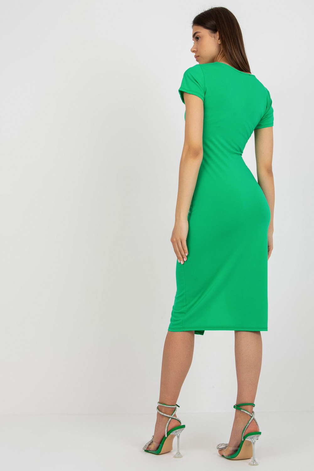 Zaļa pieguļoša kokteiļkleita ar volāniem.