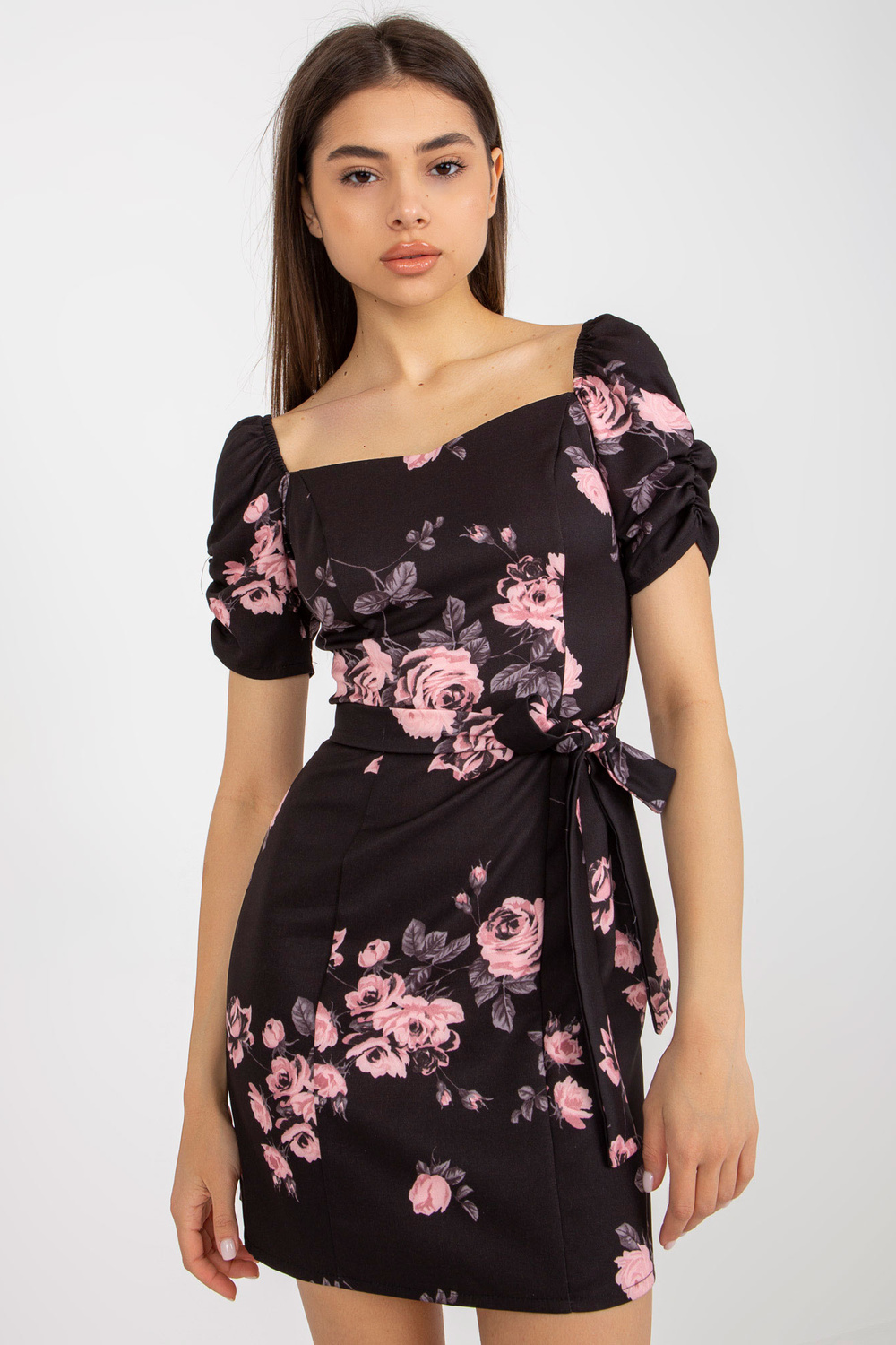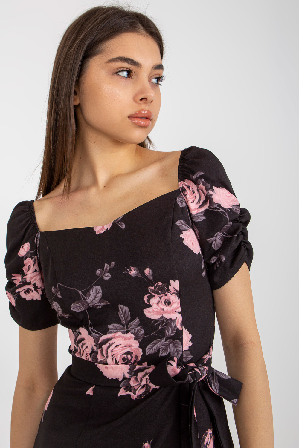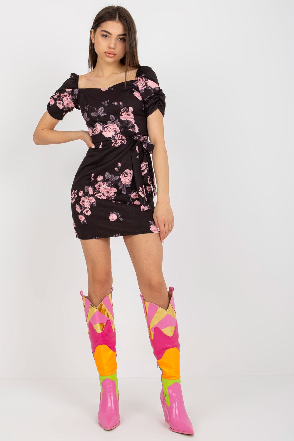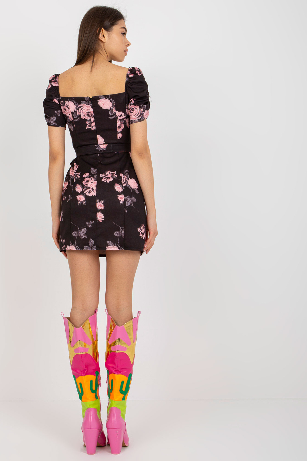 Melnā un rozā Ilonas ziedu zīmuļu kokteiļkleita.
