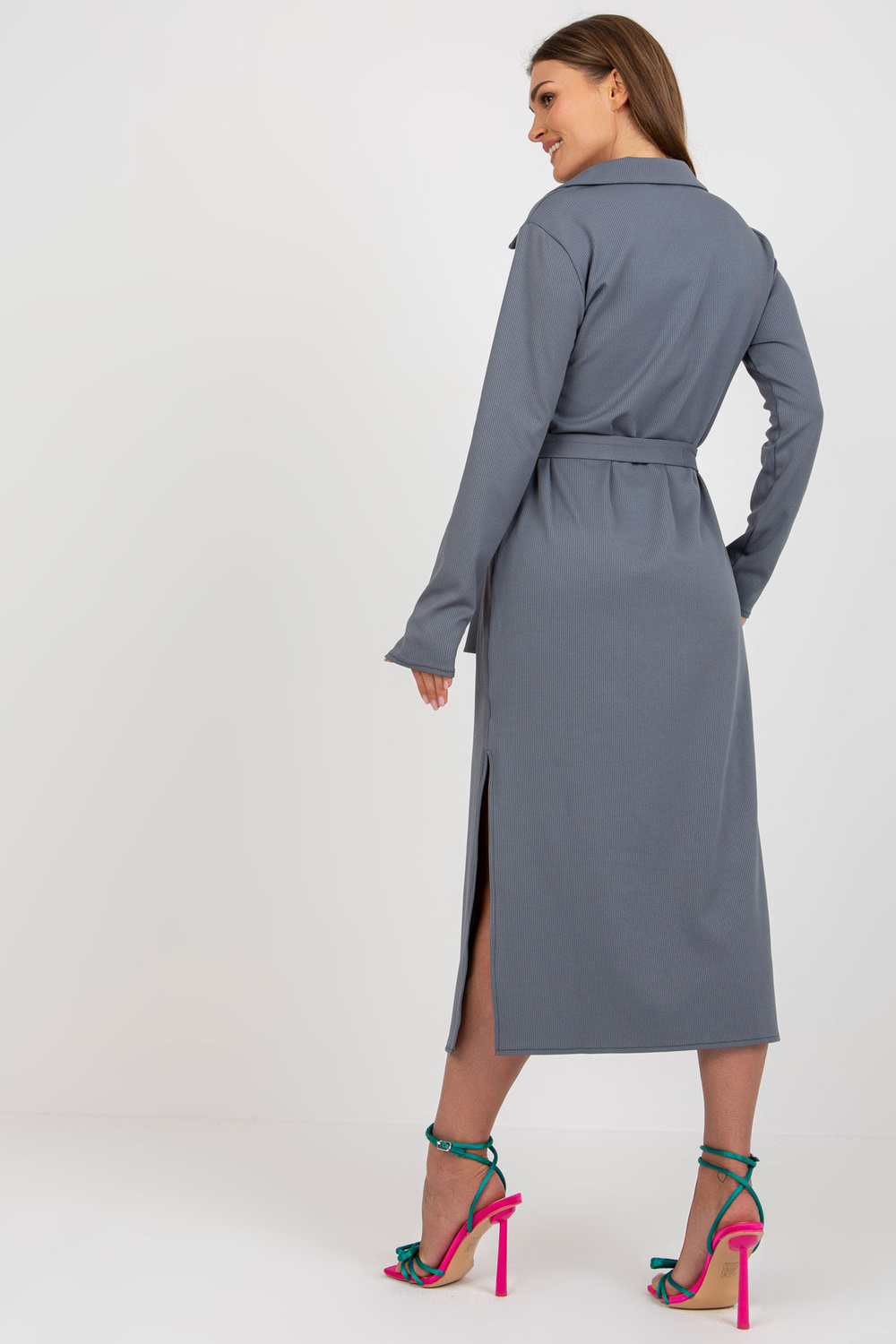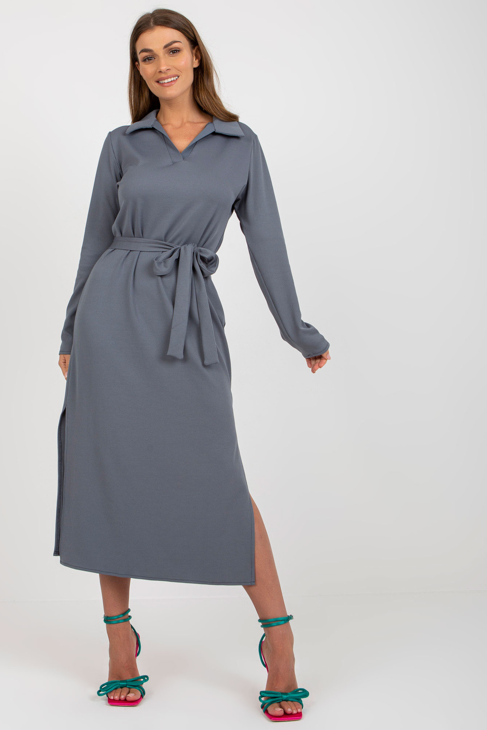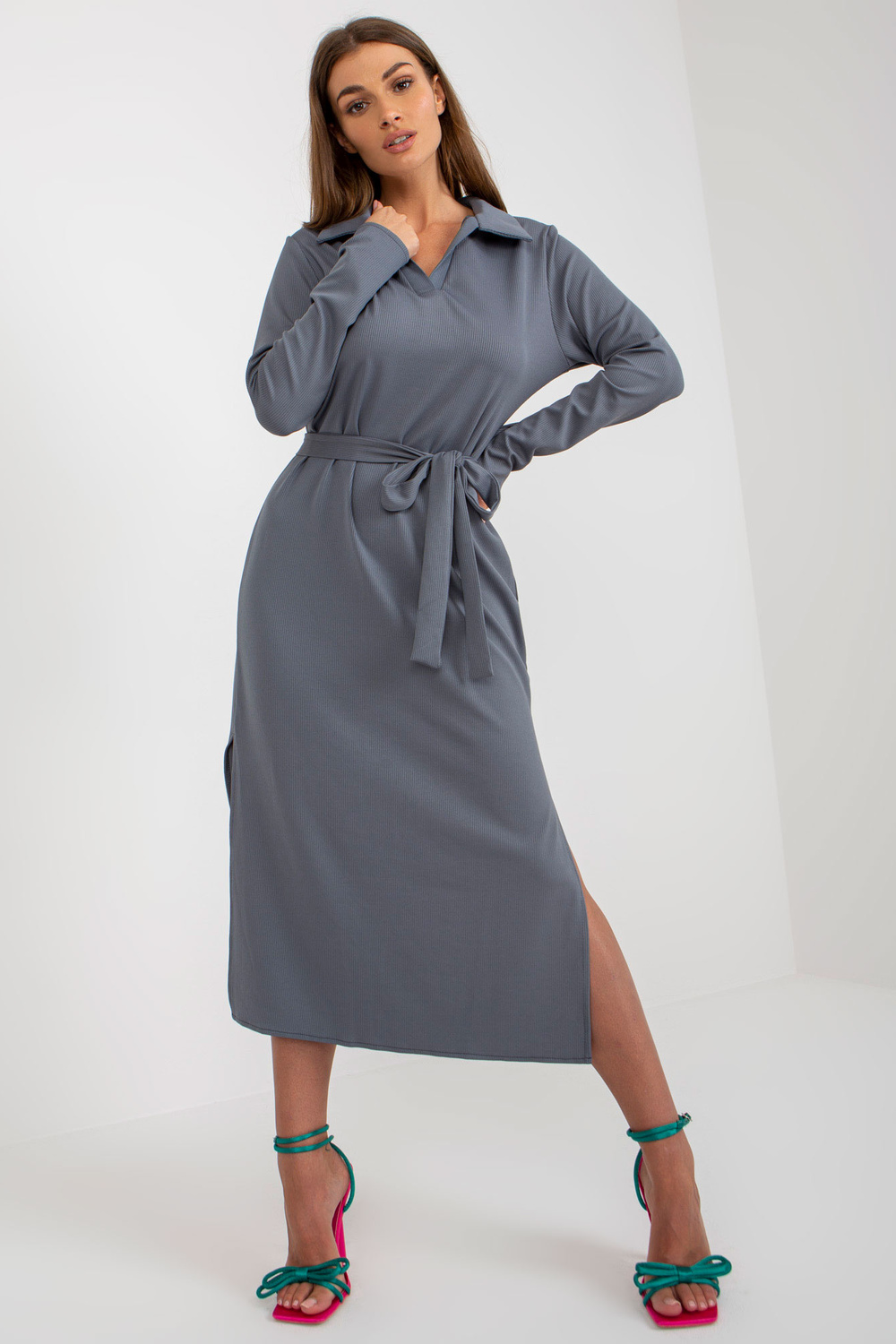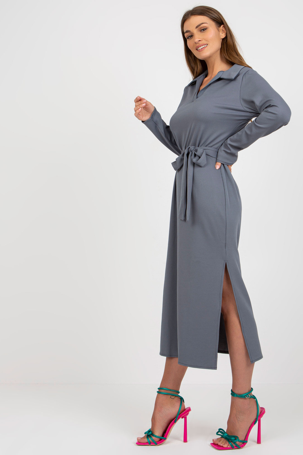 Pelēka rievota kleita ar apkakli un V veida kakla izgriezumu.