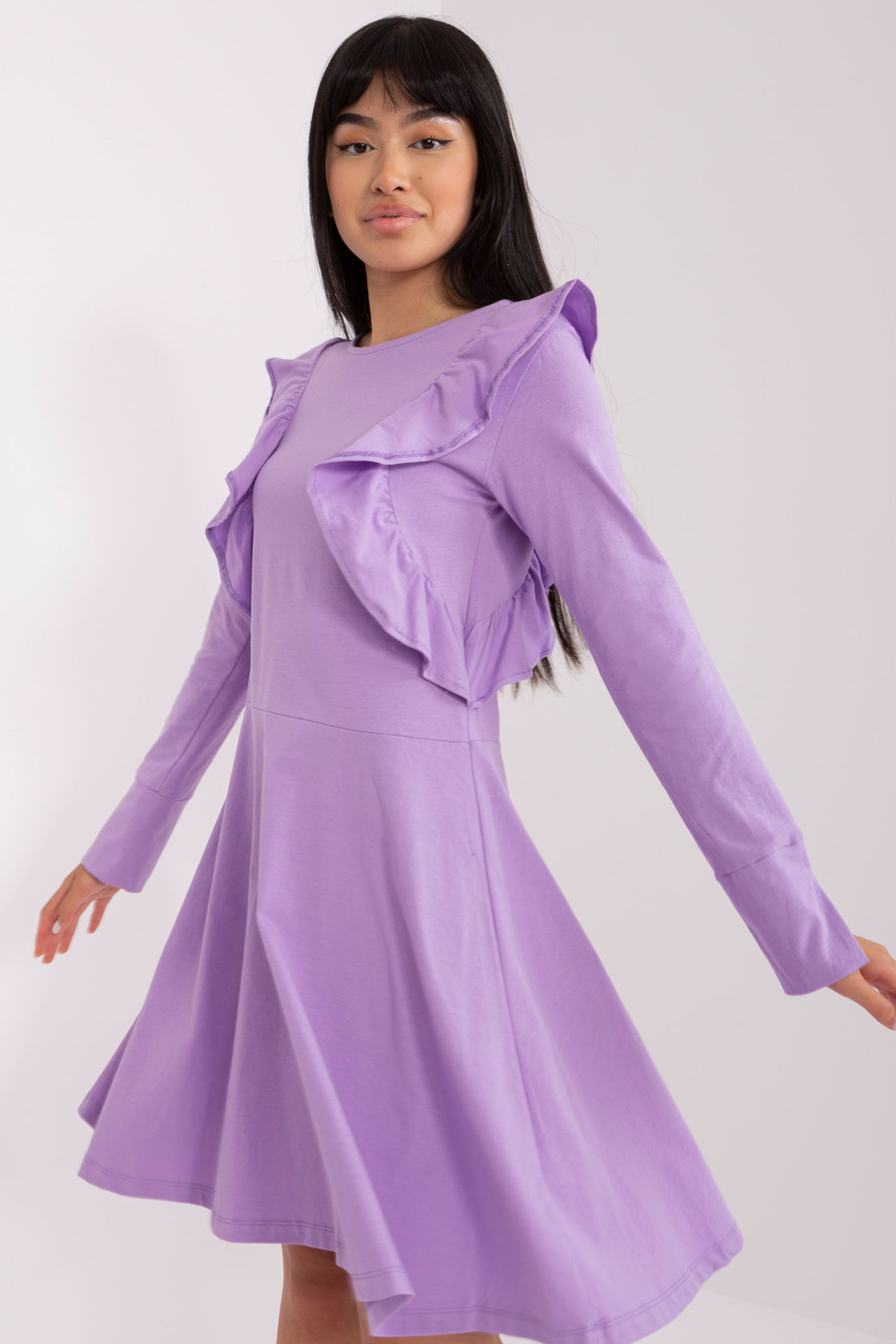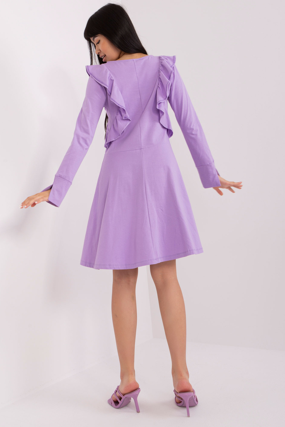 Kleitas izmēri S izmēram mērot uz plakanas: paduses platums - 45 cm, piedurknes garums - 58 cm, kopējais garums - 90 cm.
