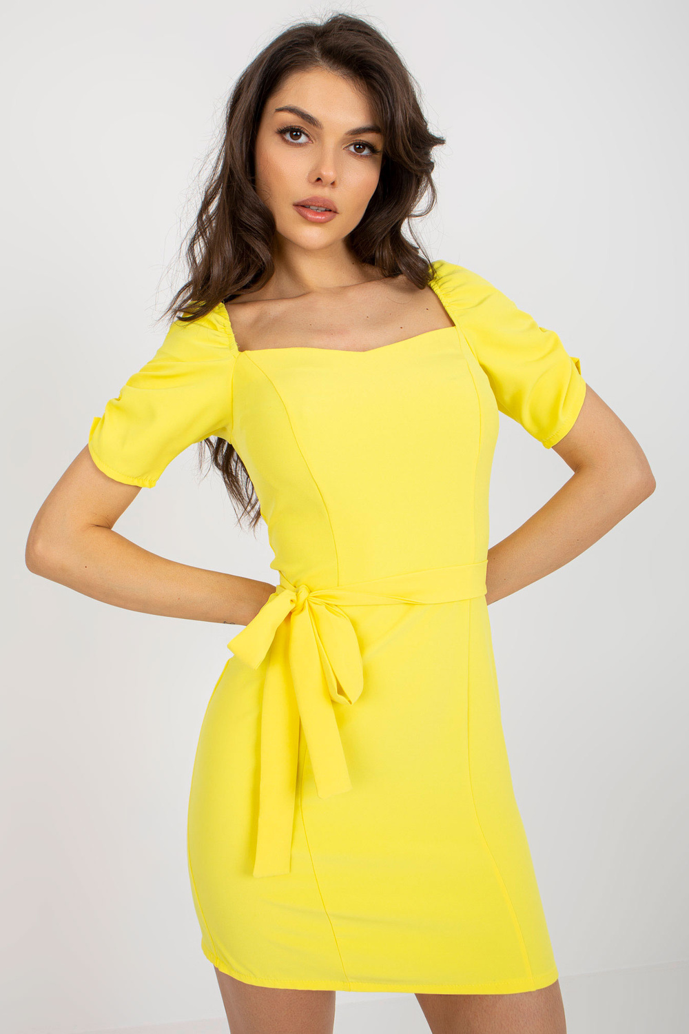 Dzeltena pieguloša kokteiļkleita ar īsām piedurknēm.