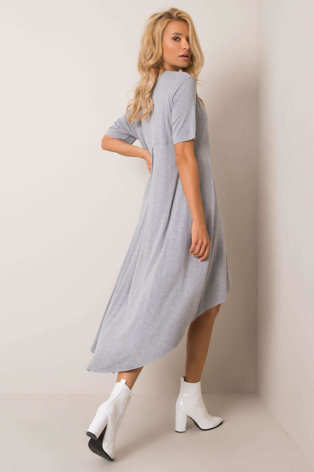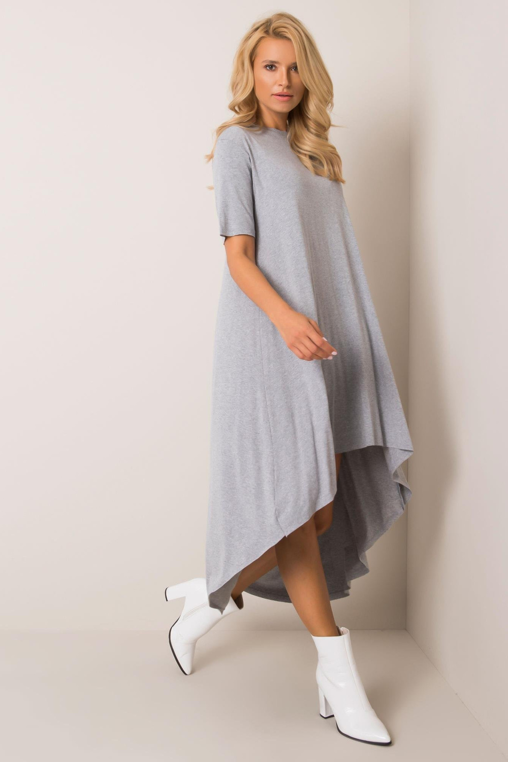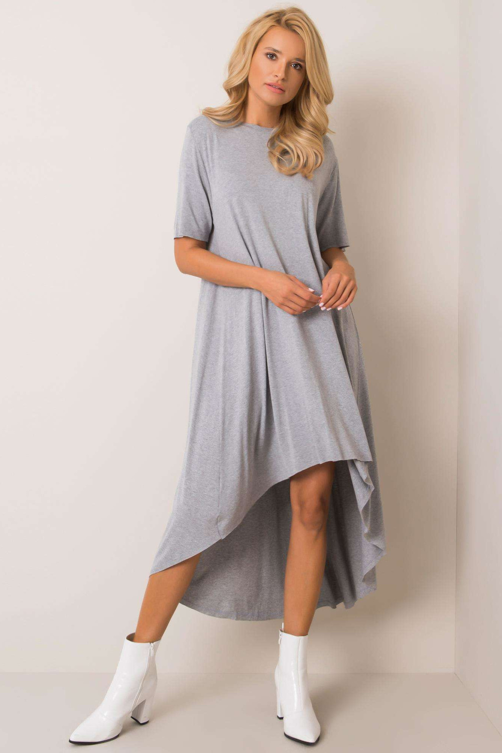 Greymelange kleita Casandra RUE PARIS Aktu tendenču iedvesmota kleita ar lielizmēra piegriezumu, kas lieliski piemērota ikdienas izskatam. Brīvs piegriezums ar skaidri izteiktu asimetriju garākas muguras formā. Modes kleita ir ar apaļu kakla izgriezumu un īsām piedurknēm. Uzmanīgi fabrica