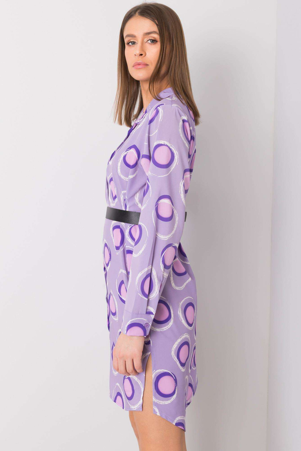 Farro violeta kleita. Aksesuāri: pogu aizdari, siksnas materiālssastāvs: 50% poliesters, 45% viskoze, 5% elastāns Mazgāšanas metode: veļas mašīna 30°C. Modelis valkā viena izmēra izmēru. Modeļa izmēri: augums 176 cm, krūtis 85 cm, viduklis 64 cm, gurni