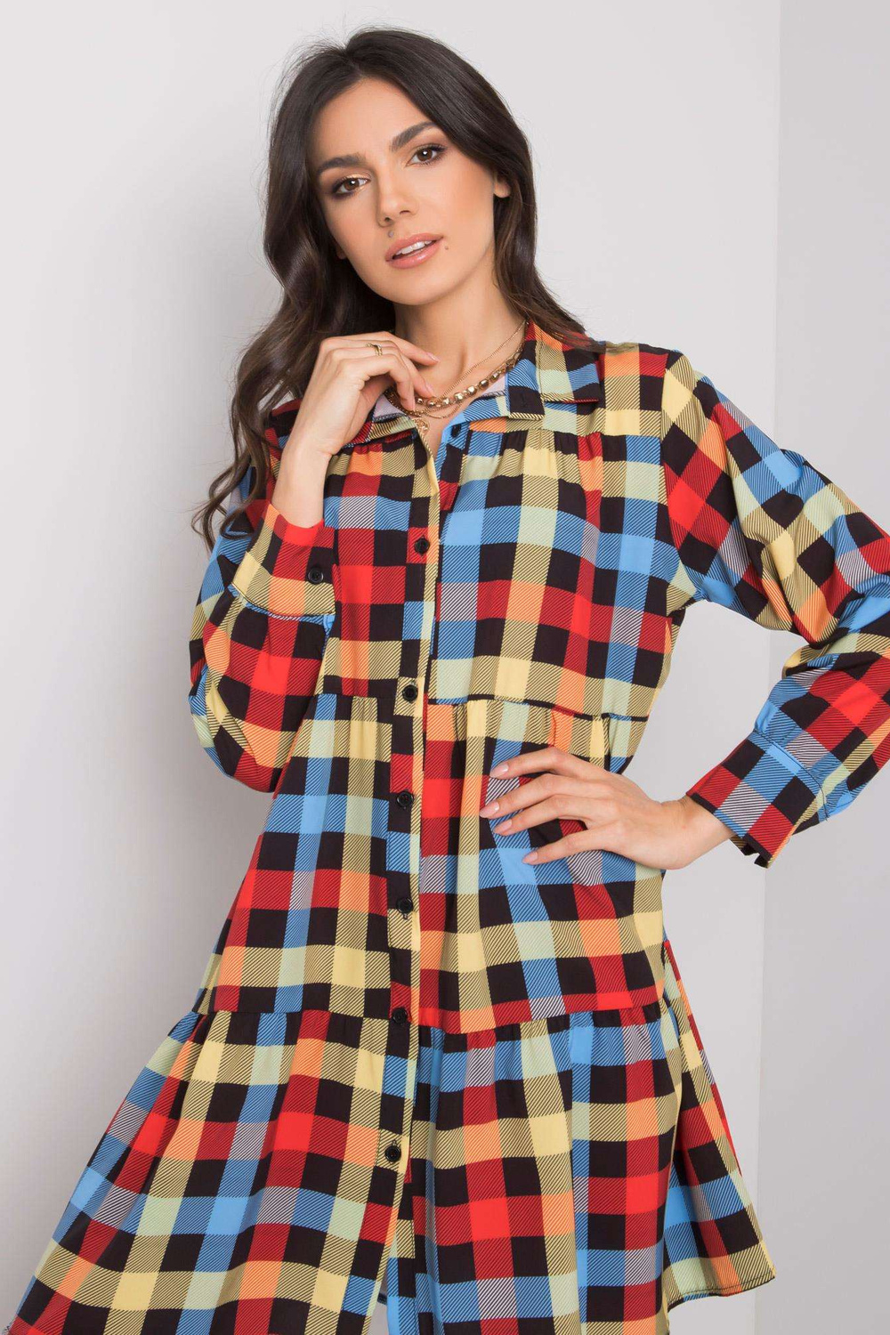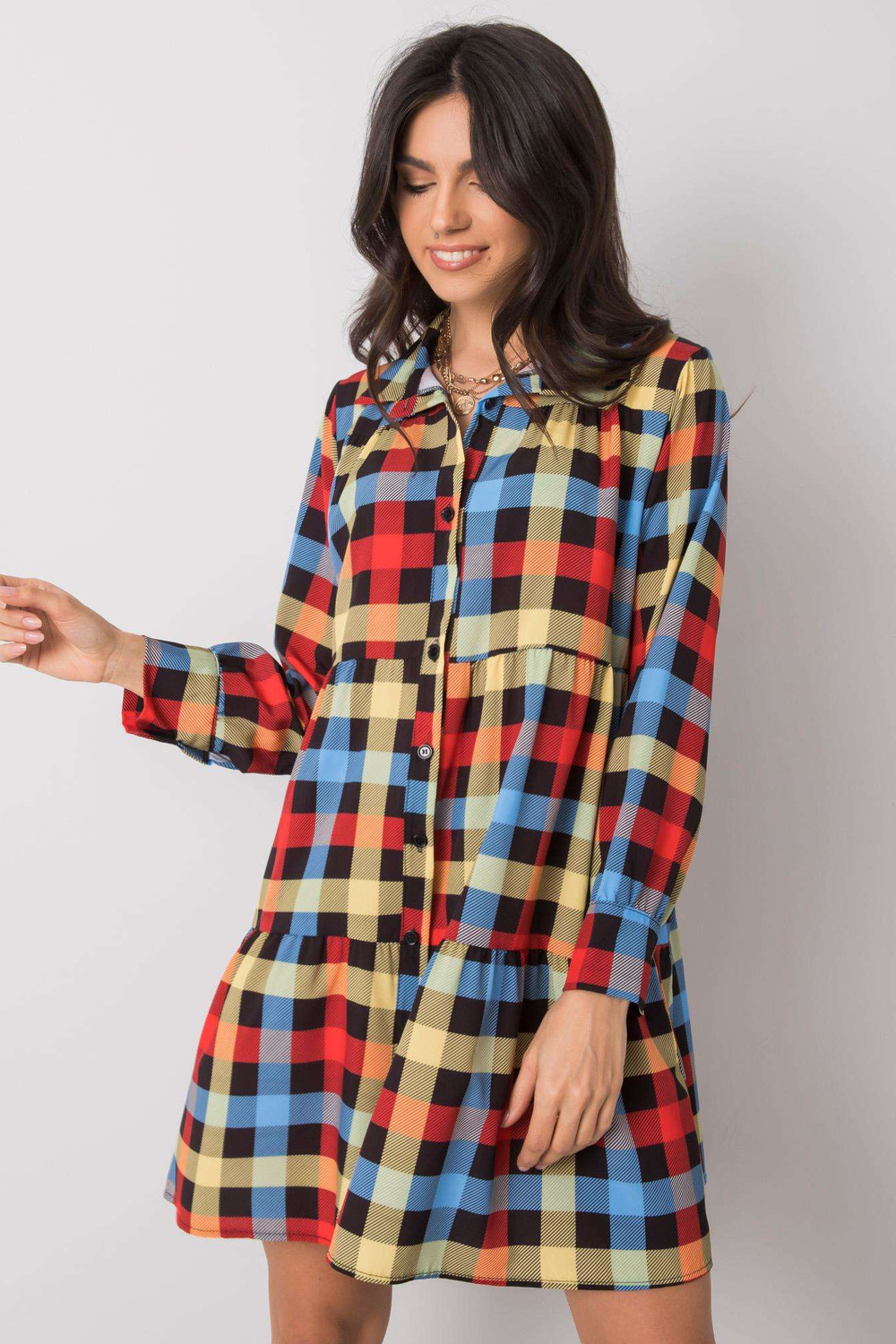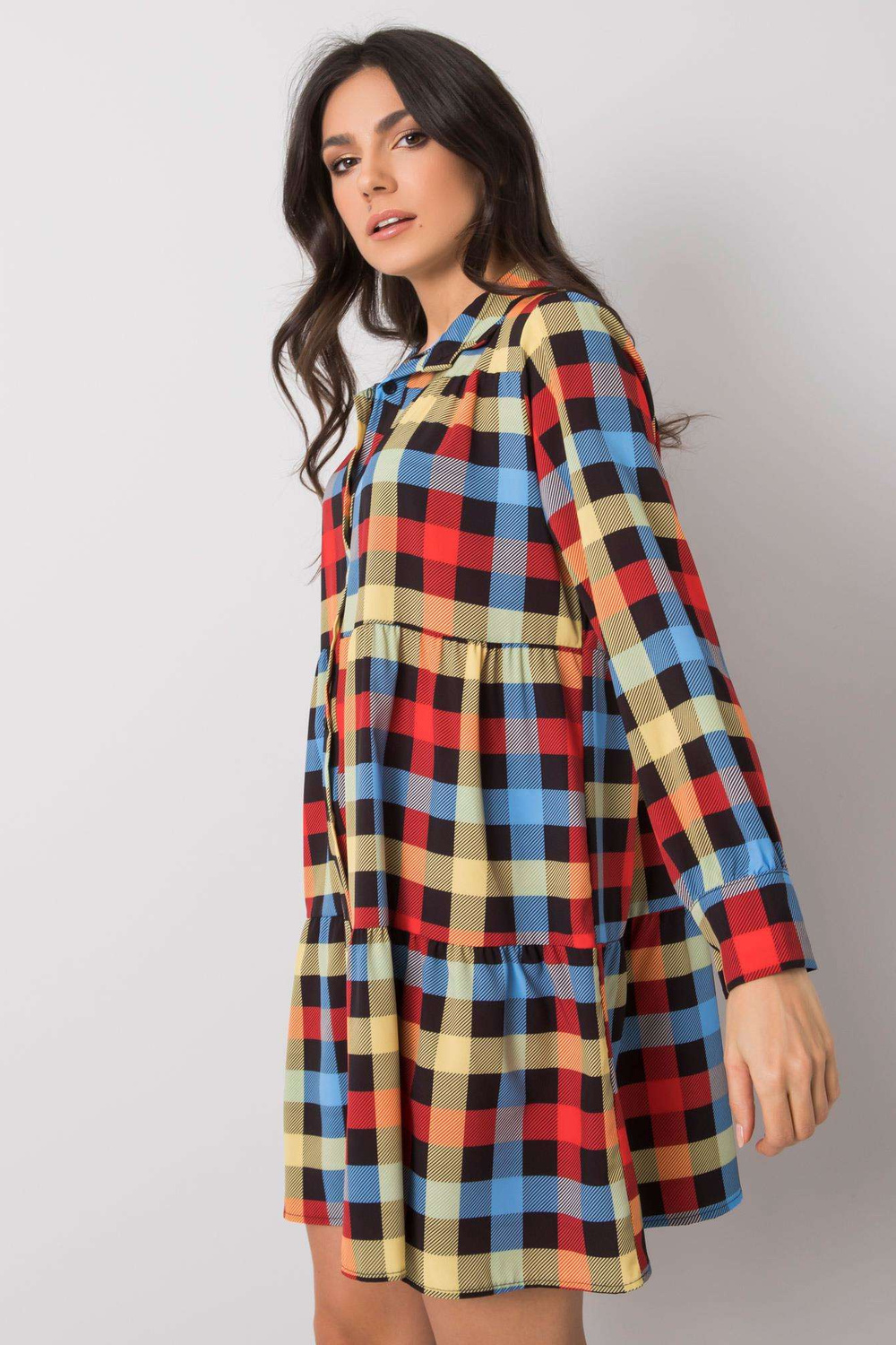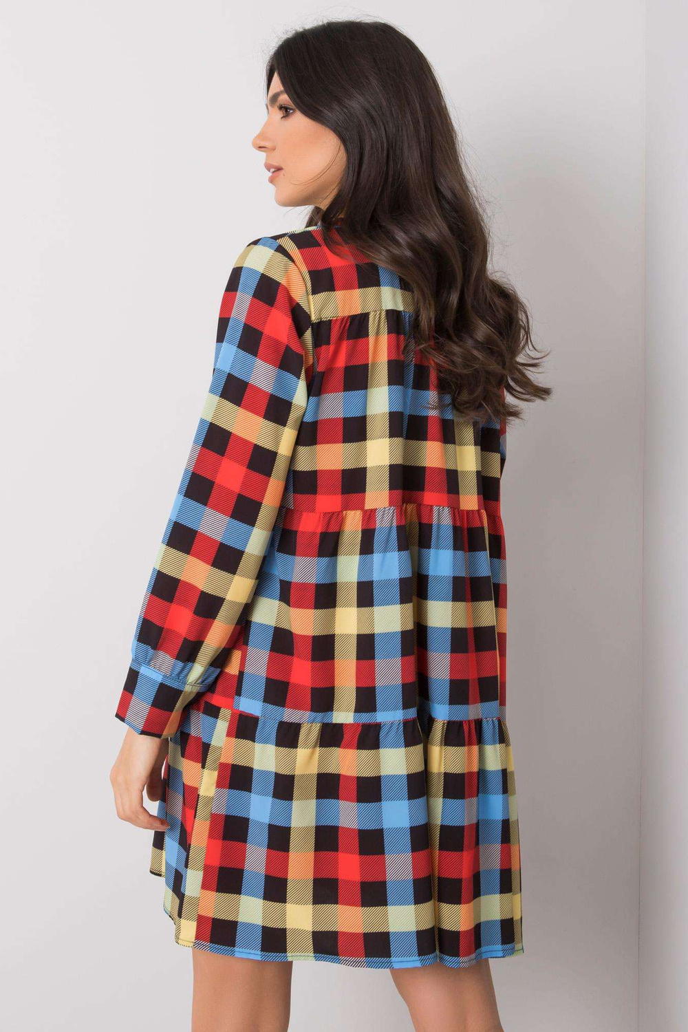Jendayi sarkanā un zilā rūtainā kleita. materiālssastāvs: 50% poliesters, 45% viskoze, 5% elastāns mazgāšanas metode: veļas mašīna 30°C. Modelis valkā viena izmēra izmēru. Modeļa izmēri: augums 175 cm, krūtis 85 cm, viduklis 65 cm, gurni 89 cm. Izmēri