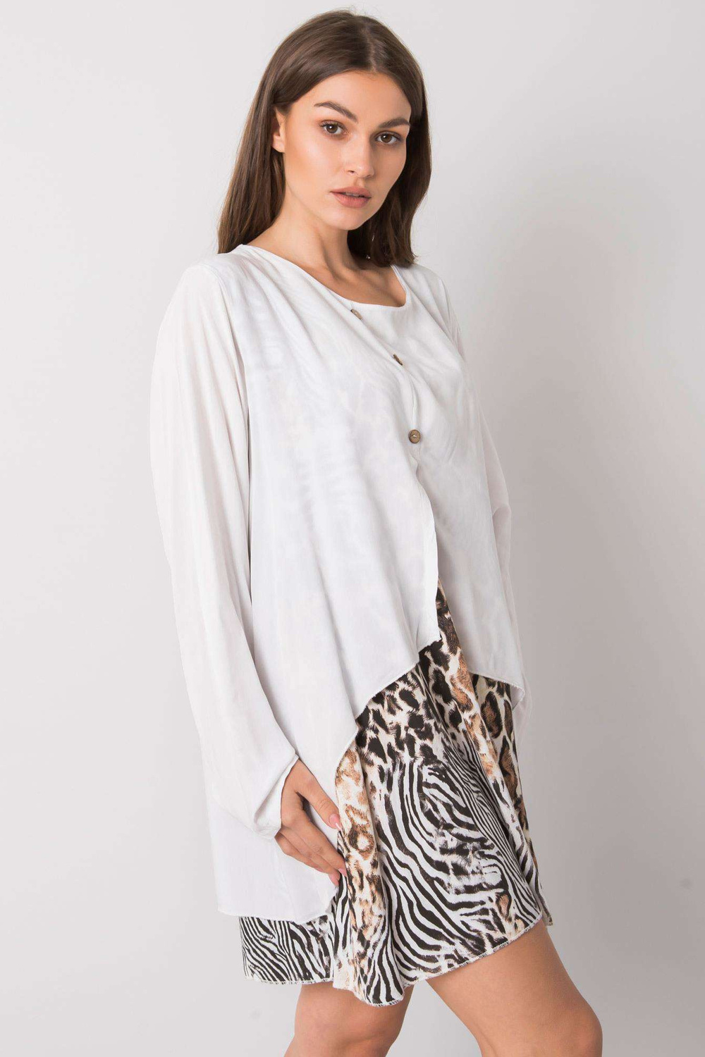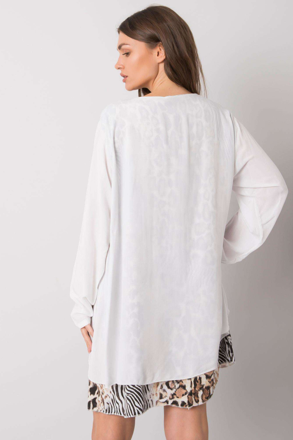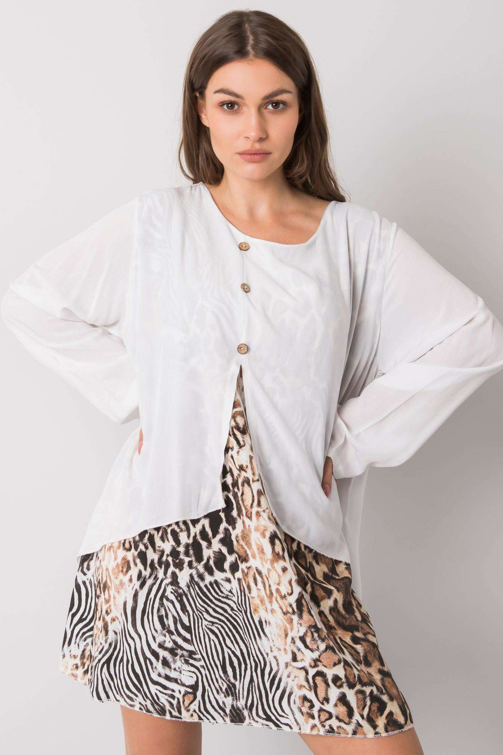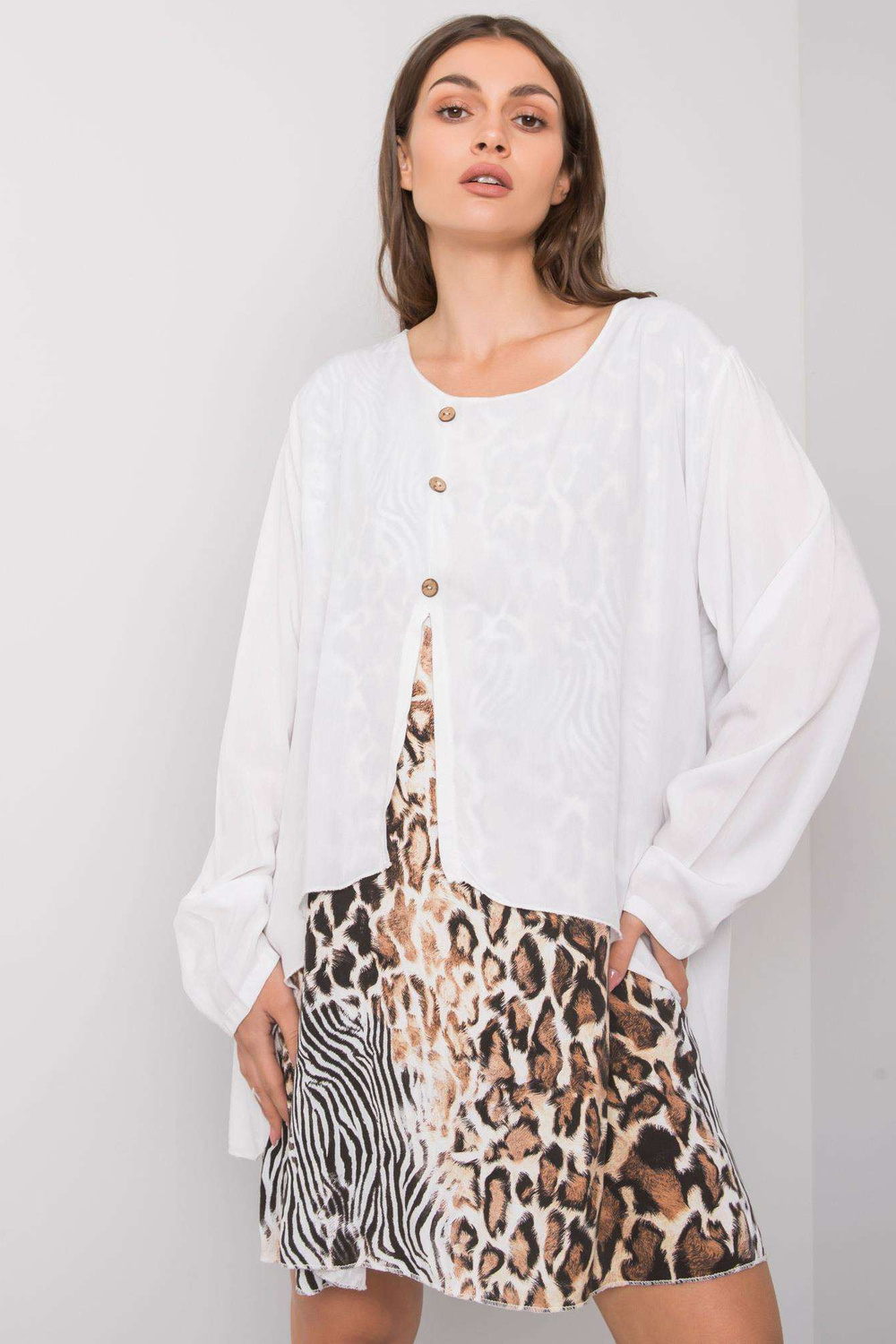Modelis ir valkā vienu izmēru. Modeļa izmēri: augums 170 cm, krūtis 93 cm, viduklis 66 cm, gurni 93 cm.