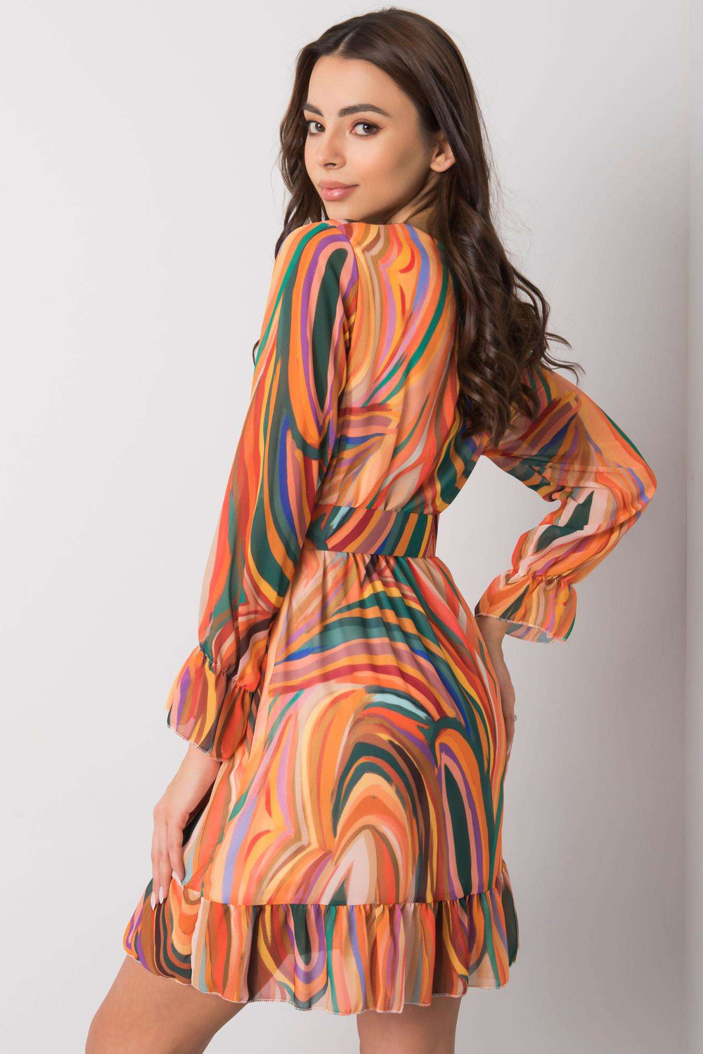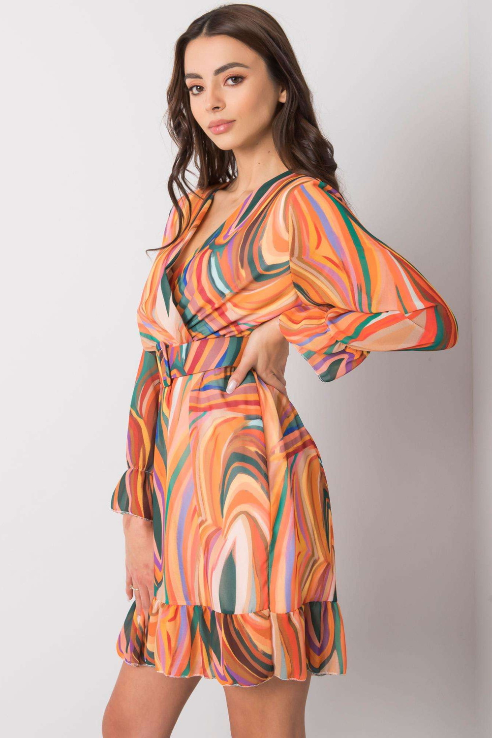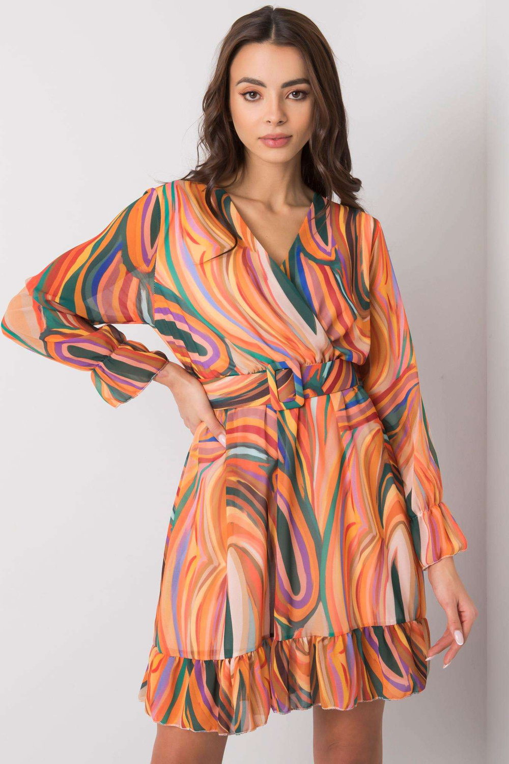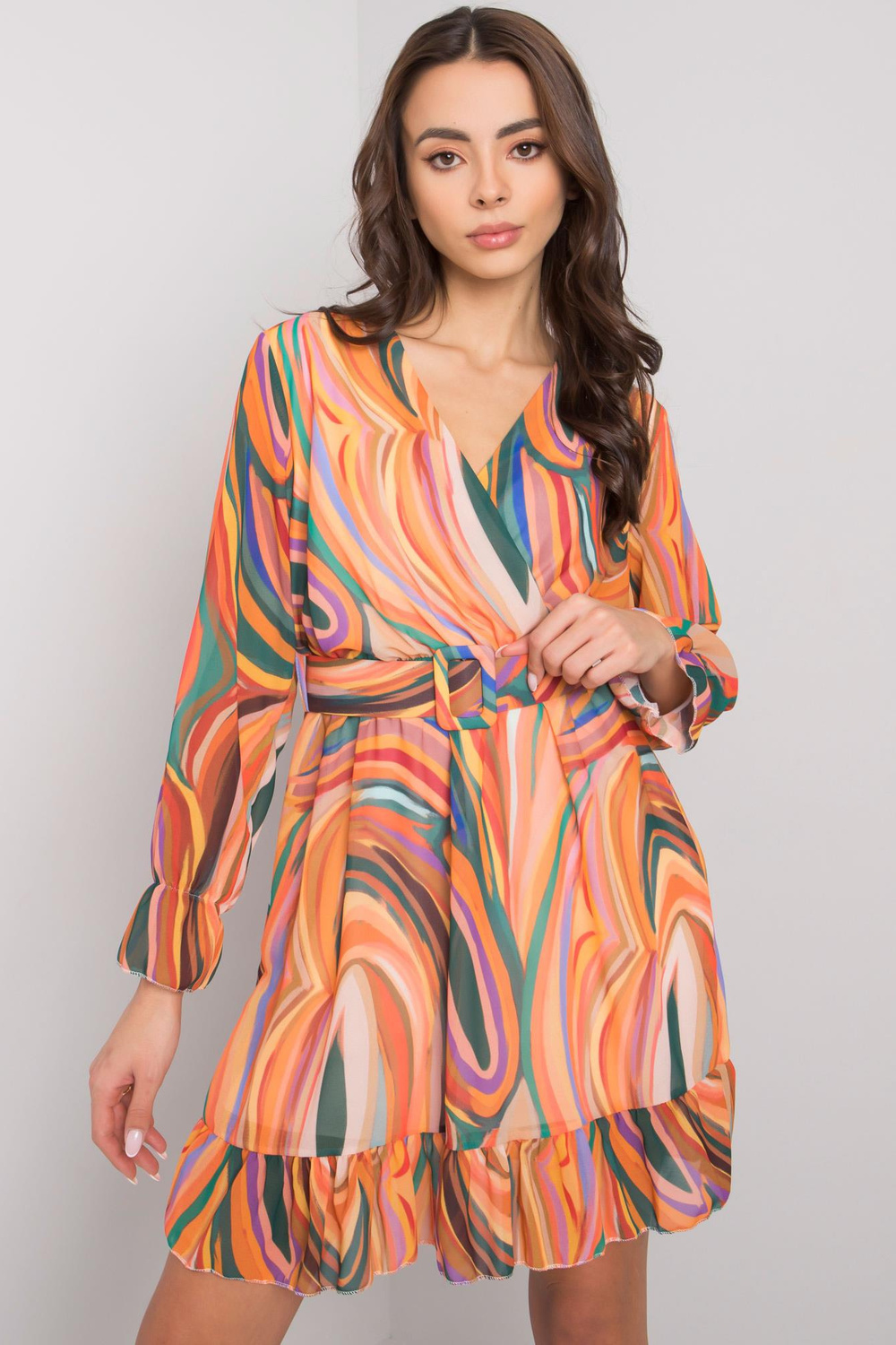 Oranži raksta kleita ar Kerley jostu. aksesuāri: siksniņa, oderes materiālssastāvs: 50% poliesters, 45% viskoze, 5% elastāns mazgāšanas metode: veļas mašīna 30°C. Modelis valkā vienu izmēru. Modeļa izmēri: augums 175 cm, krūtis 84 cm, viduklis 61