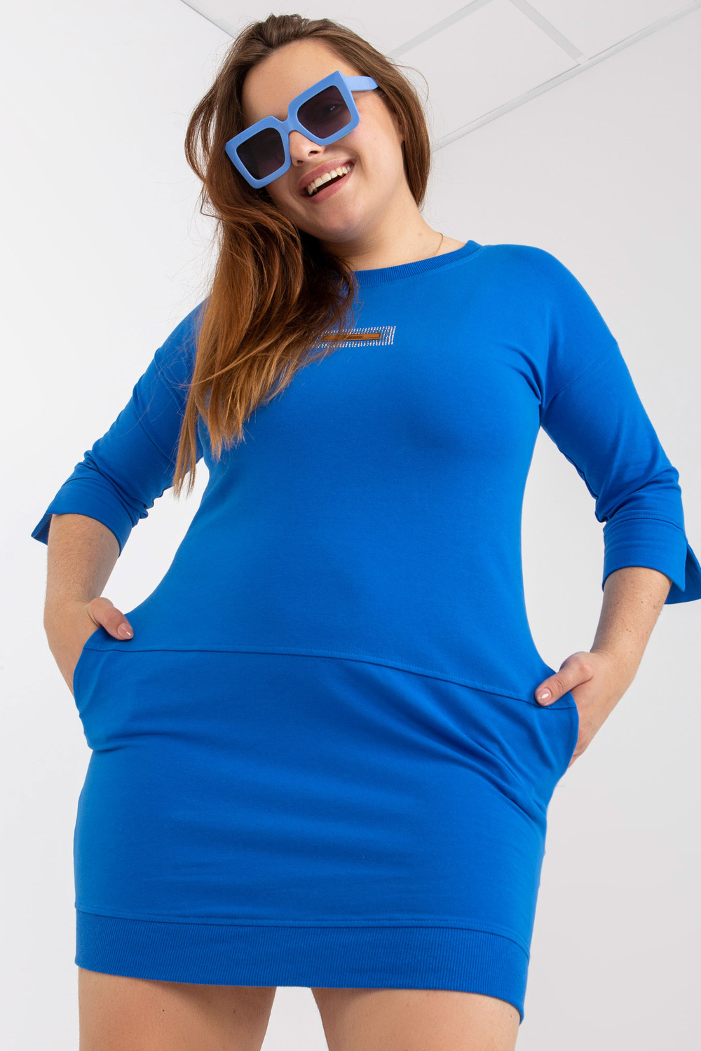 Tumši zila pieguļoša liela izmēra kleita no kokvilnas . materiāla sastāvs: 90% kokvilna, 10% elastāns mazgāšanas metode: mazgāšana veļasmašīnā 30°C Produkta kods: RV-SK-7612.75P dominējošais raksts: apdruka Stils: ikdienišķs gadījums: ikdienišķs, ārpus pilsētas, pastaigāties Modelis ir