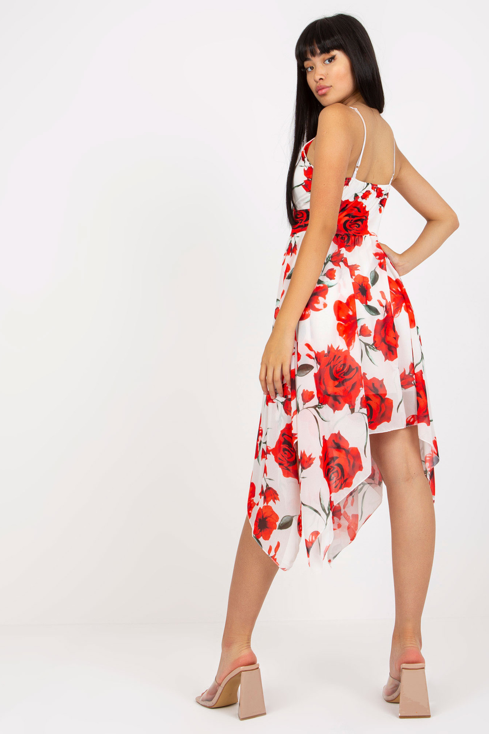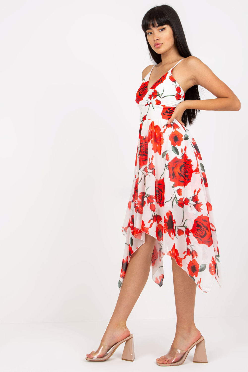 Balta un sarkana ziedu kleita ar izgriezumu .