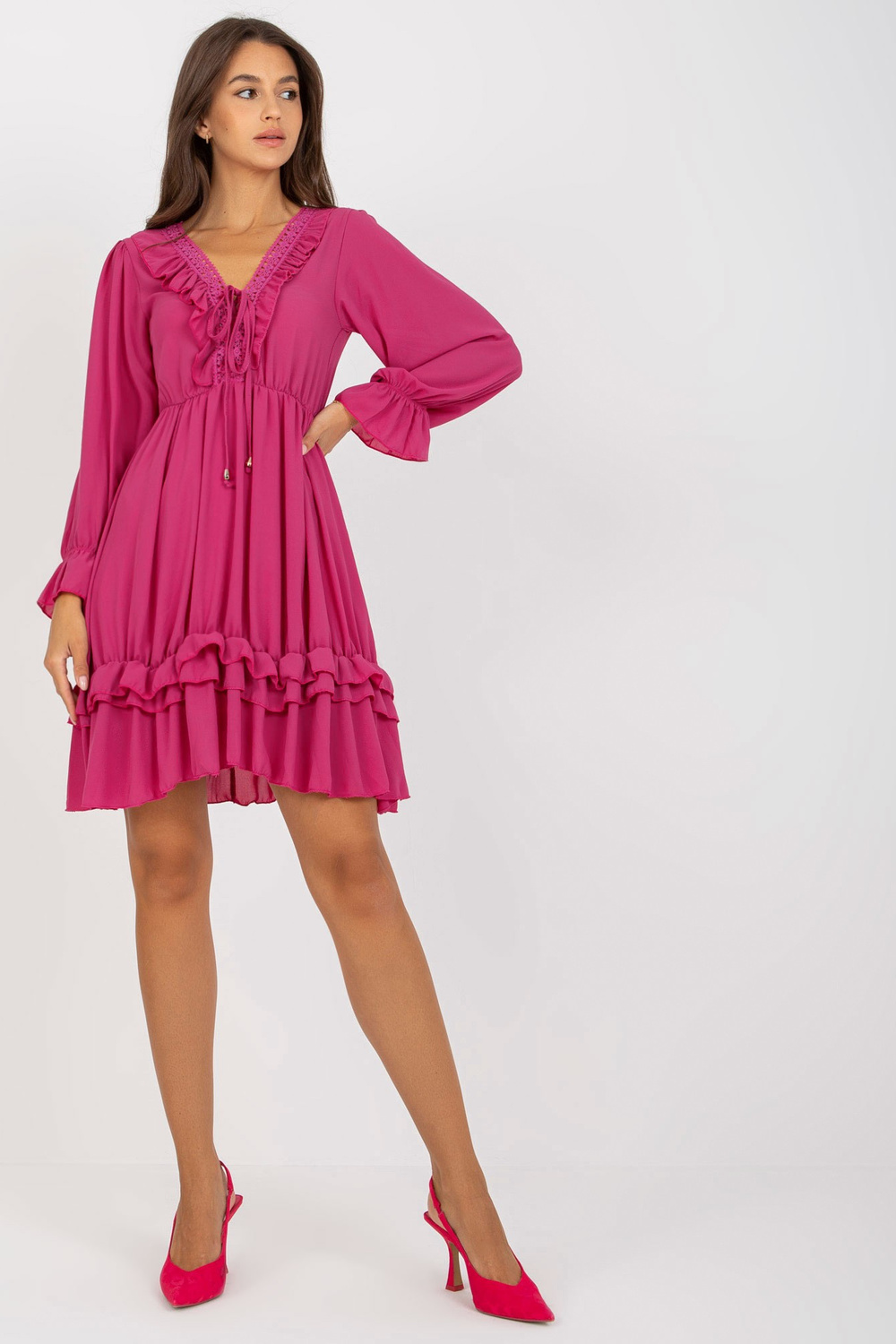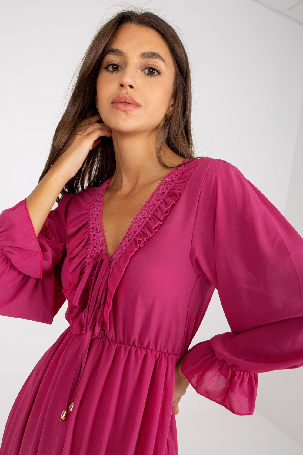 Fuchsiaboho kleita ar volāniem un mezglotu OCH BELLA kakla izgriezumu .