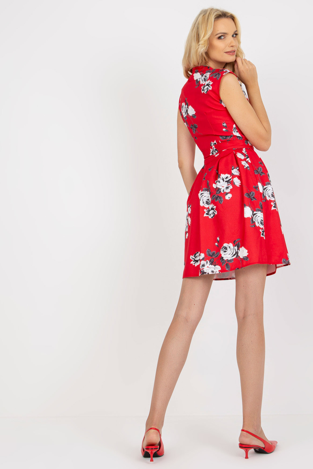 Rotes Wickelcocktailkleid mit Blumen. Produkta kods: LK-SK-508939.21 Dominantes Muster: Blumen Stil: Elegant Anlass: für die Arbeit, für ein Date, für einen Abend, für eine Party Model Größe 36. Maße des Models: Höhe 180 cm, Büste 6 cm3 , Hüft