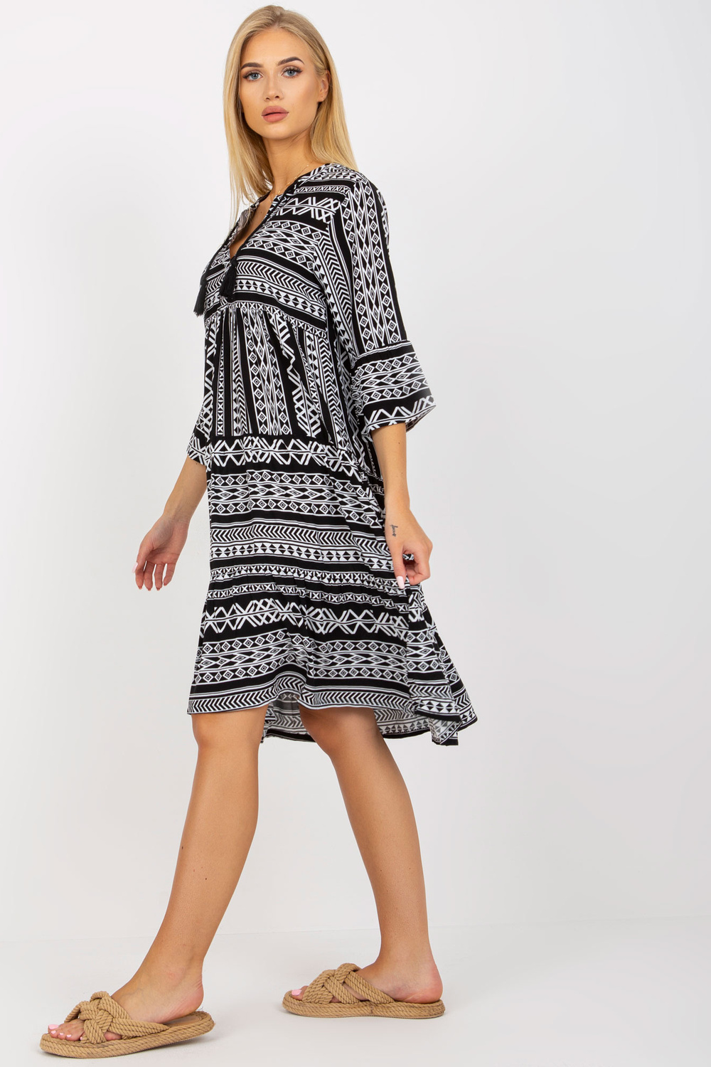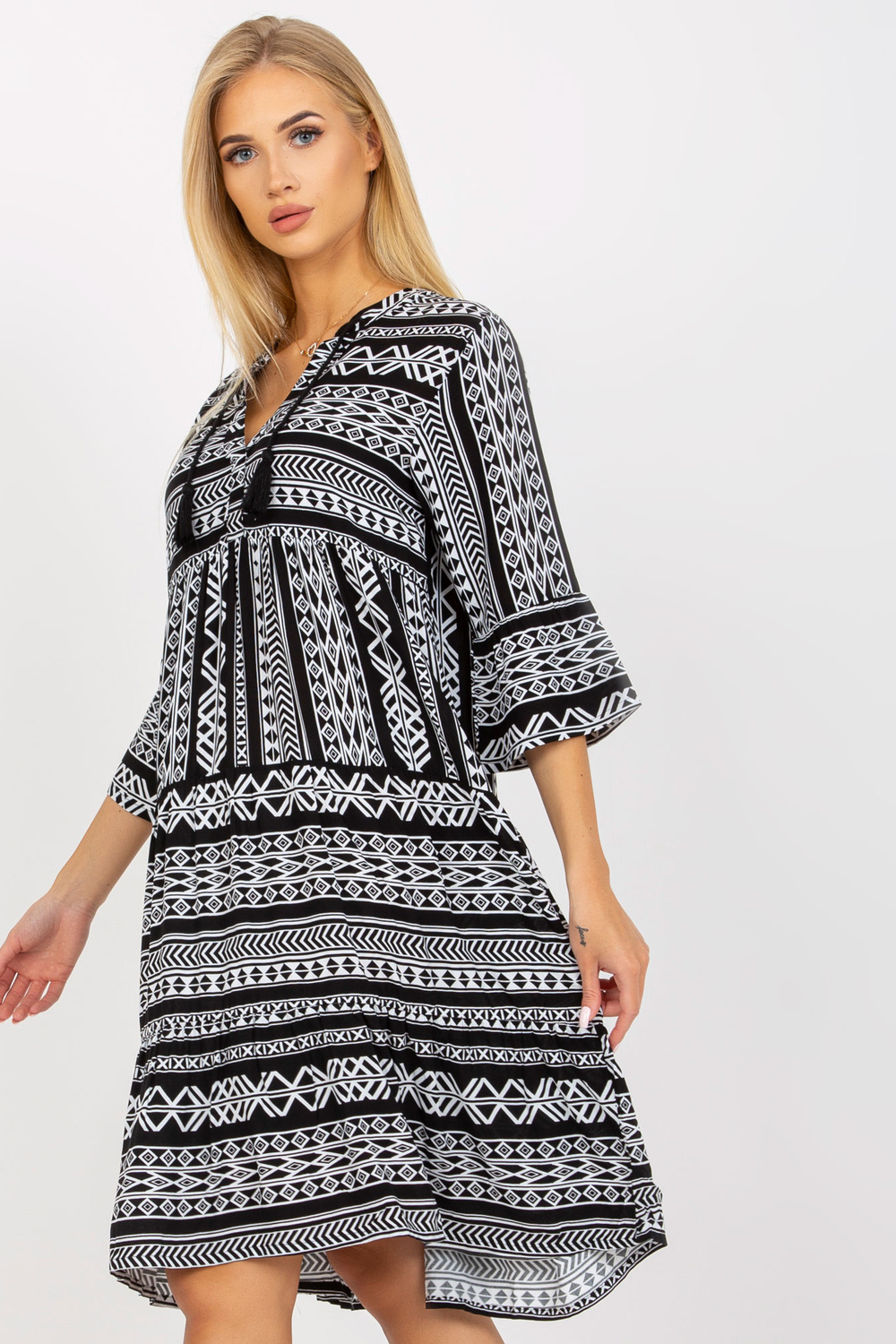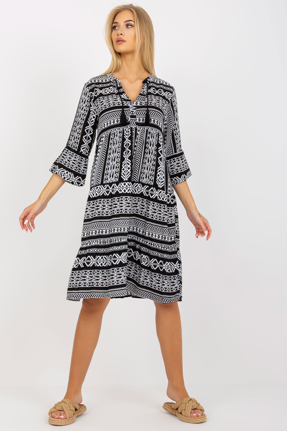 Melna raksta kleita ar volāniem un 3/4 piedurknēm. materiāla sastāvs: 100% viskozes mazgāšanas metode: veļas mašīna 30°C