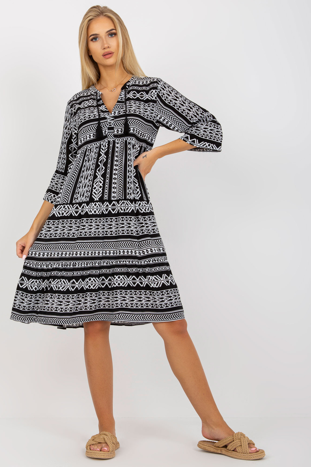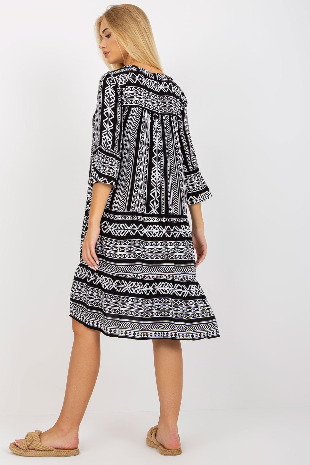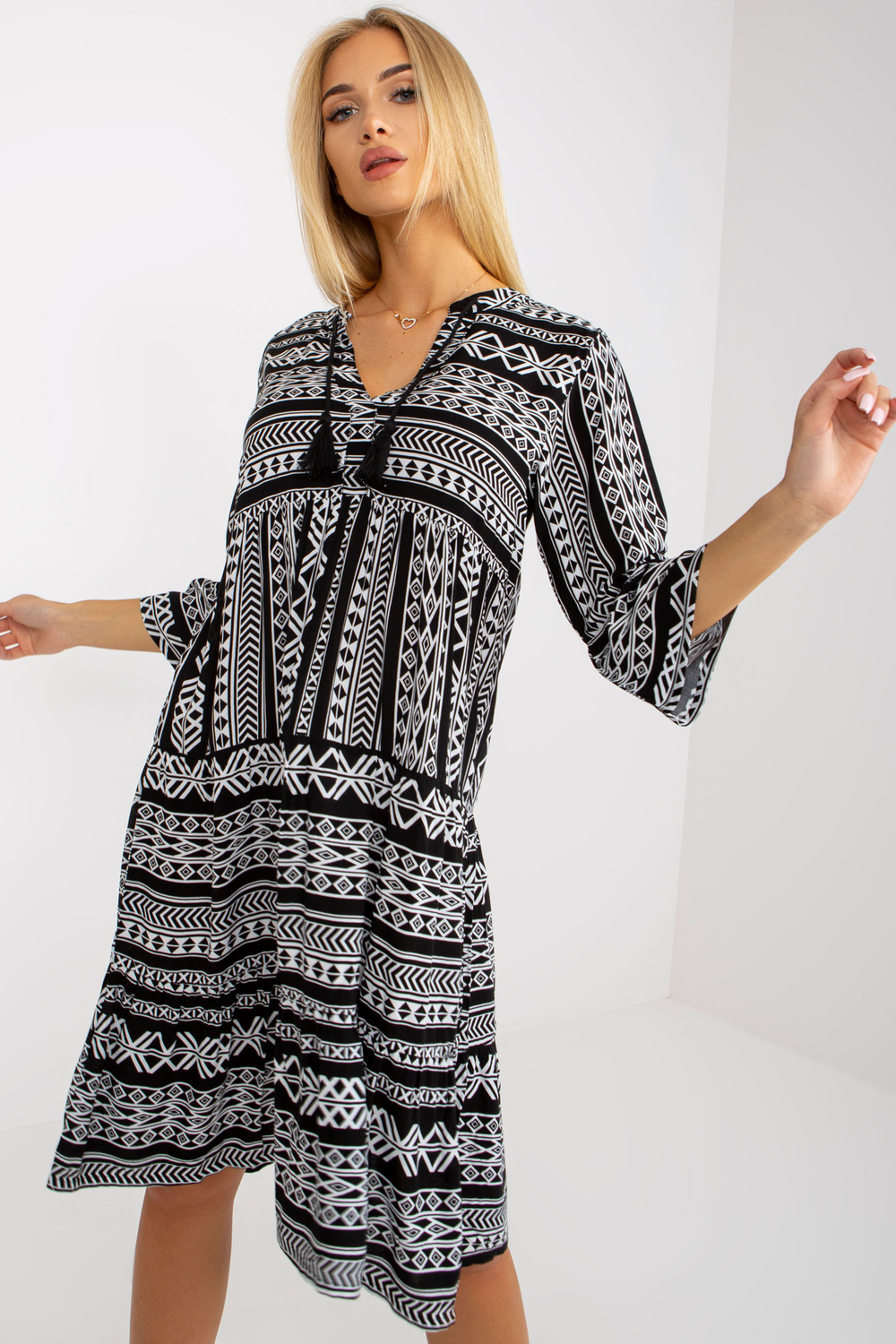 Melna raksta kleita ar volāniem un 3/4 piedurknēm. materiāla sastāvs: 100% viskozes mazgāšanas metode: veļas mašīna 30°C
