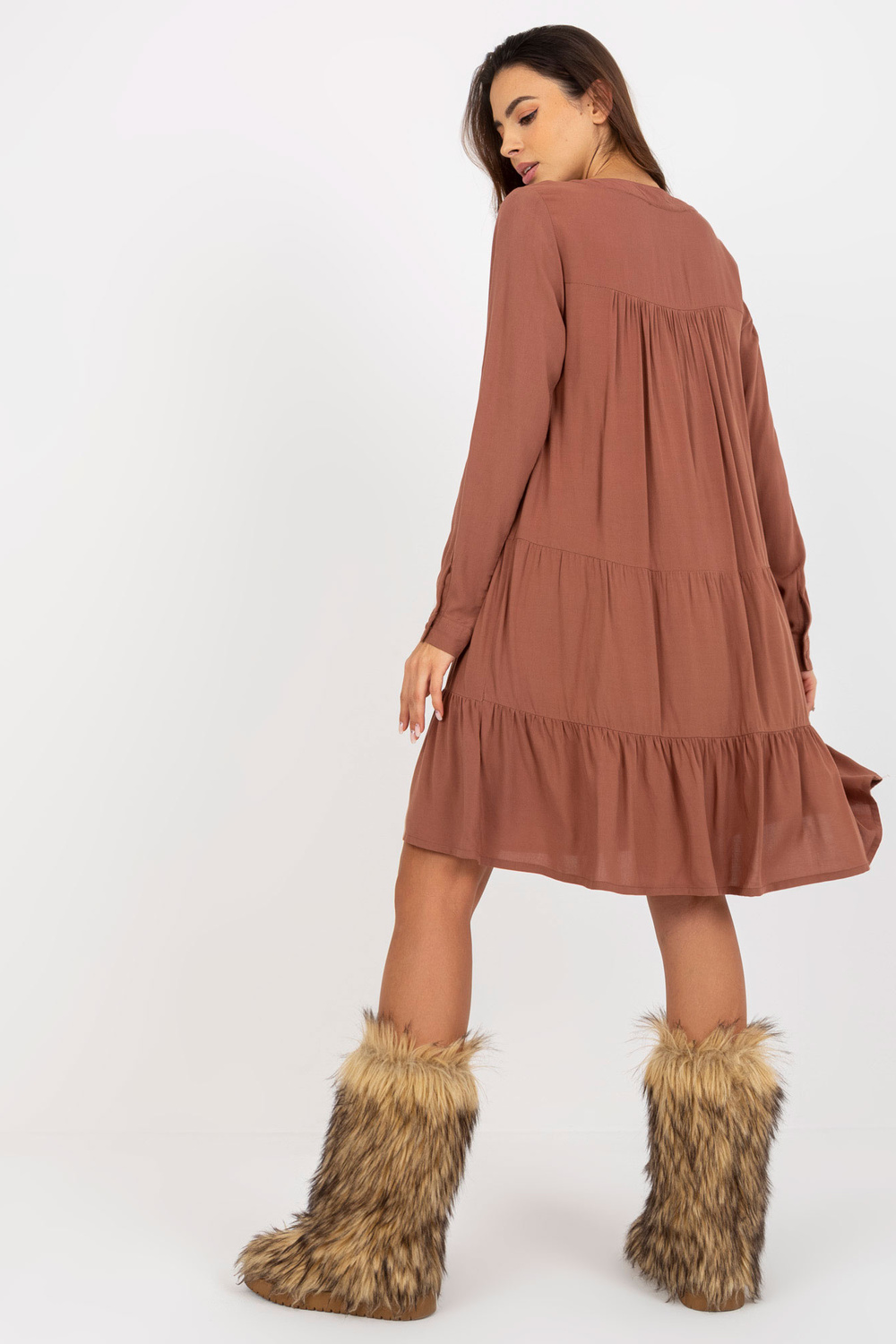 Brązowa boho sukienka z falbaną i dekoltem V SUBLEVEL . skład materiału : 100% wiskoza sposób prania : pranie w pralce w 30°C