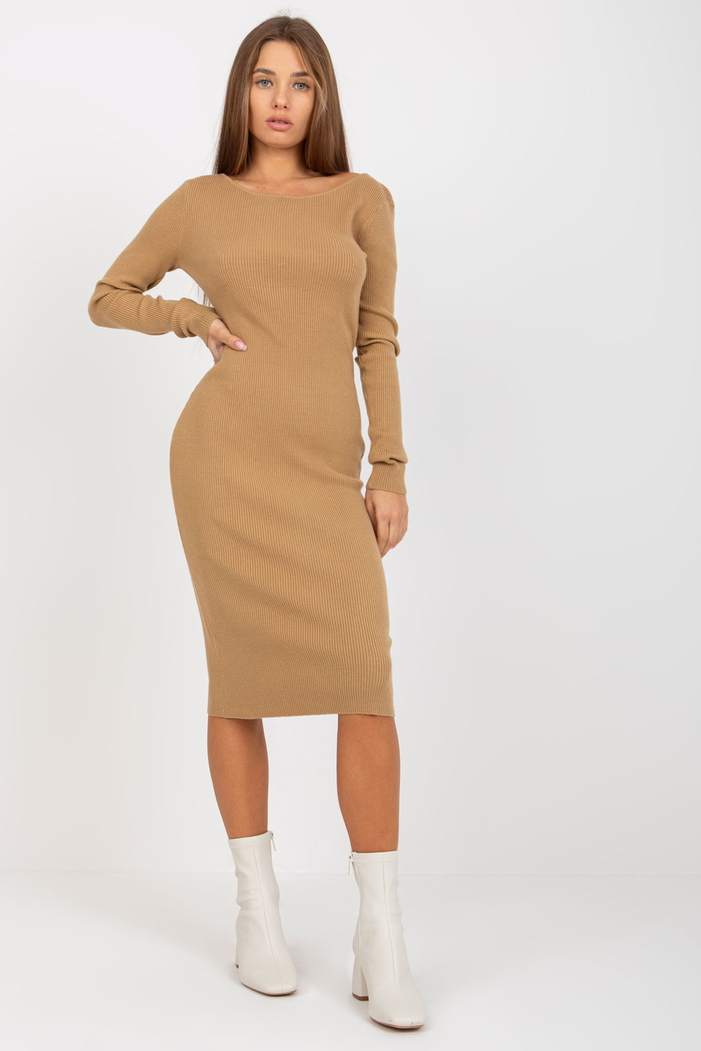 Kamieļa trikotāžas kleita ar ķēdīti mugurā.