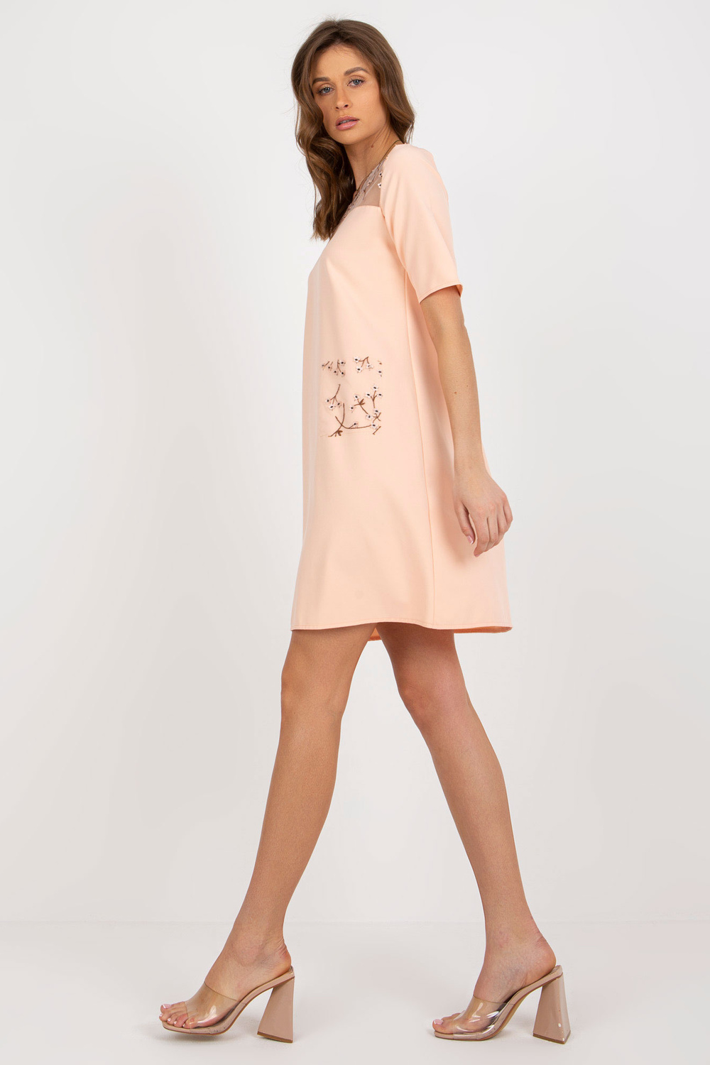 Vienkārša persiku kokteiļkleita ar kabatām.
