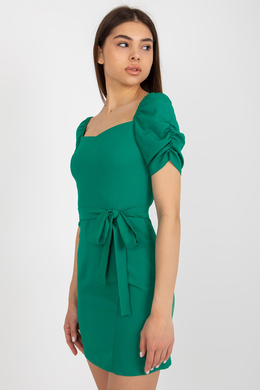 Tumši zaļa mini kokteiļkleita ar jostu.