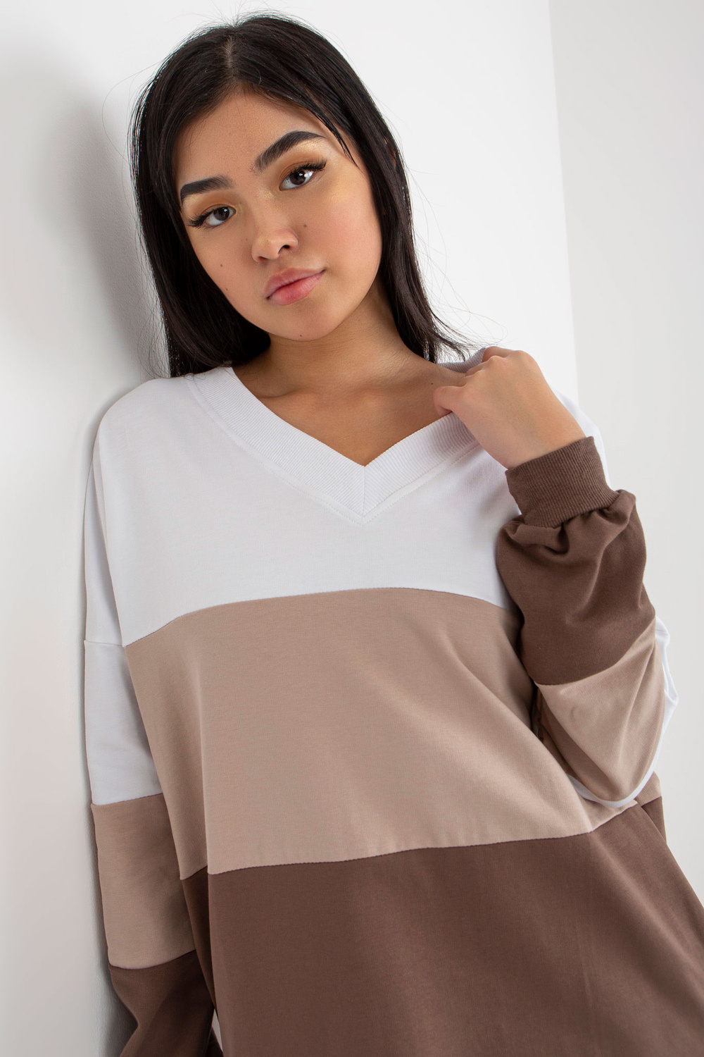 Balta un brūna pamata kleita ar V RUE PARIS kakla izgriezumu.