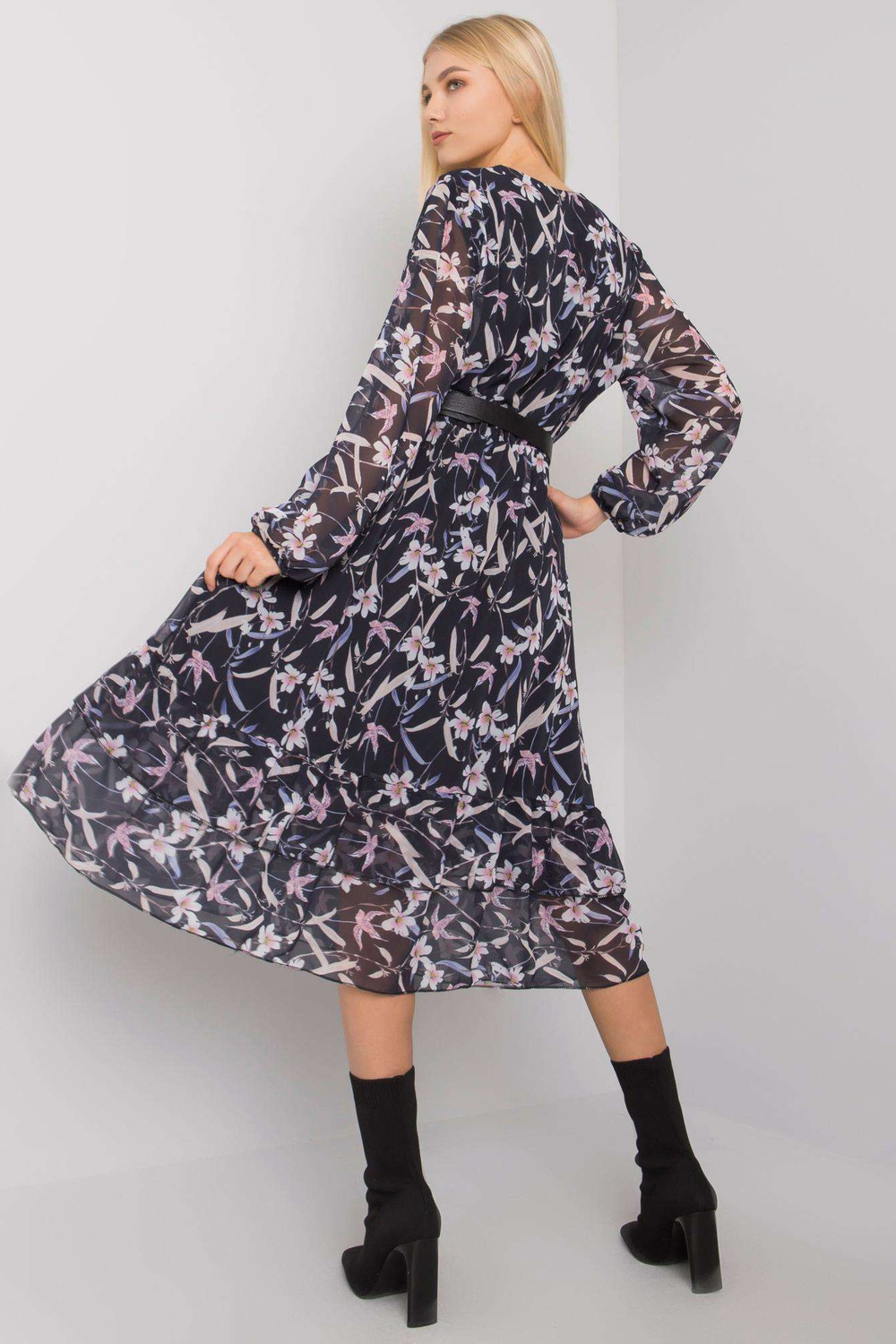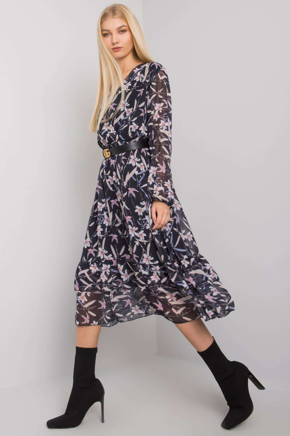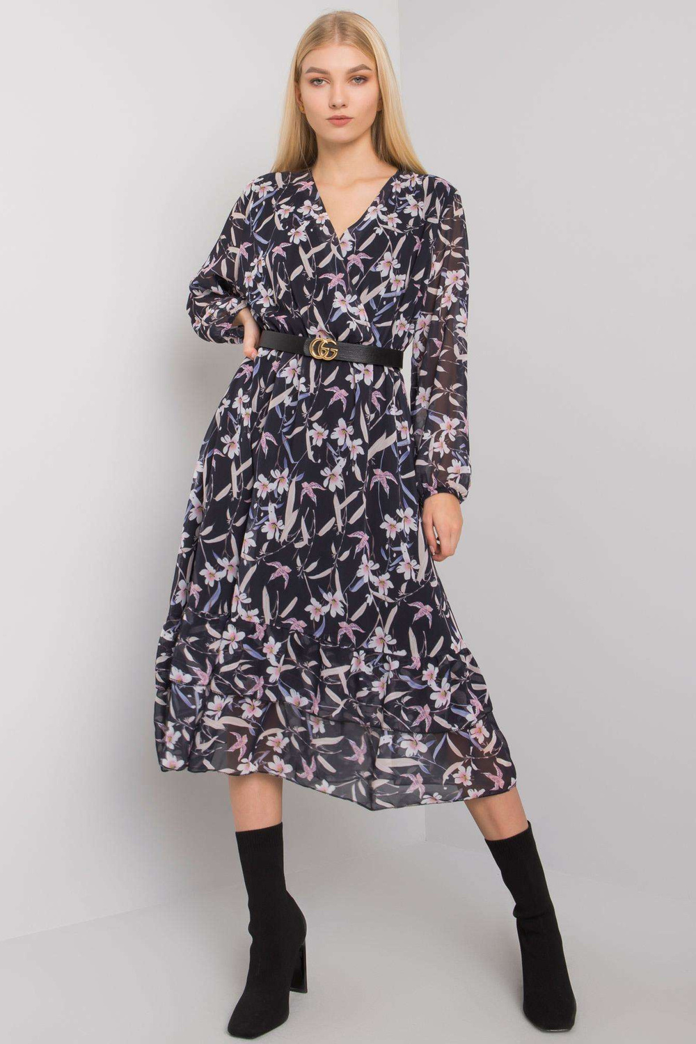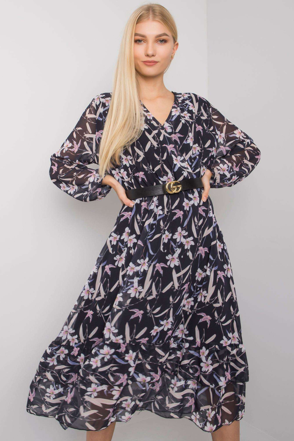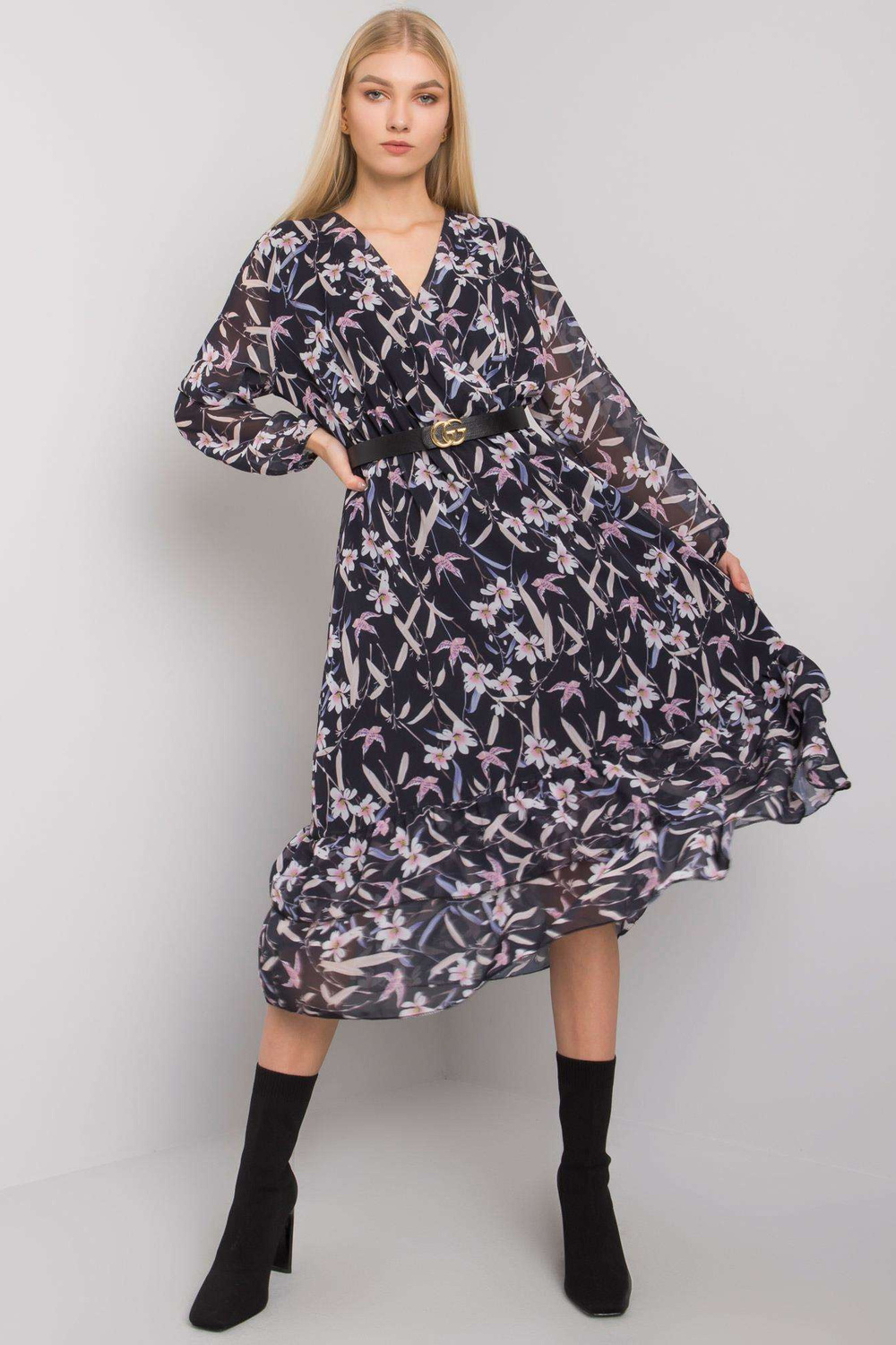 Tumši zila raksta sieviešu kleita ar volāniem .