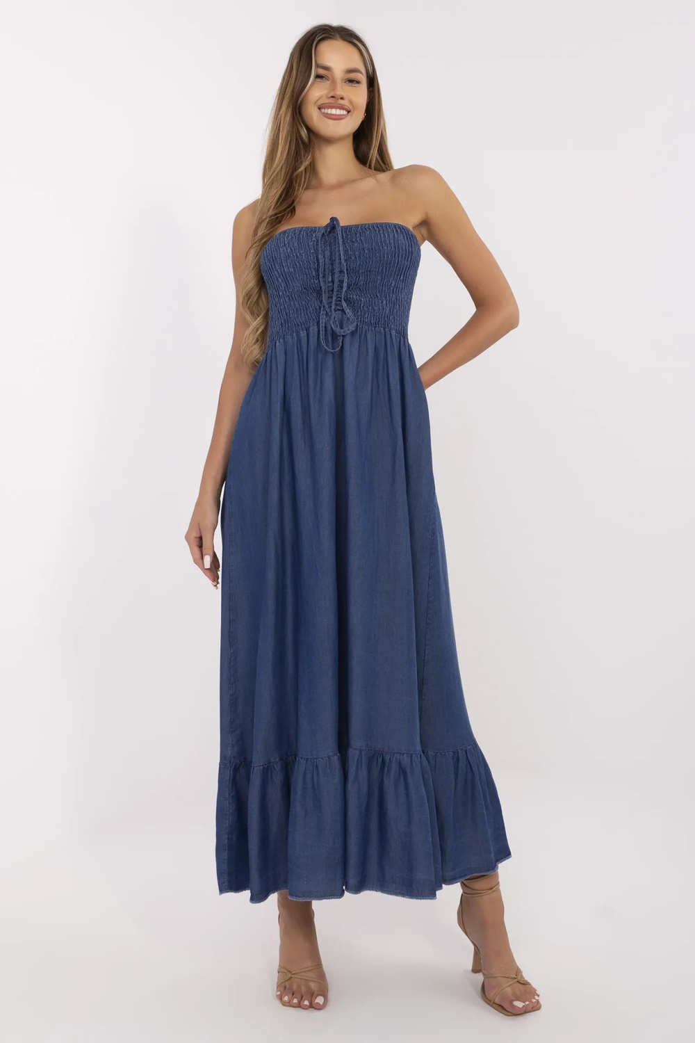 Modelis valkā vienu izmēru. Modeles izmēri: augums 176 cm, krūšu apkārtmērs 90 cm, vidukļa apkārtmērs 62 cm, gurnu apkārtmērs 94 cm.