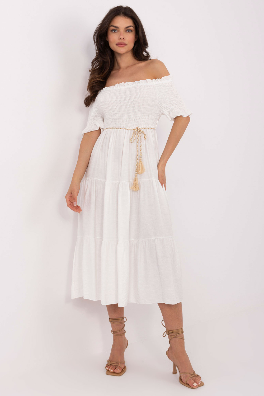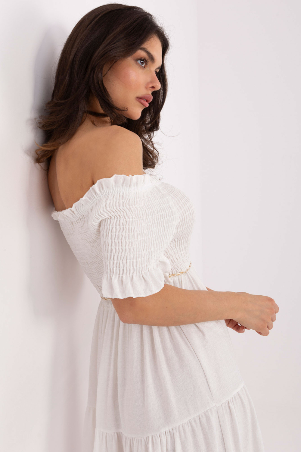 Modelis valkā vienu izmēru. Modeles izmēri: augums 173 cm, krūšu apkārtmērs 89 cm, vidukļa apkārtmērs 65 cm, gurnu apkārtmērs 91 cm.
