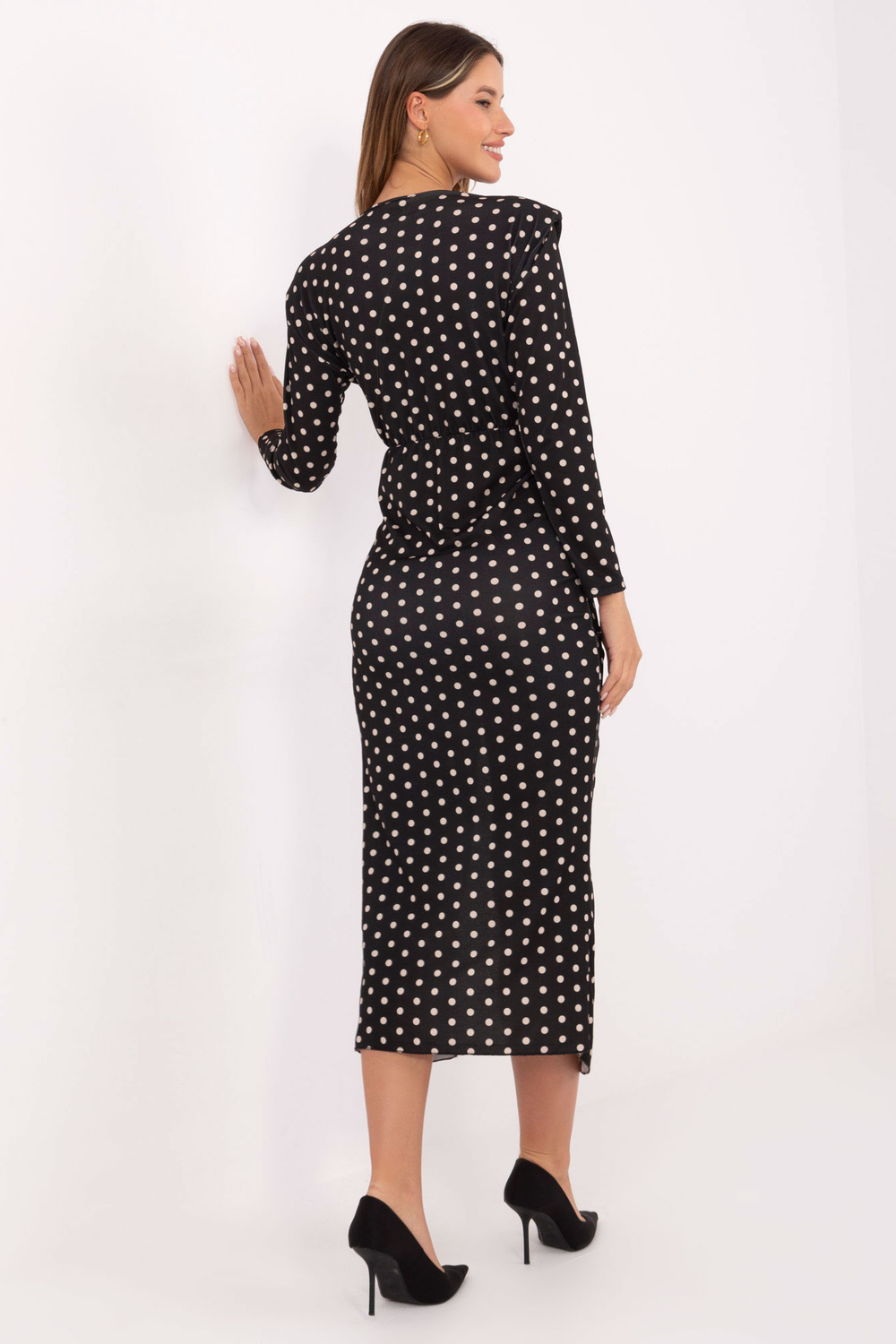 Modelis valkā viena izmēra apģērbu. Modeļa izmēri: augums 176 cm, krūtis 90 cm, viduklis 62 cm, gurni 94 cm.