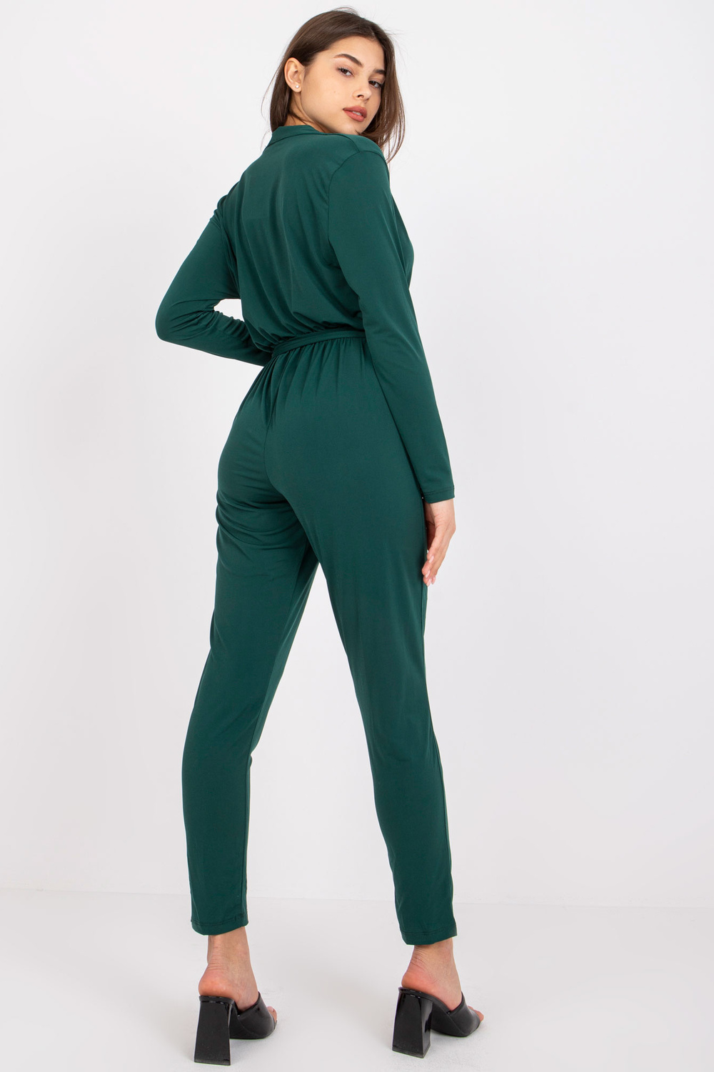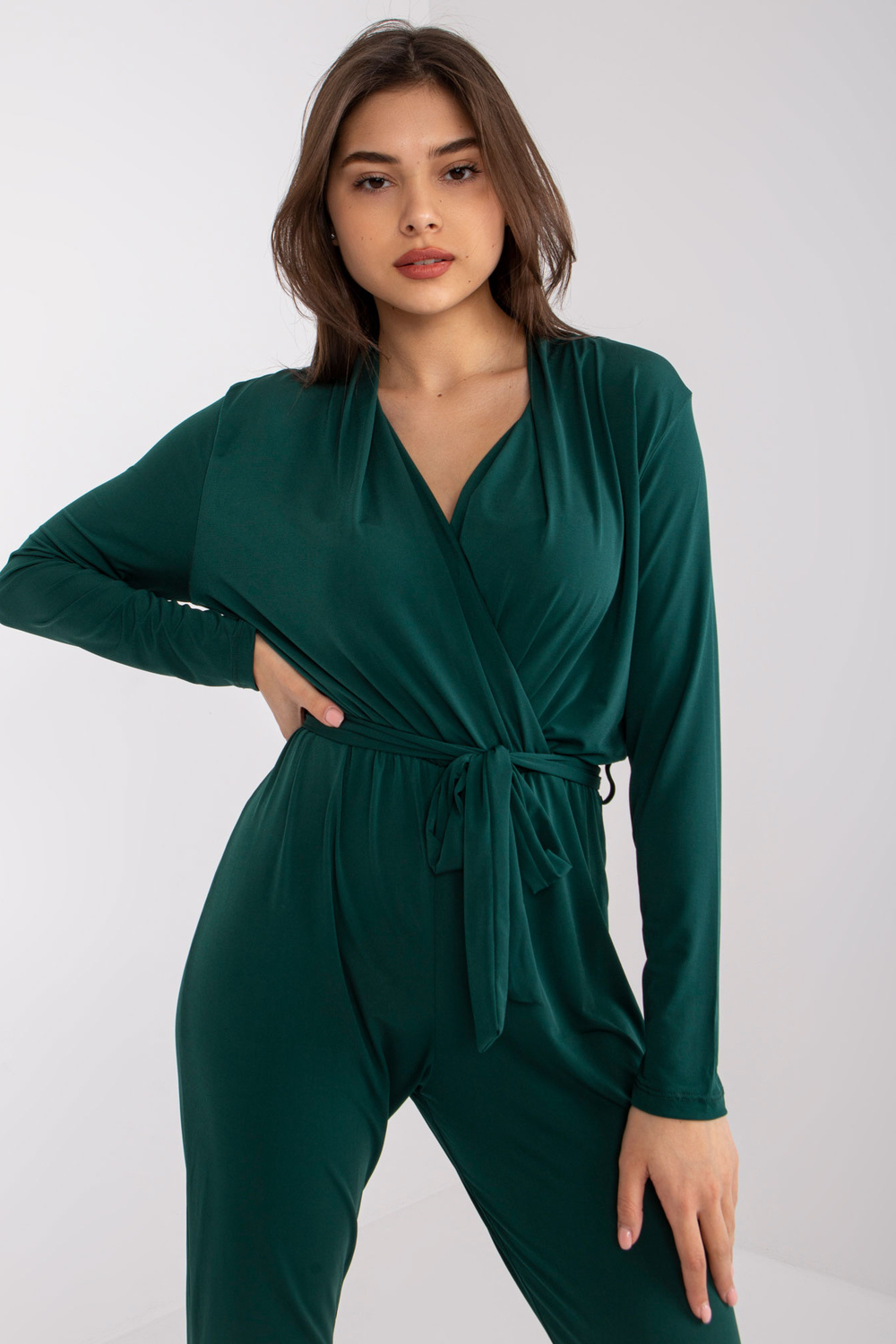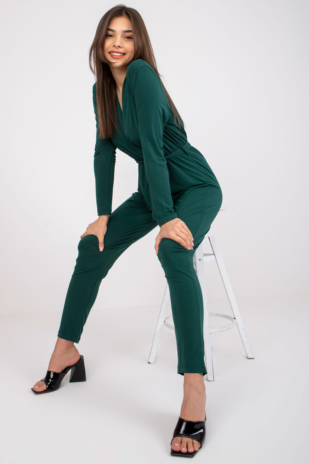 Tumši zaļš kombinezons ar serafini aploksnes kakla izgriezumu.