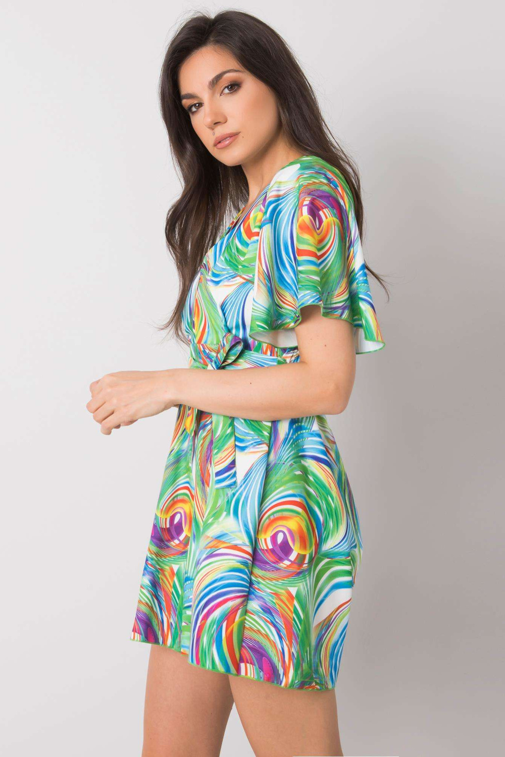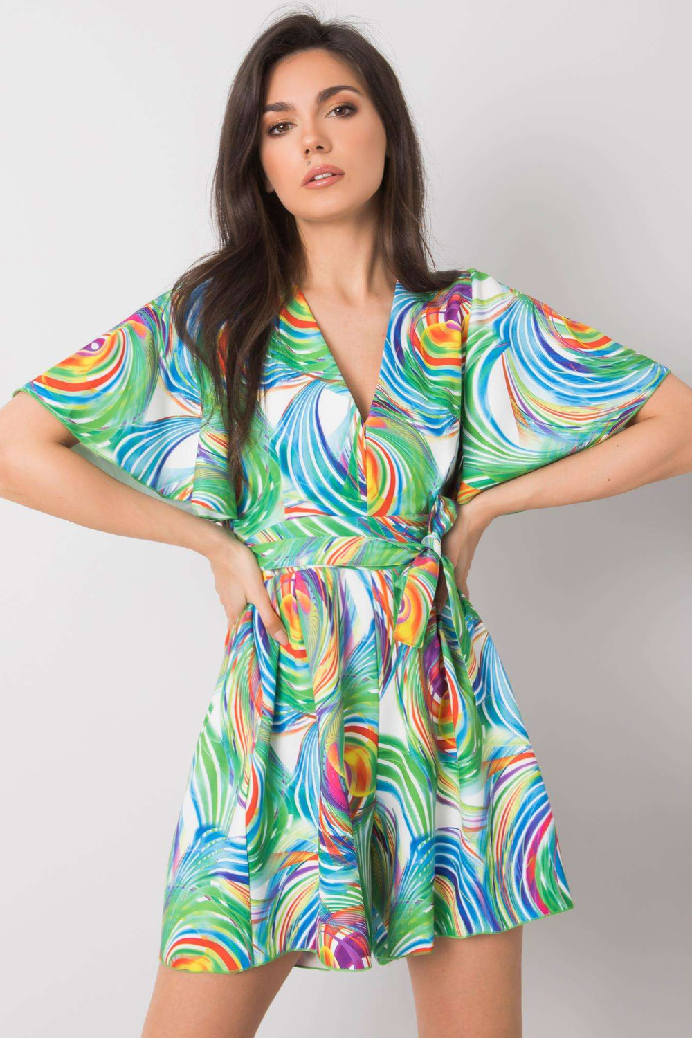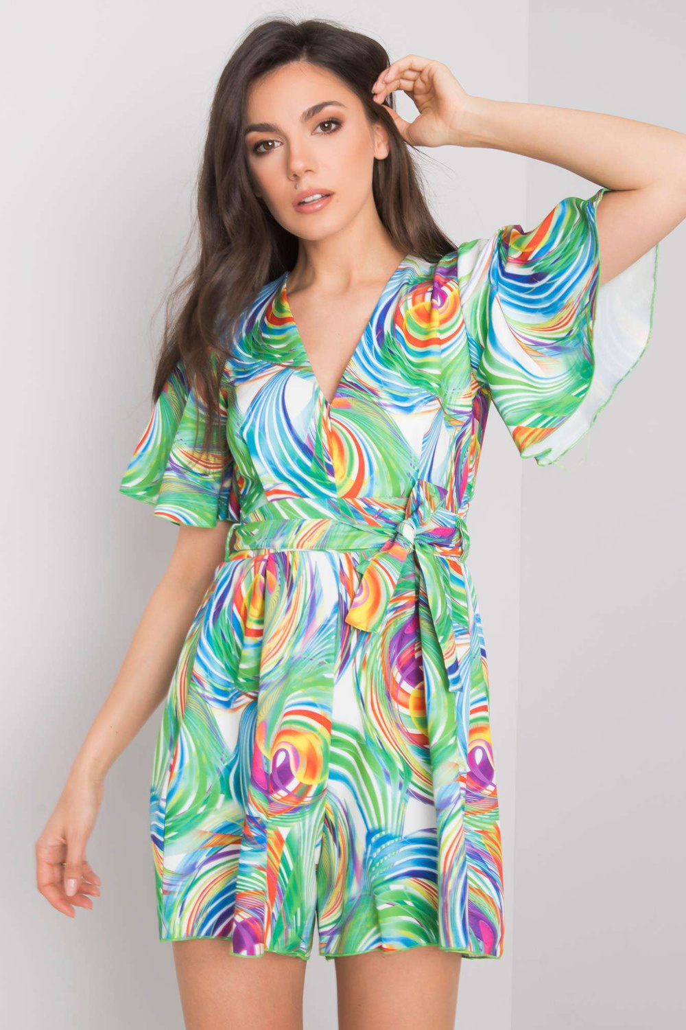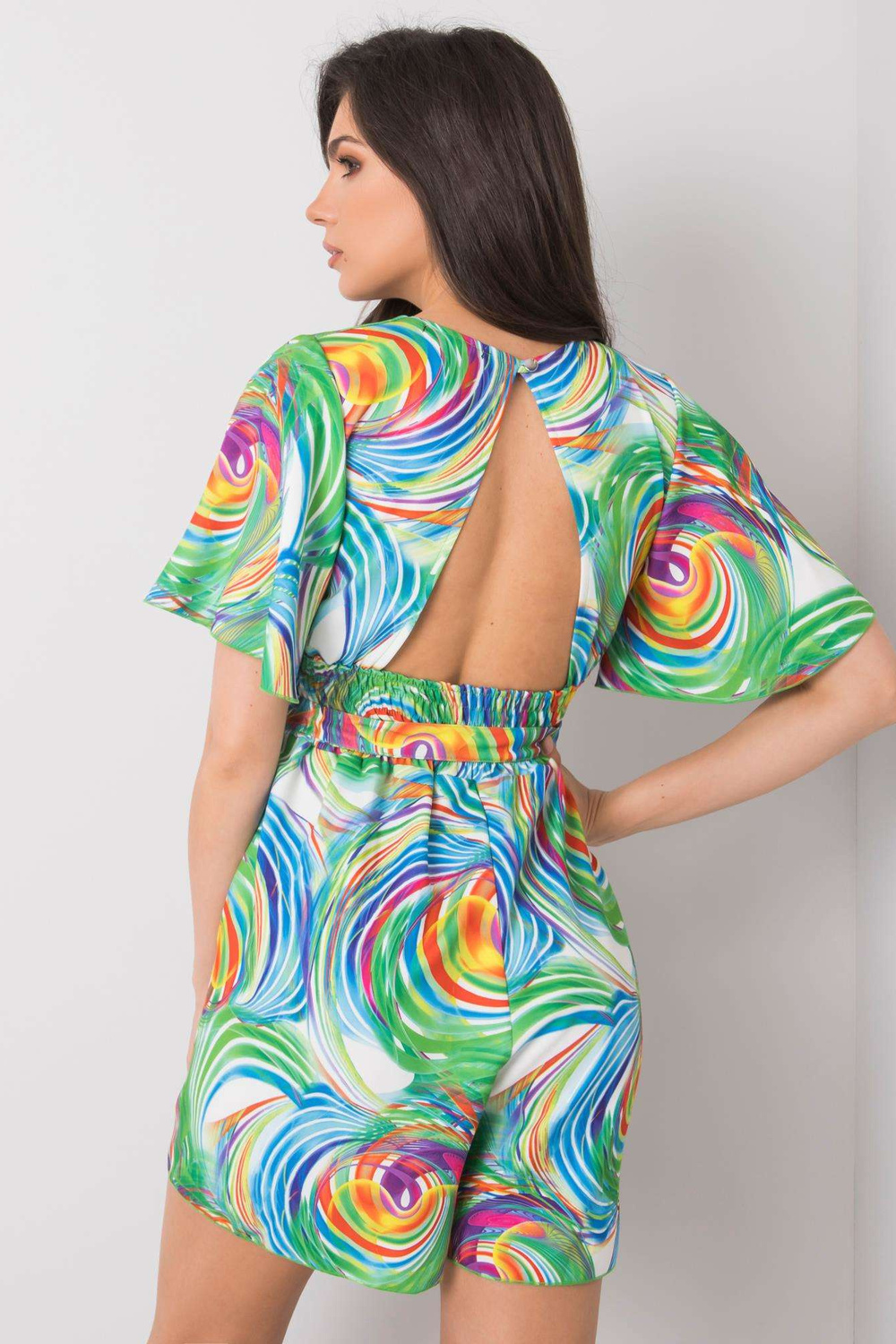Teodora RUE PARIS balts kombinezons ar krāsainiem rakstiem. Aksesuāri: josta, jostasvietā elastīga lente materiālssastāvs: poliesters, viskoze mazgāšanas metode: mazgājams veļasmašīnā 40°C. Modelis valkā S/M izmēru. Modeļa izmēri: augums 174 cm, krūtis 8