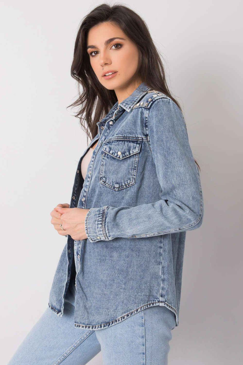 Annekablu džinsa krekls. materiāla sastāvs: 100% kokvilna mazgāšanas metode: mazgāšana veļasmašīnā 30°C Modelis valkā S izmēru. Modeļa izmēri: augstums 175 cm, krūtis 85 cm, viduklis 65 cm, gurni 89 cm. SizeS krekla izmēri, mērīti plakanā formā: paduses platums - 44
