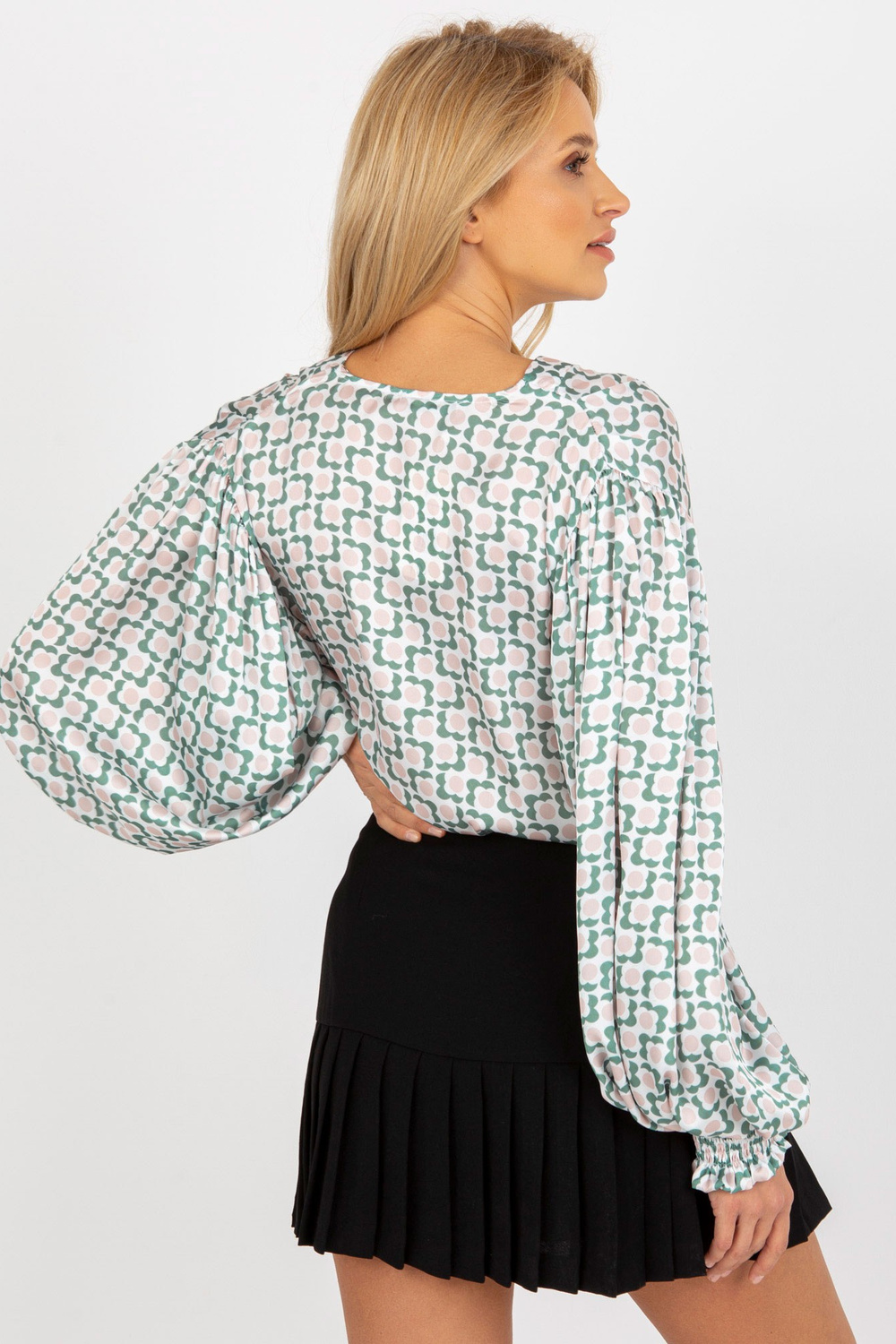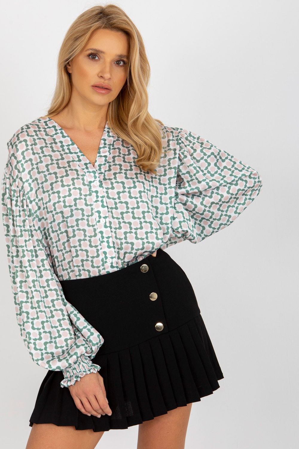 Balti bēšs krekls ar apdruku un sulīgu piedurkni.