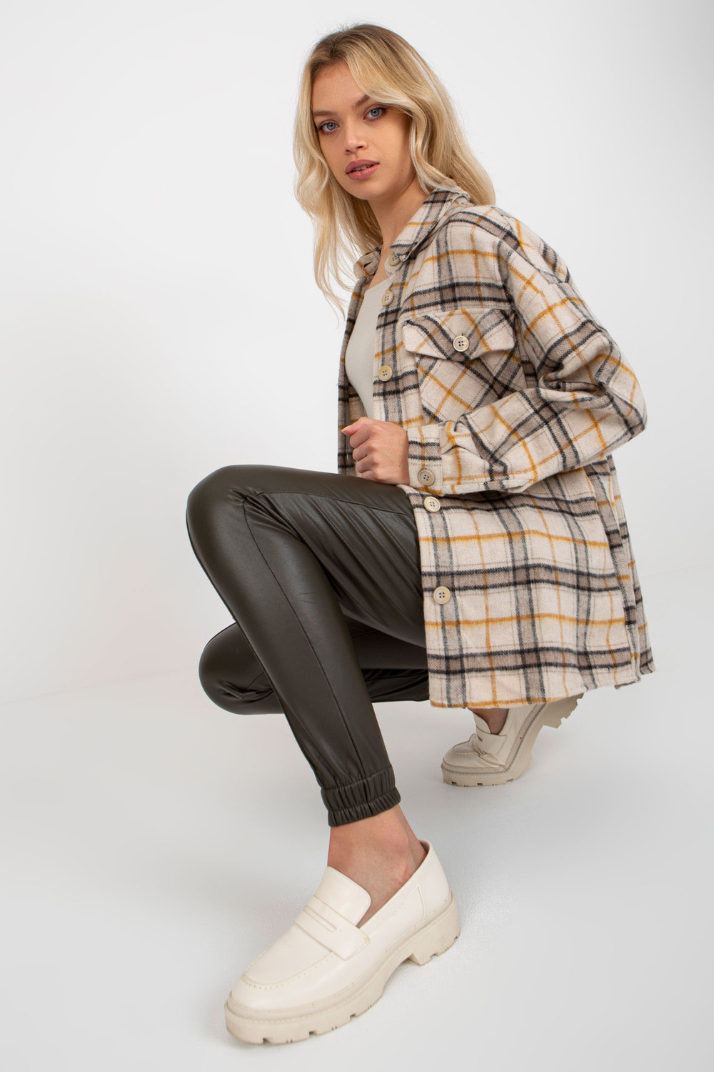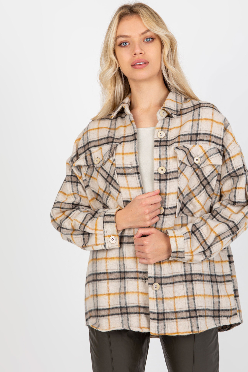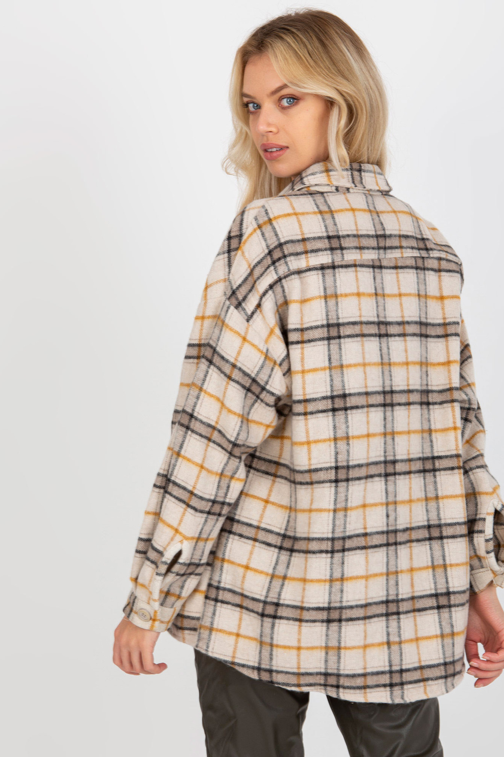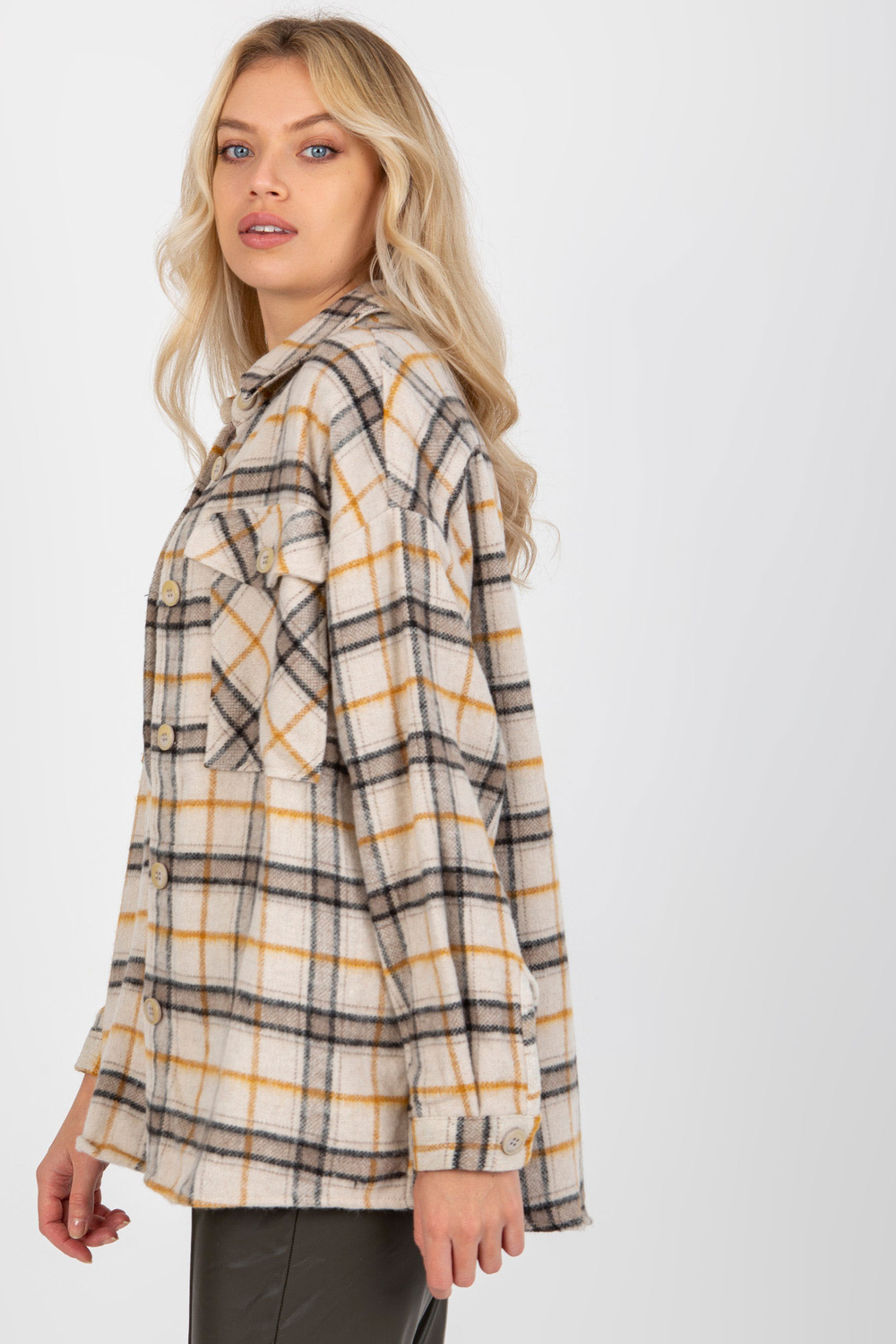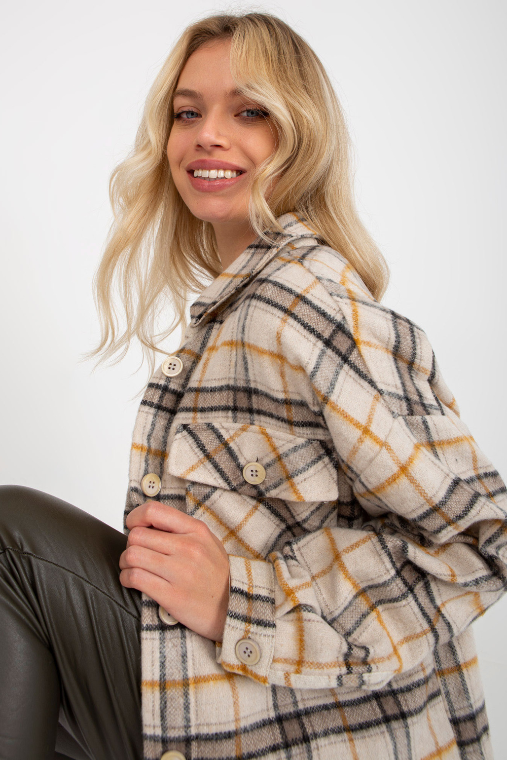 Bēšs sieviešu silts rūtains krekls ar kabatām .