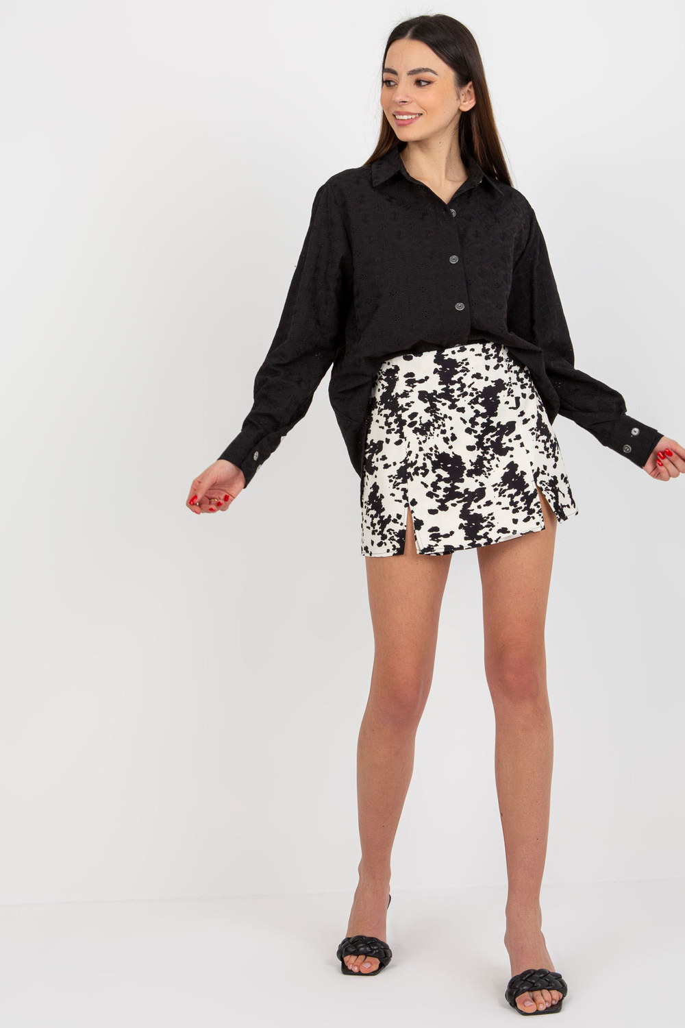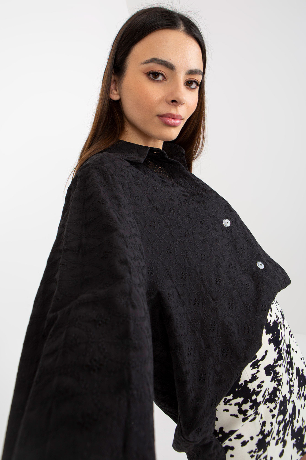 Melns ažūra liela izmēra krekls ar apkakli.