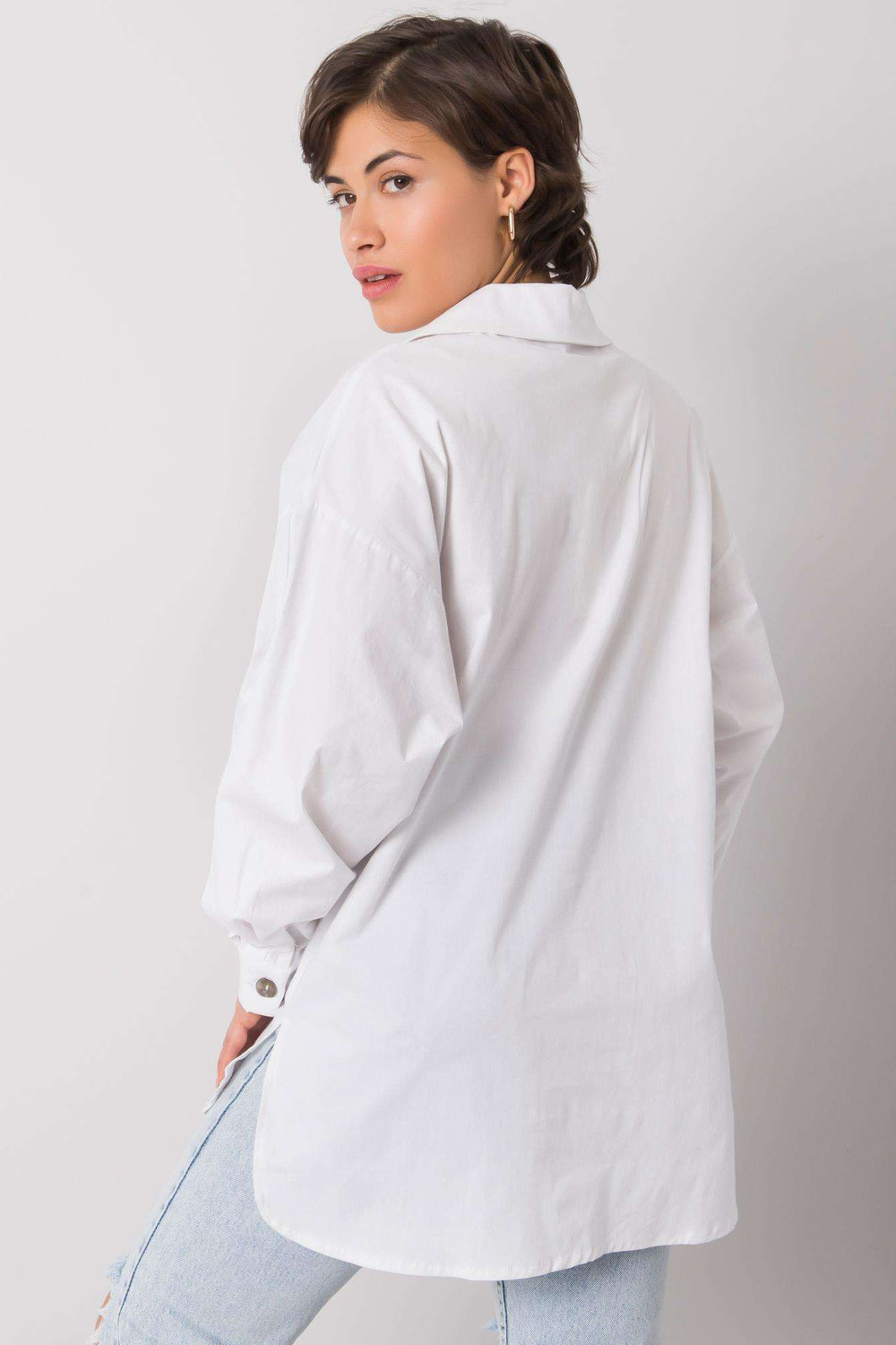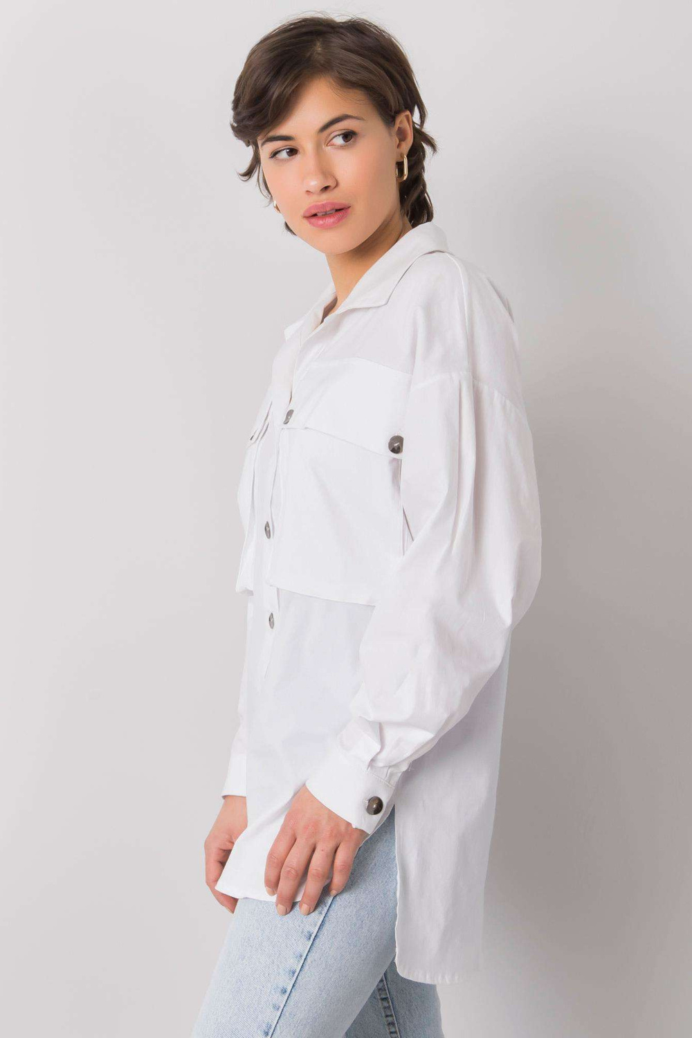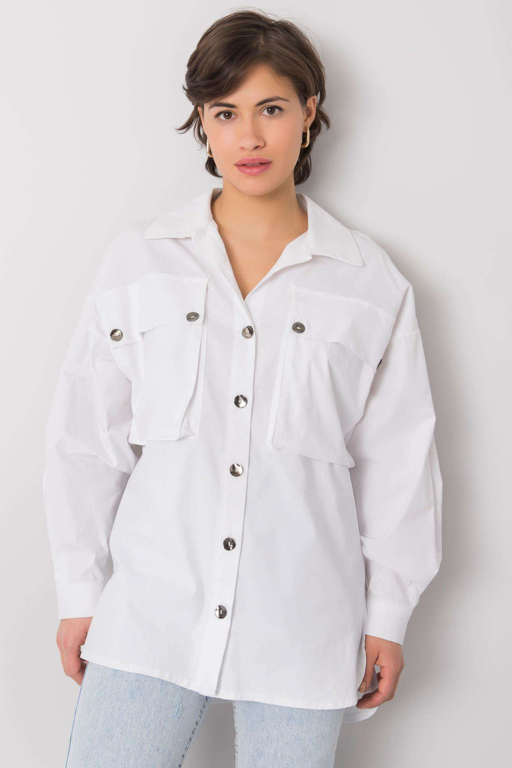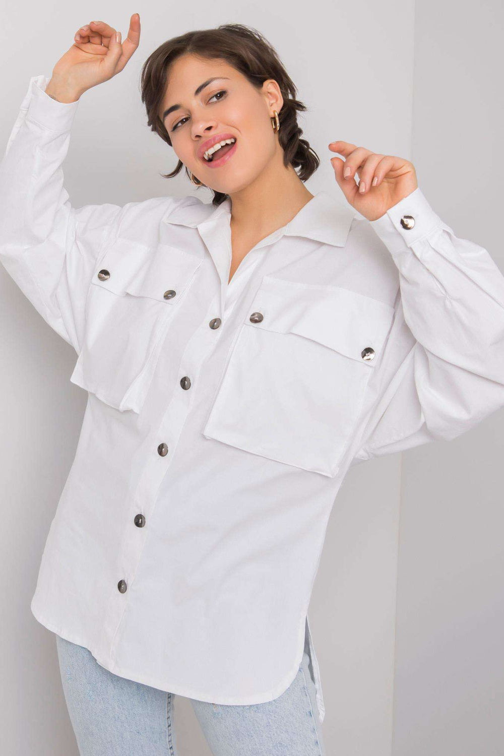 Balts krekls ar kabatām Elora RUE PARIS. materiālssastāvs: 100% kokvilna mazgāšanas metode: veļas mašīna 30°C Modelis valkā S izmēru. Modeļa izmēri: augums 160 cm, krūtis 87 cm, viduklis 59 cm, gurni 89 cm. Blūzes izmēri S izmērs