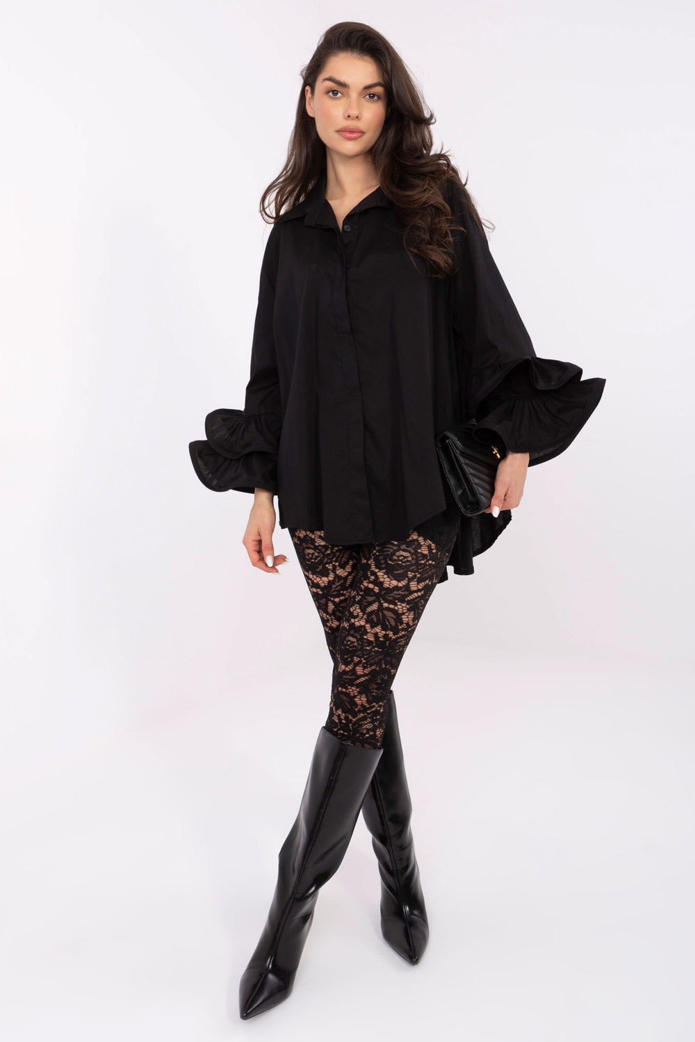 Modelis valkā viens izmērs apģērbu. Modeļa izmēri: augums 173 cm, krūtis 85 cm, viduklis 62 cm, gurni 95 cm.