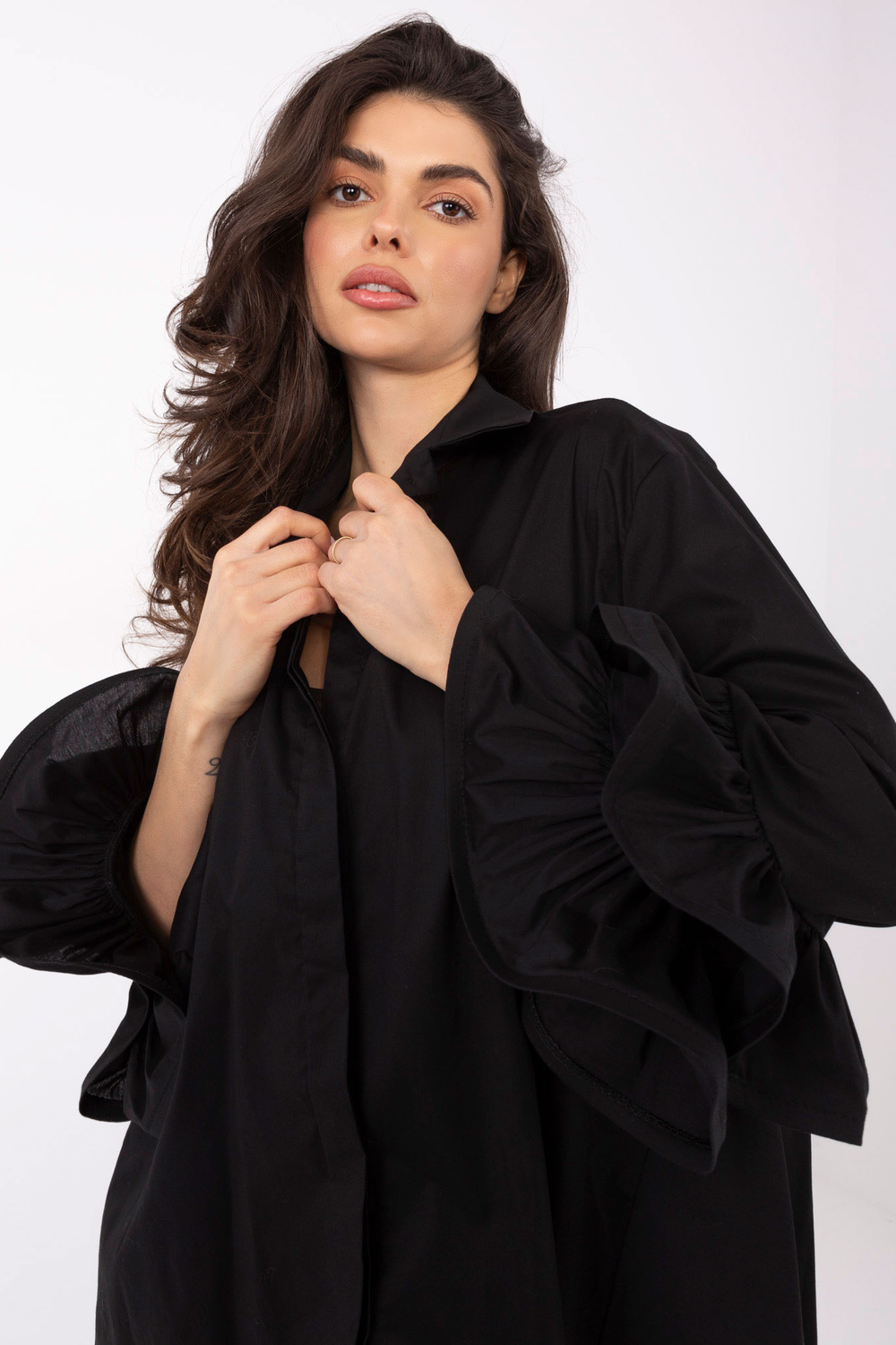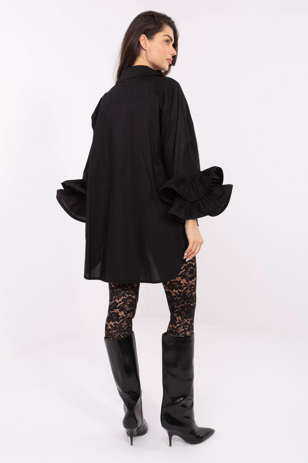 Viens izmērs krekla izmēri, mērīti guļus: platums zem padusēm – 67 cm, kopējais garums – 70 cm (priekšējā daļa), kopējais garums – 84 cm (aizmugurējā daļa), platums gurnos – 85 cm, piedurknes garums – 50 cm.