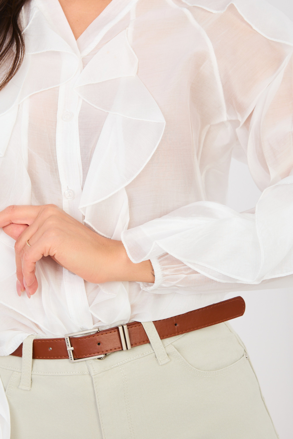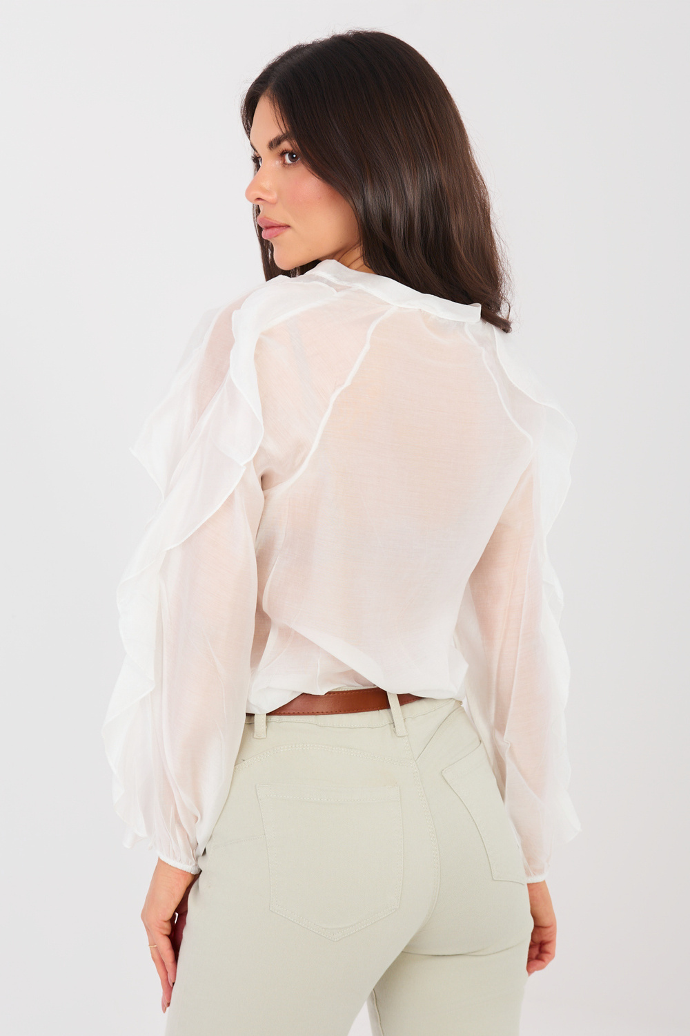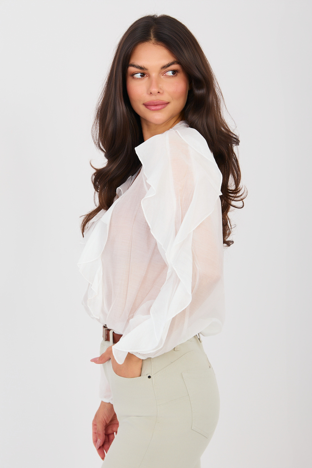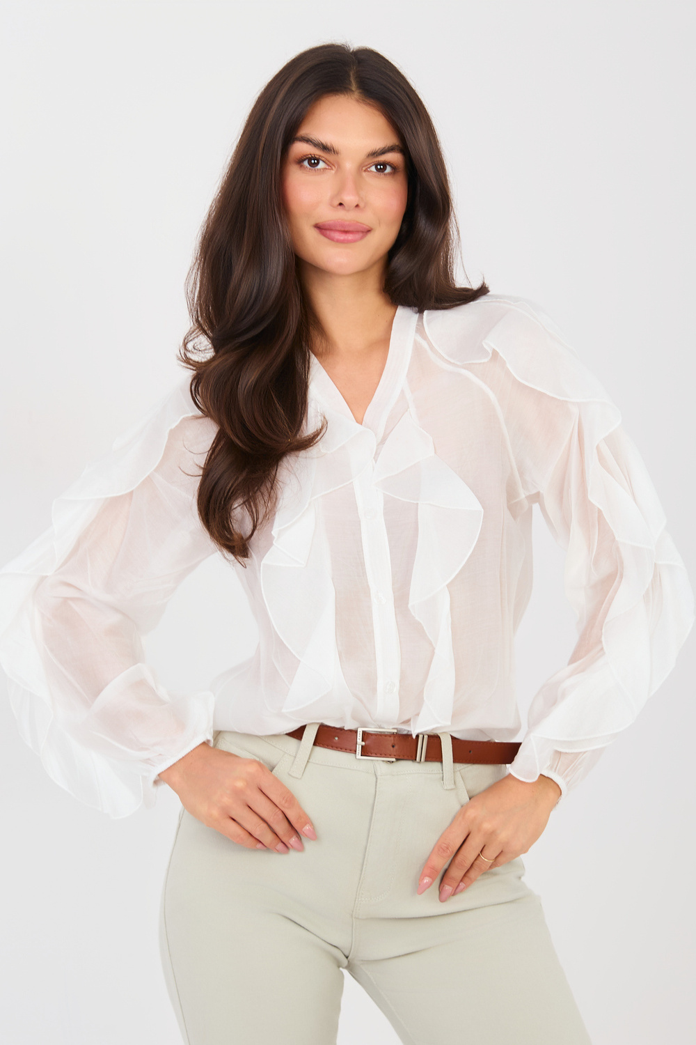 Modelis valkā viena izmēra apģērbu. Modeļa izmēri: augums 173 cm, krūtis 85 cm, viduklis 62 cm, gurni 95 cm.