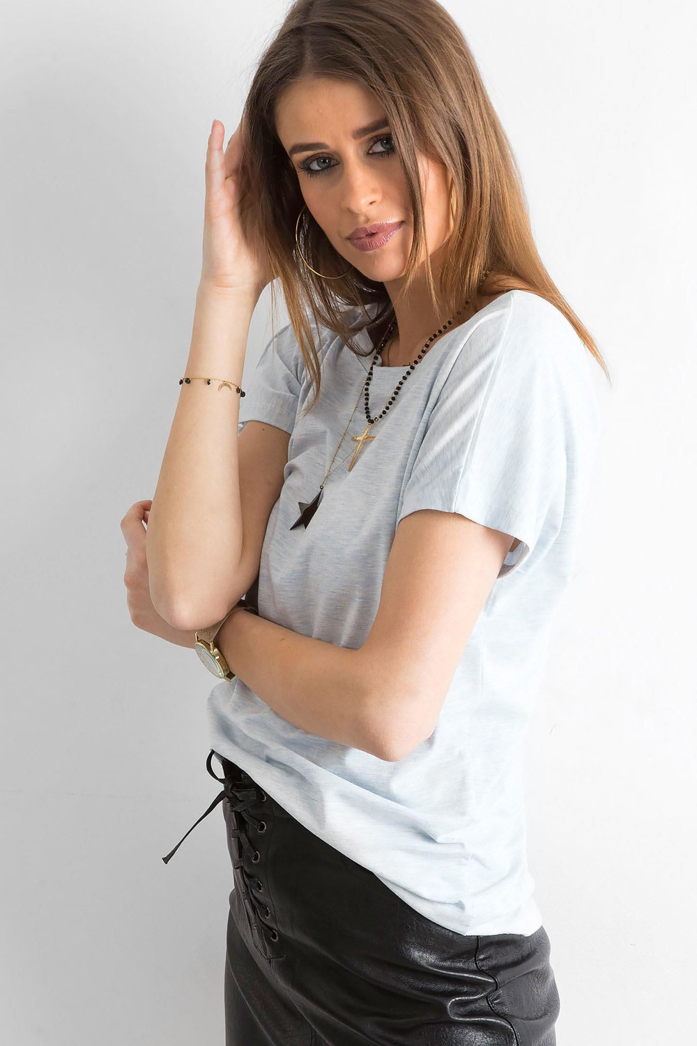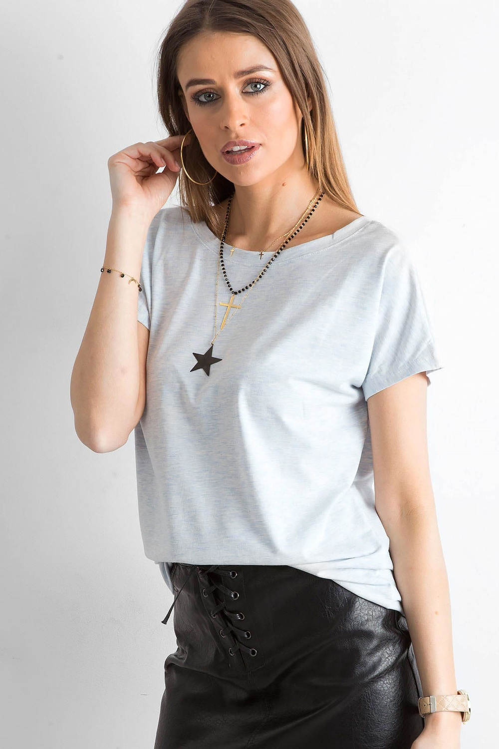 Gaiši zils Fire t-krekls . Sieviešu pamata T-krekli sieviešu vidū nav bijuši tik populāri kā mūsdienās. Kas viņus pēkšņi padarīja tik pieprasītus? Tas ir ļoti viegli. Tie ir ļoti universāli gludā un vienkrāsainā materiāla dēļ, tāpēc tos var veidot visdažādākajos veidos. Šis pamata t-krekls ir izgatavots no mīksta augstas kvalitātes materiālu maisījuma, no kuriem lielākā daļa ir patīkami pieskarties un ir gaisīga kokvilna. Tas padara to lieliski piemērotu gandrīz katrai gada dienai, jo lieliski darbojas ne tikai vasarā, bet arī citos gada mēnešos. Modīgi piegriezts kakla izgriezums priekšpusē un papildus dziļš kakla izgriezums aizmugurē nodrošina ērtu lietošanu un ārkārtīgi sievišķīgu izskatu. Šāds pamata T-krekls pavērs daudzas stila iespējas, padarot katru tērpu atšķirīgu. Valkājiet to ar sporta apģērbiem no citas mūsu pamata kolekcijas vai kombinējiet to ar sievišķīgākiem stiliem, piemēram, svārkiem vai elegantām cigarešu biksēm.