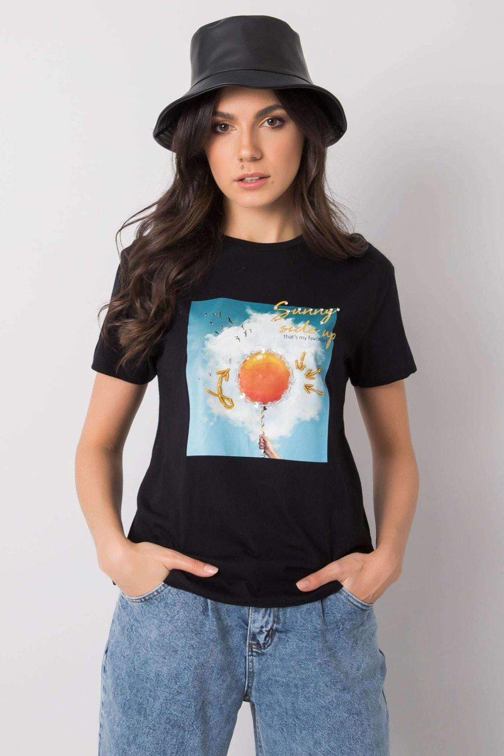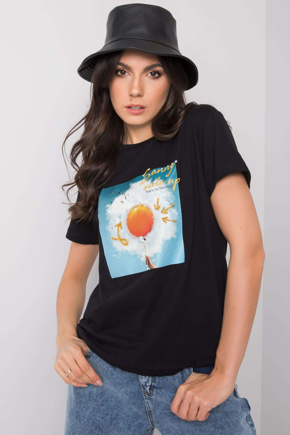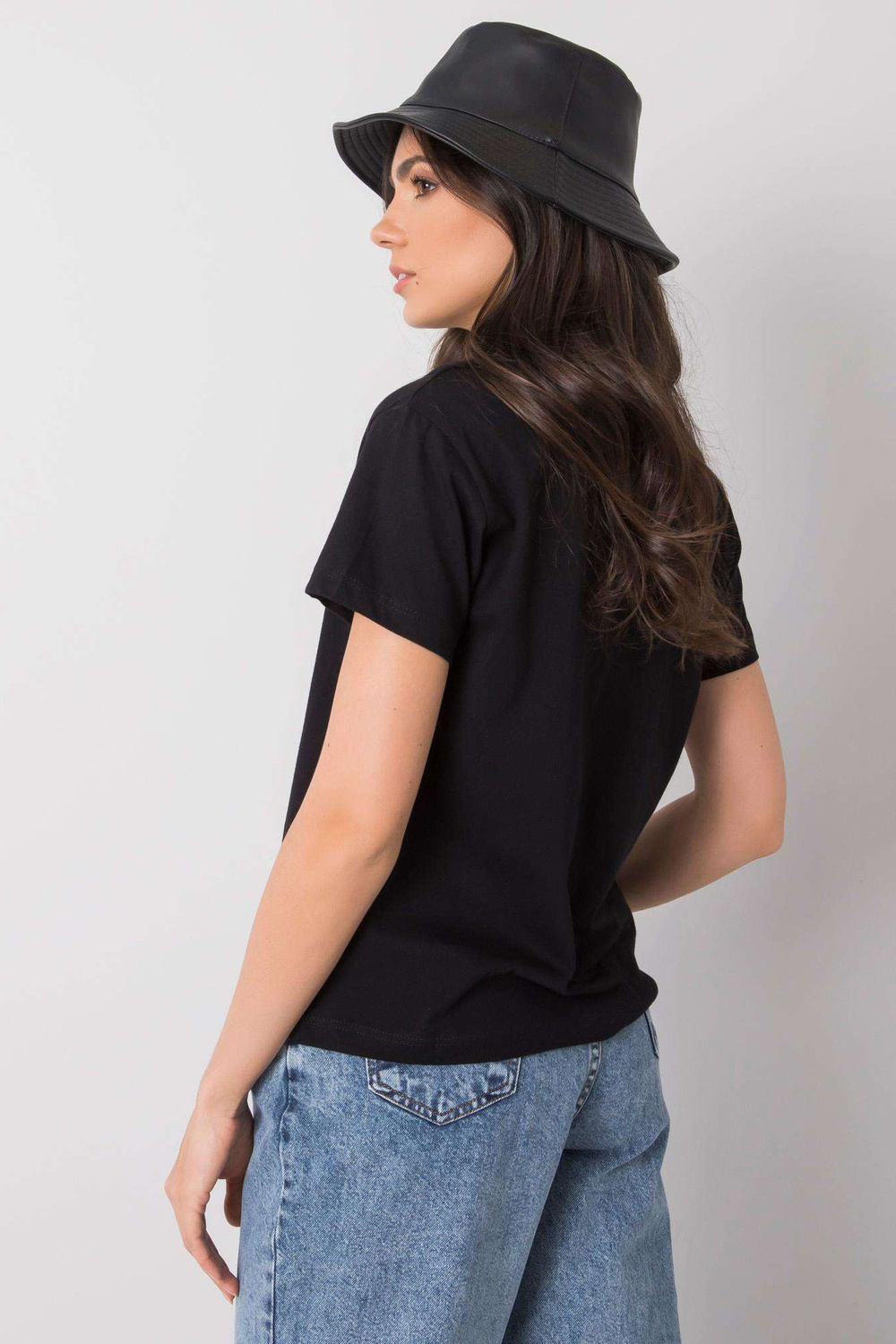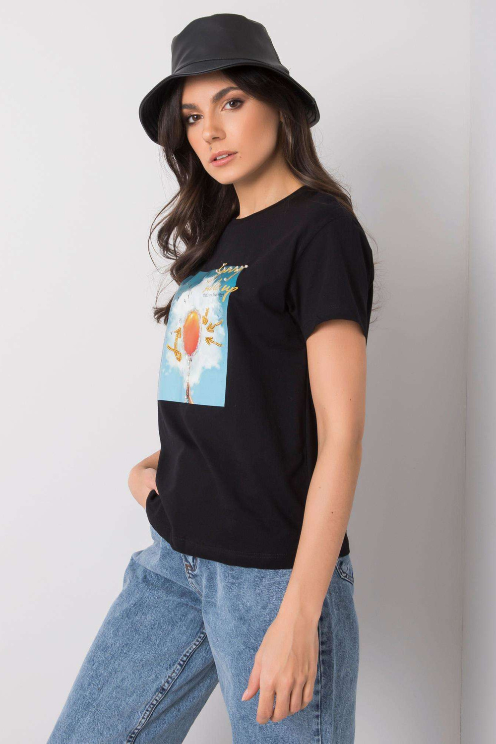 Melns T-krekls ar Trissa apdruku .