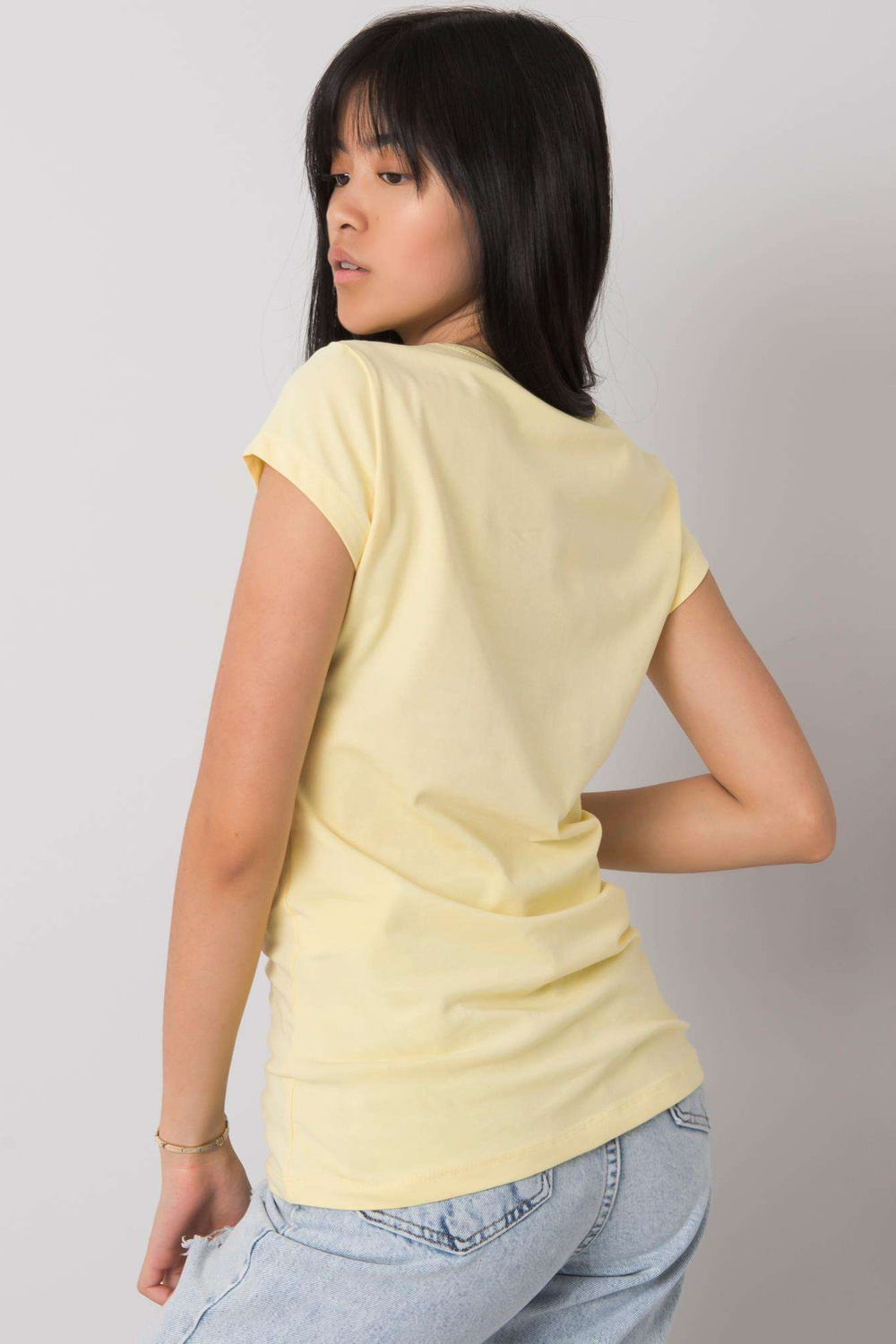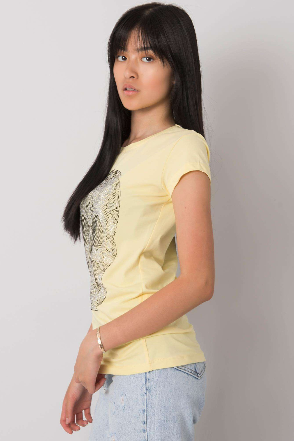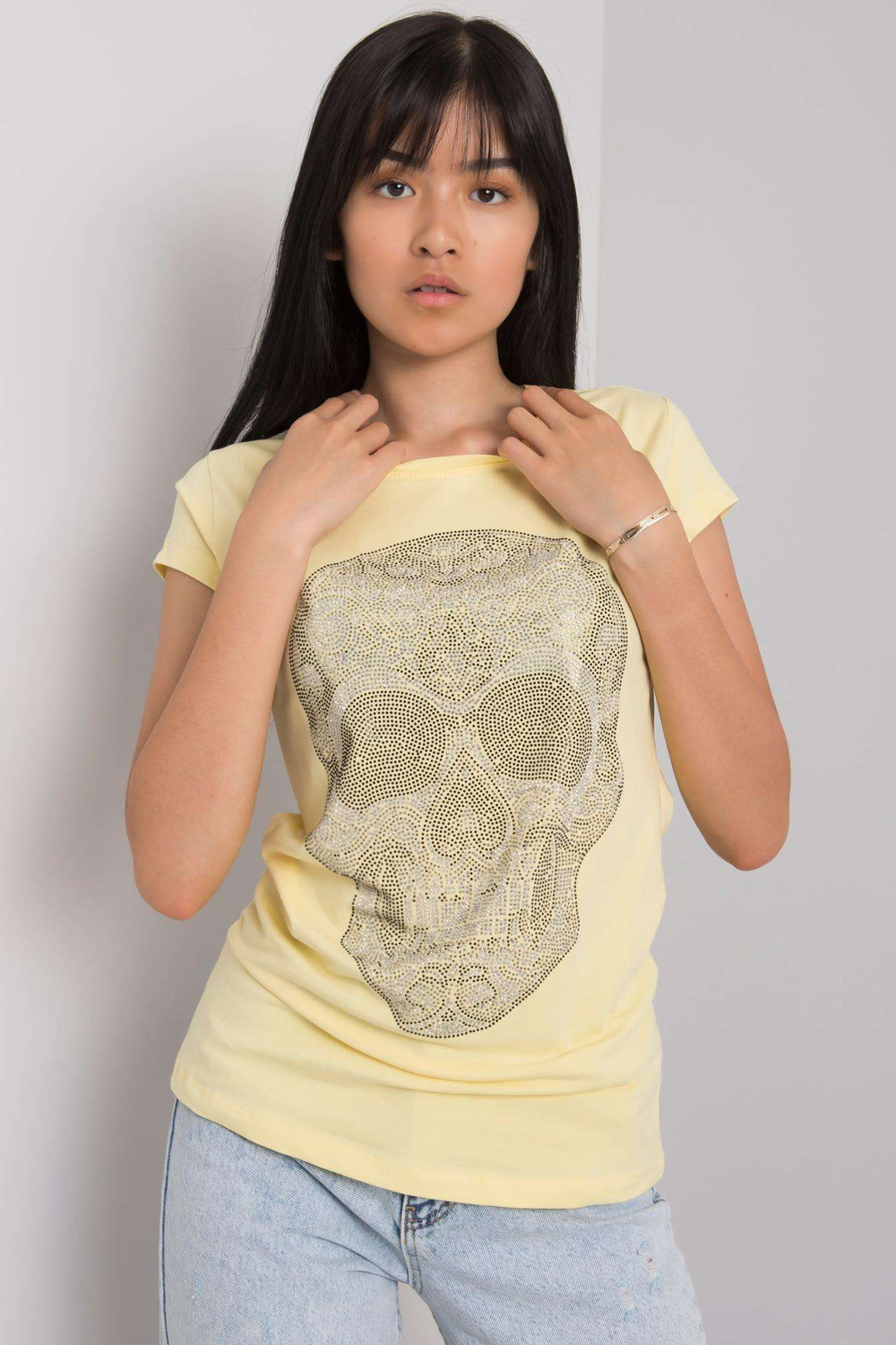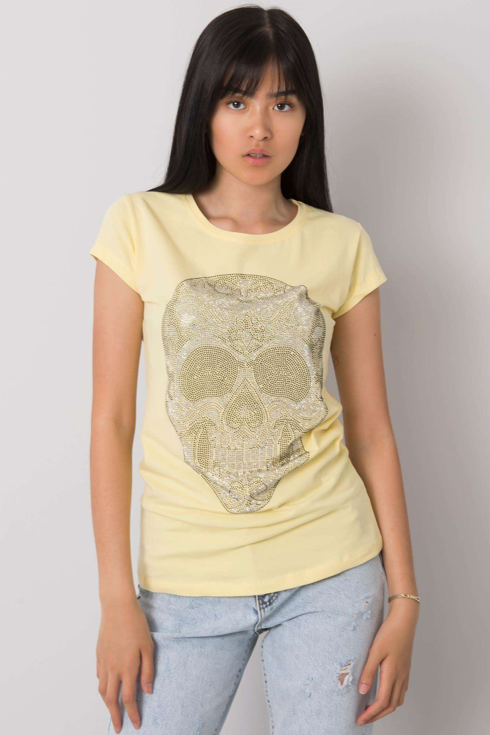 Gaiši dzeltens T-krekls ar galvaskausa aplikāciju.