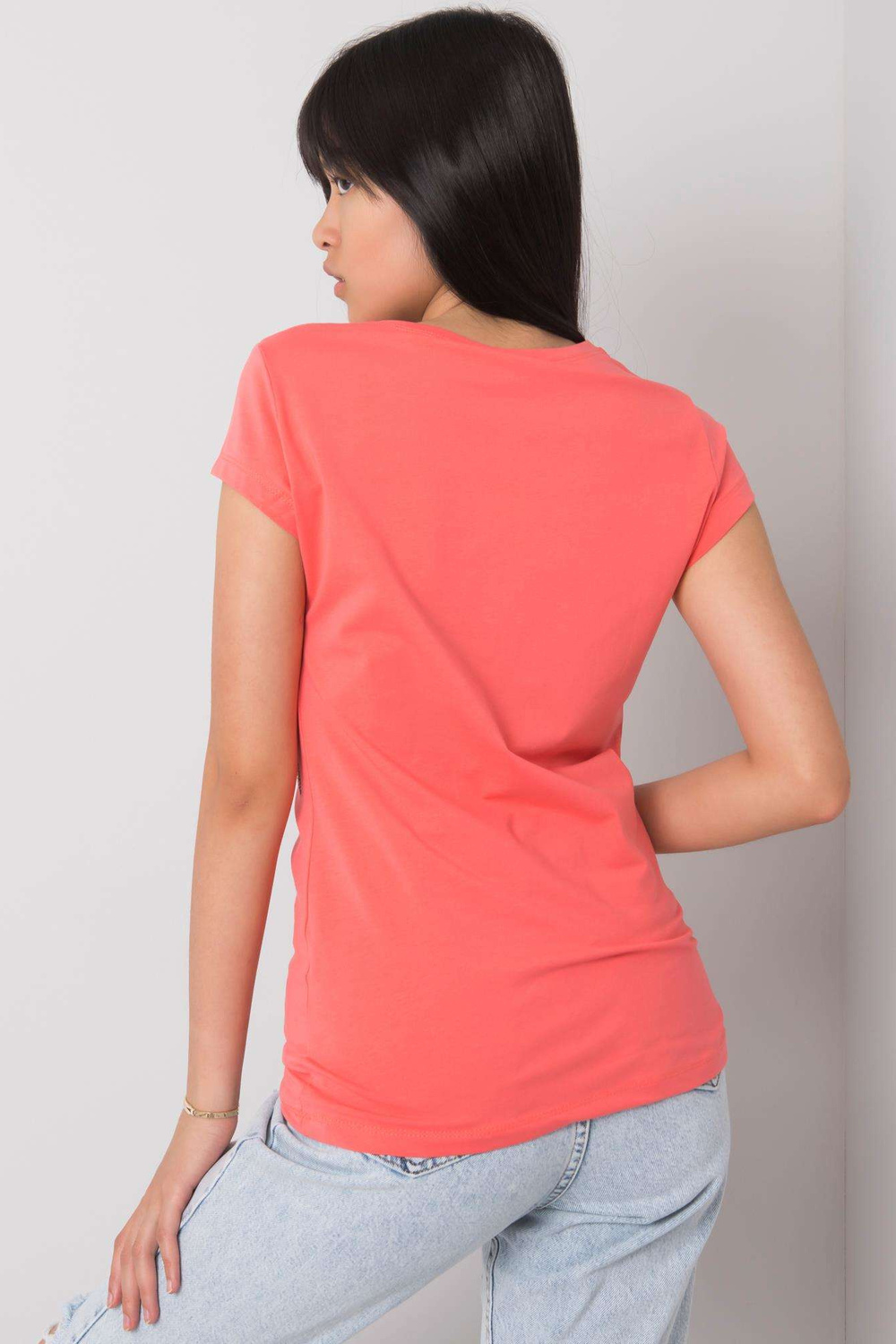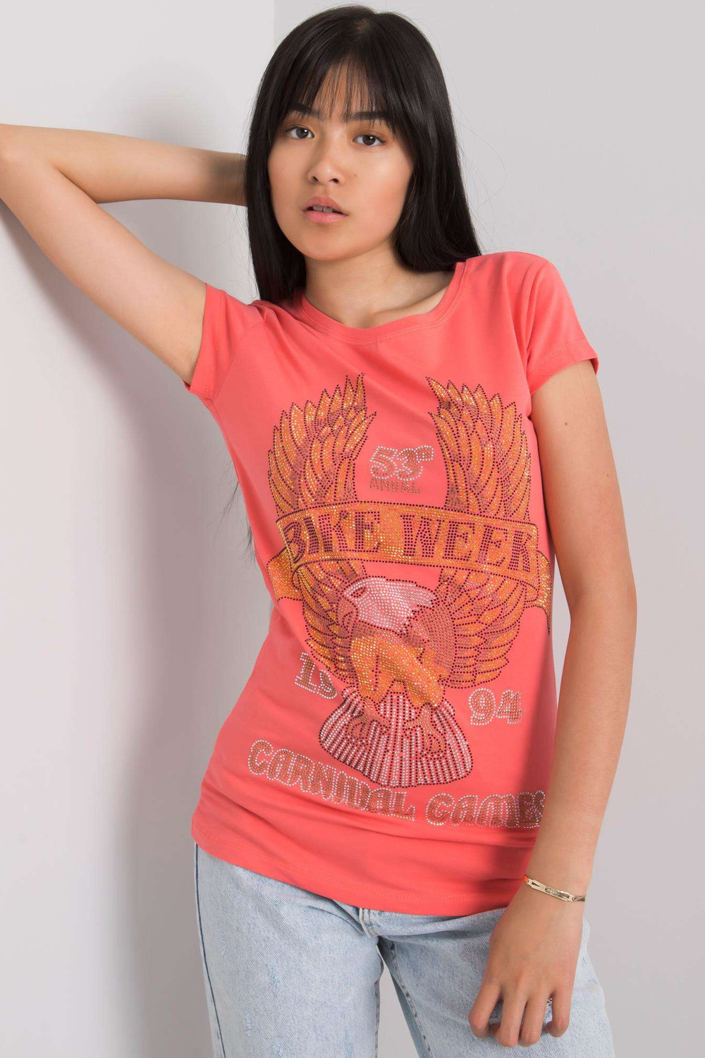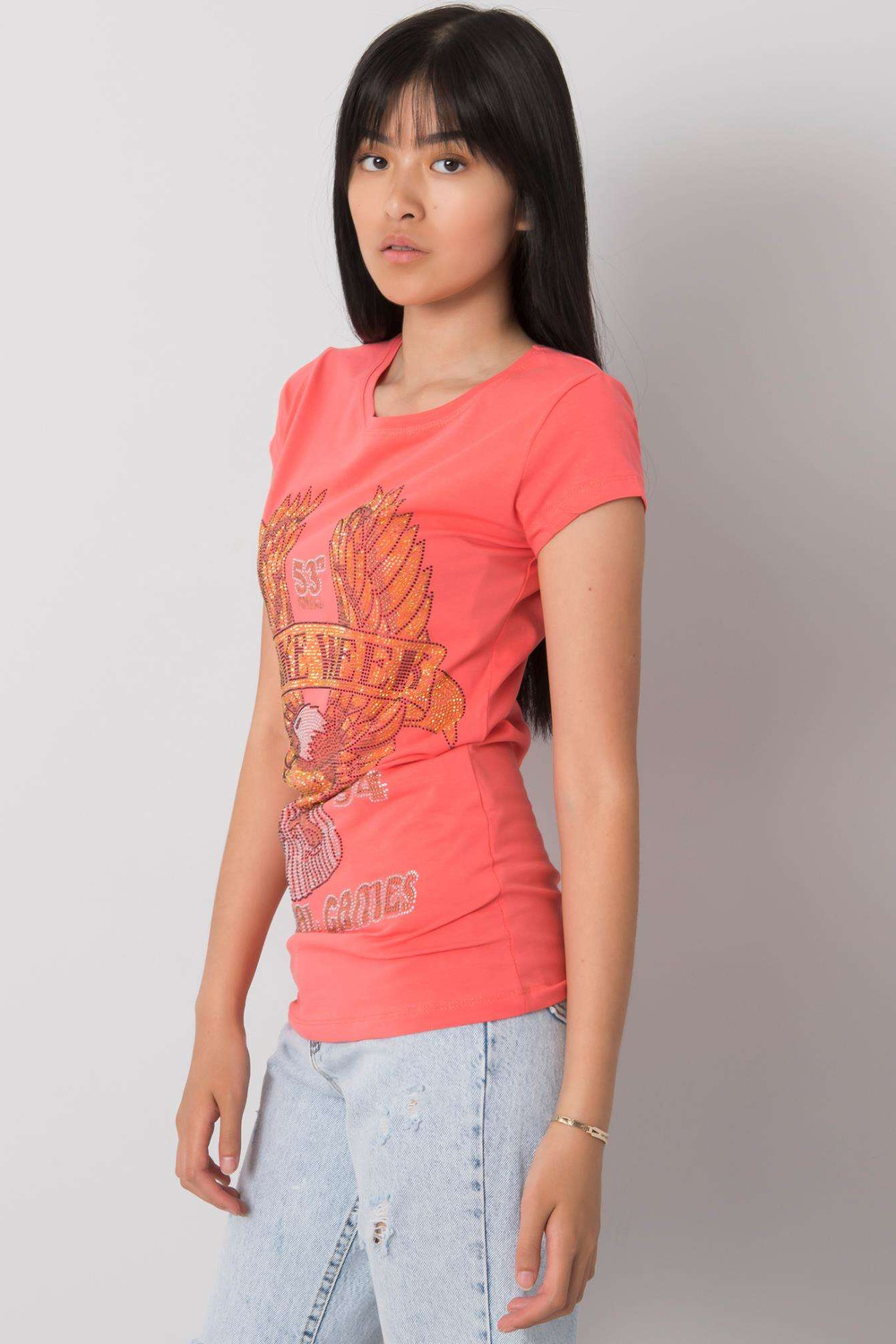 Koraļļu T-krekls ar Haley aplikāciju.