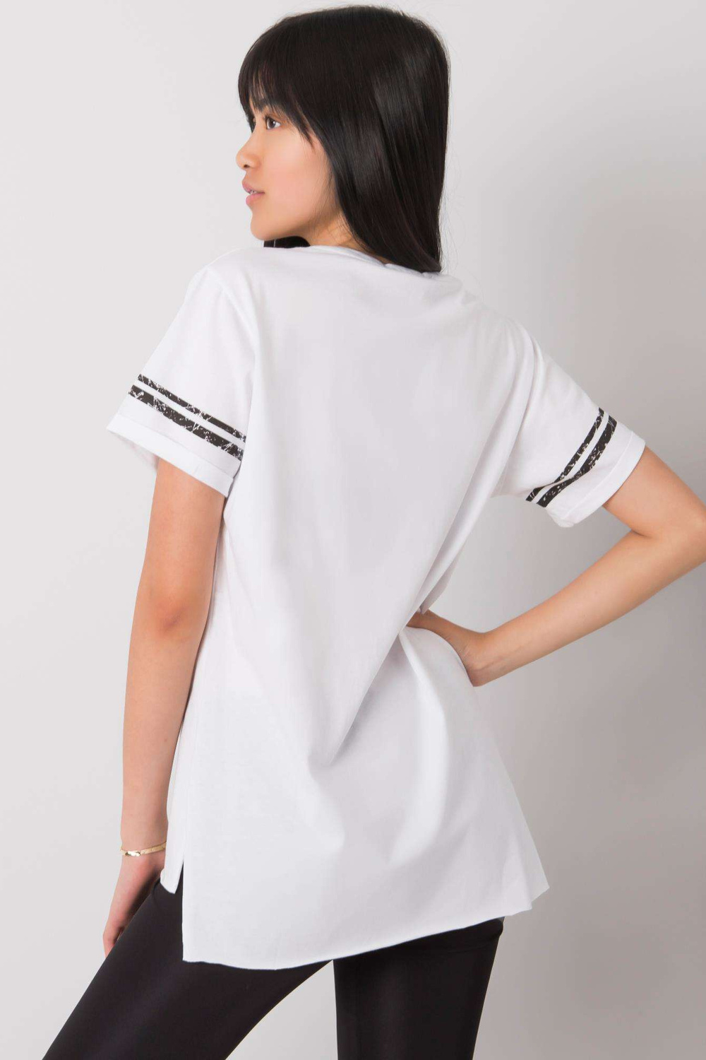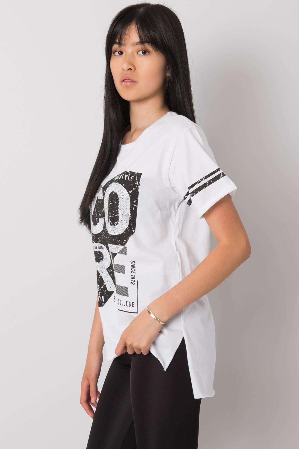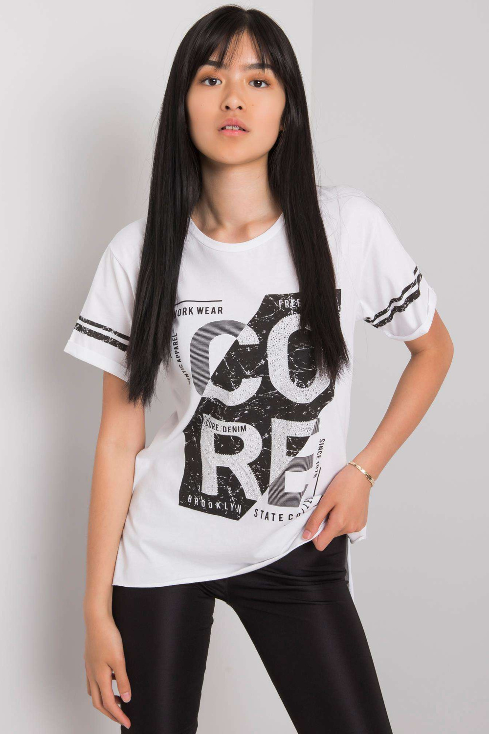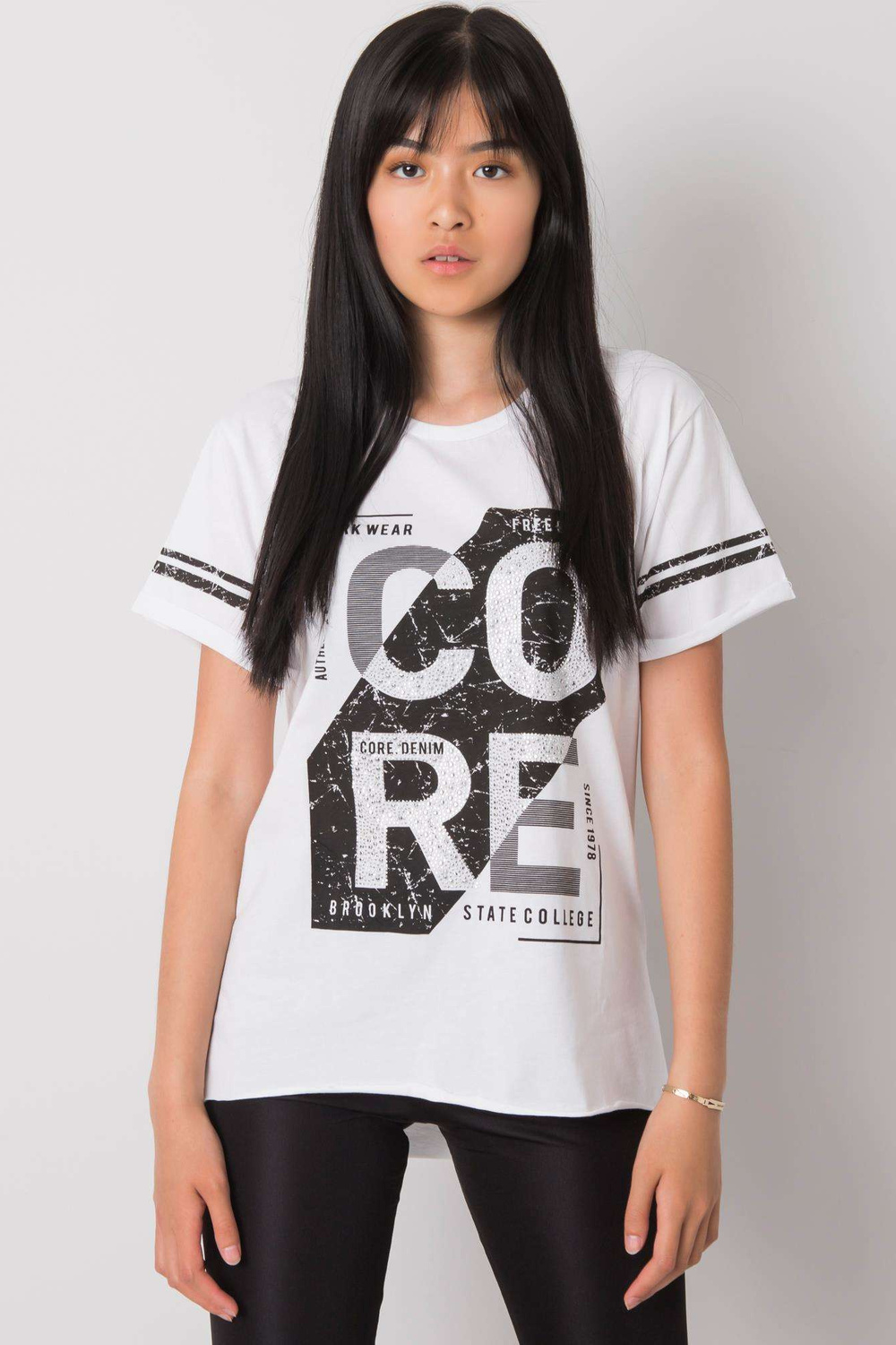 Balts T-krekls ar dzintara apdruku. ekstras: rhinestones materiālssastāvs: 100% kokvilna mazgāšanas metode: veļas mašīna 30°C Modelis valkā S izmēru. Modeļa izmēri: augums 167 cm, krūtis 73 cm, viduklis 64 cm, gurni 91 cm. T-krekla izmēri izmērā