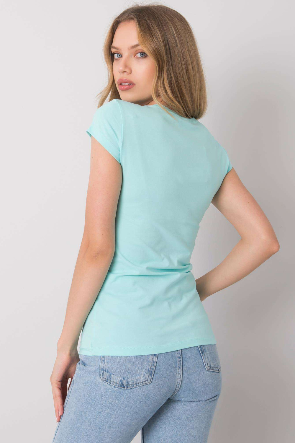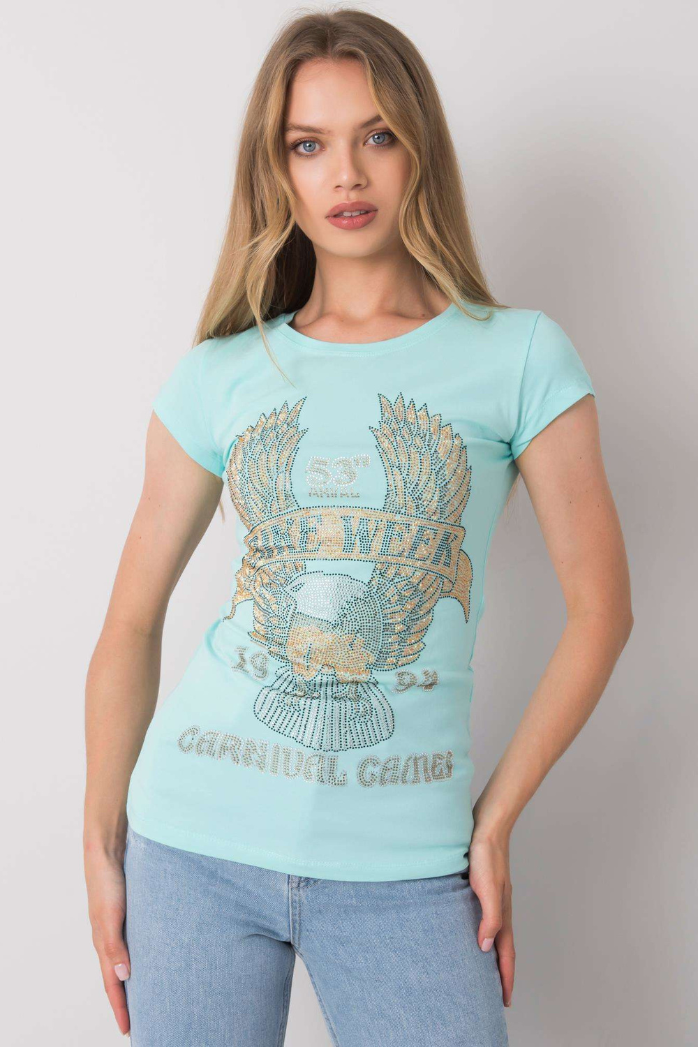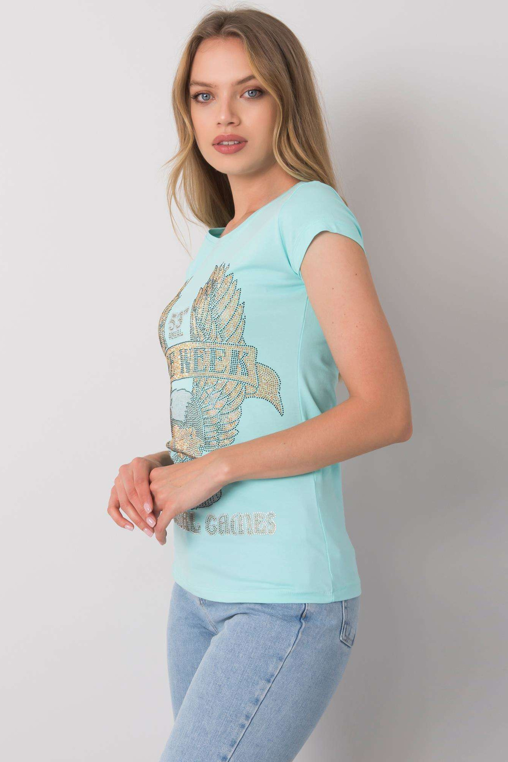 Gaiši zils T-krekls ar Haley aplikāciju.