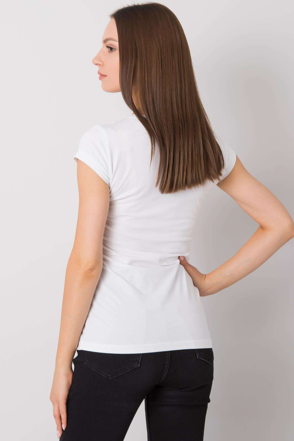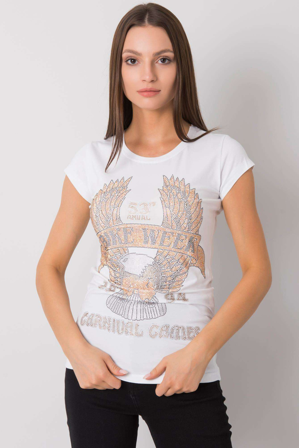 Balts T-krekls ar Haley aplikāciju. ekstras: rhinestones materiālssastāvs: 90% kokvilna, 10% elastāns mazgāšanas metode: veļas mašīna 30°C Modelis valkā S izmēru. Modeļa izmēri: augums 172 cm, krūtis 84 cm, viduklis 60 cm, gurni 88 cm. Izmēri