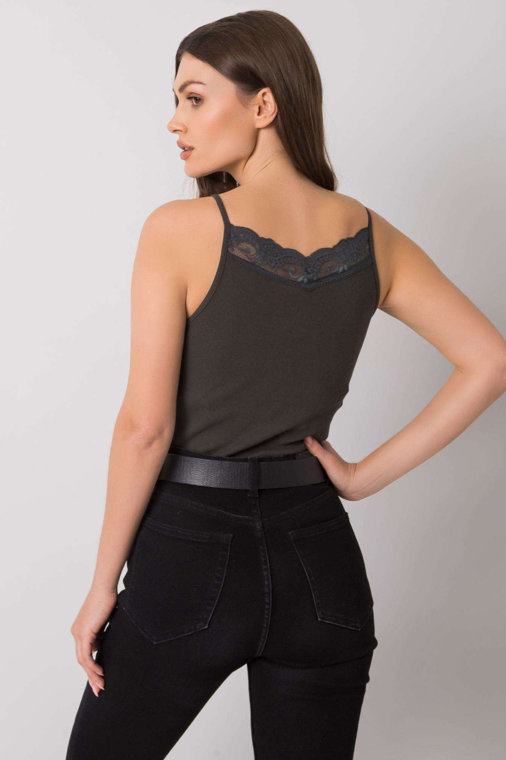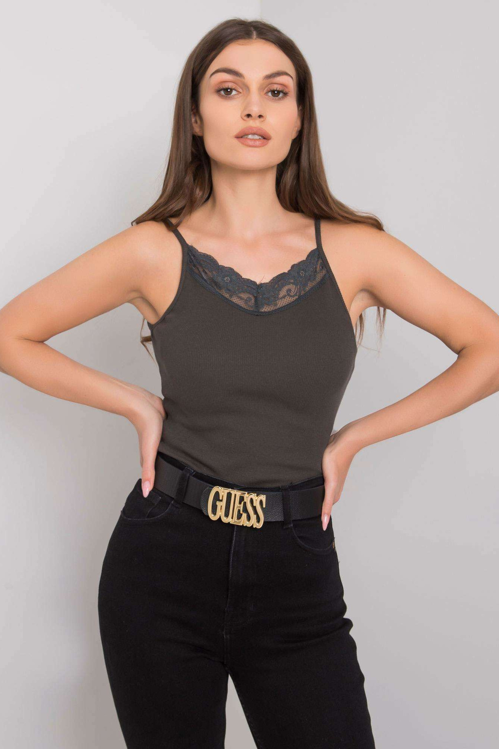 Armine tumši haki krāsas rievotais tops. Materiāla sastāvs: 90% kokvilna, 10% elastāns mazgāšanas metode: veļas mašīna 30°C. Modelis valkā viena izmēra izmēru. Modeļa izmēri: augums 170 cm, krūtis 93 cm, viduklis 66 cm, gurni 93 cm. Augšdaļas izmēri vienā izmērā