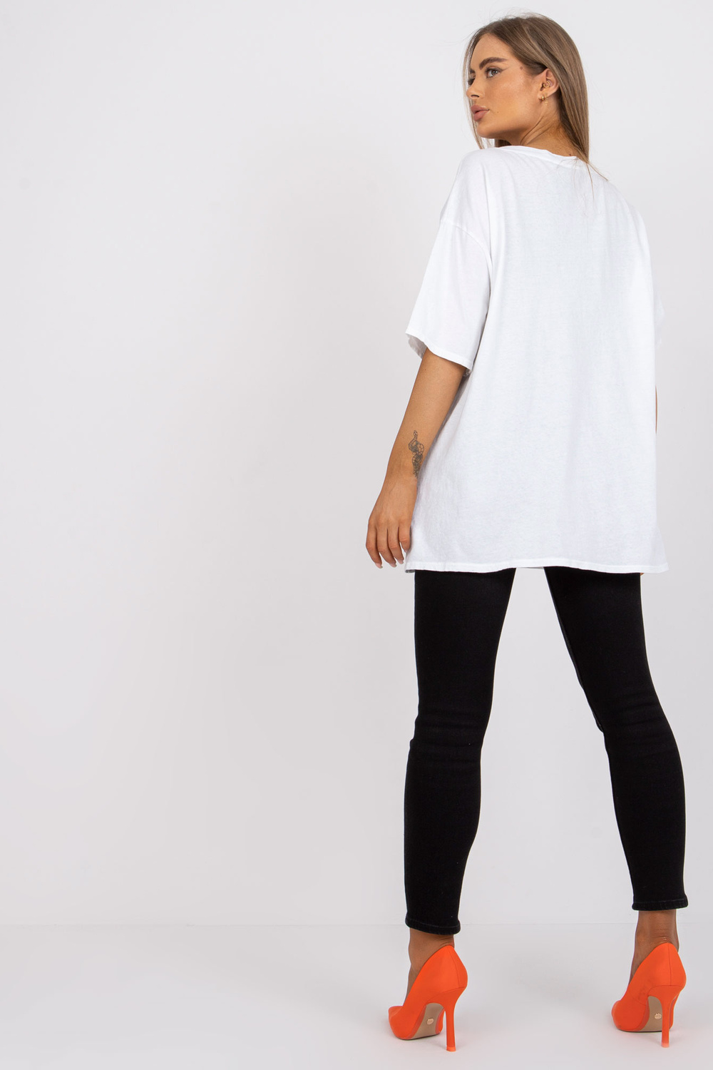 T-krekla izmēri viena izmēra izmērā, mērot plakanu: platums zem padusēm - 56 cm, kopējais garums - 75 cm.