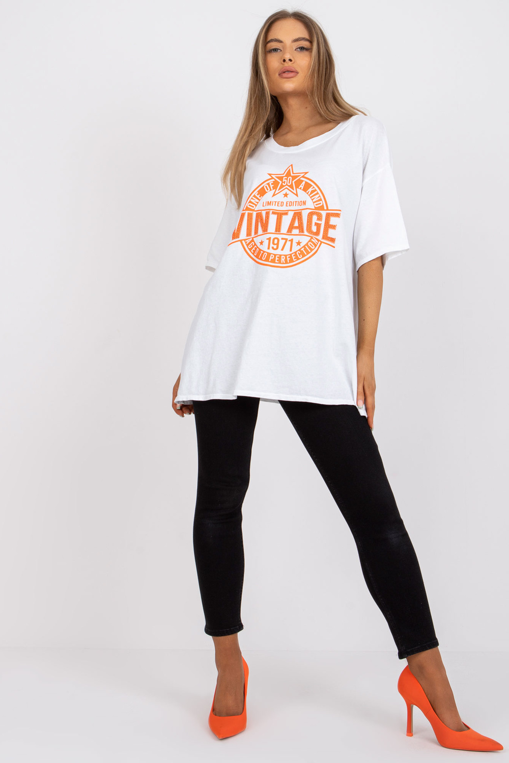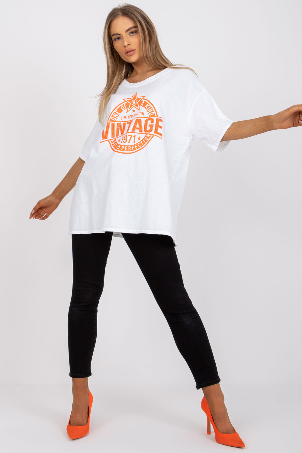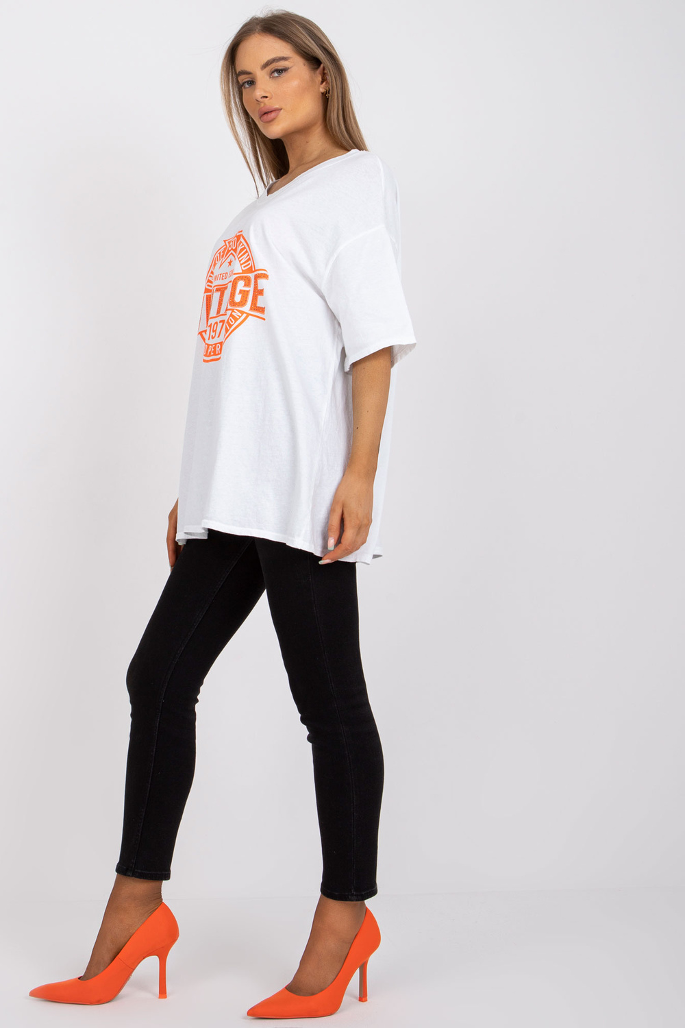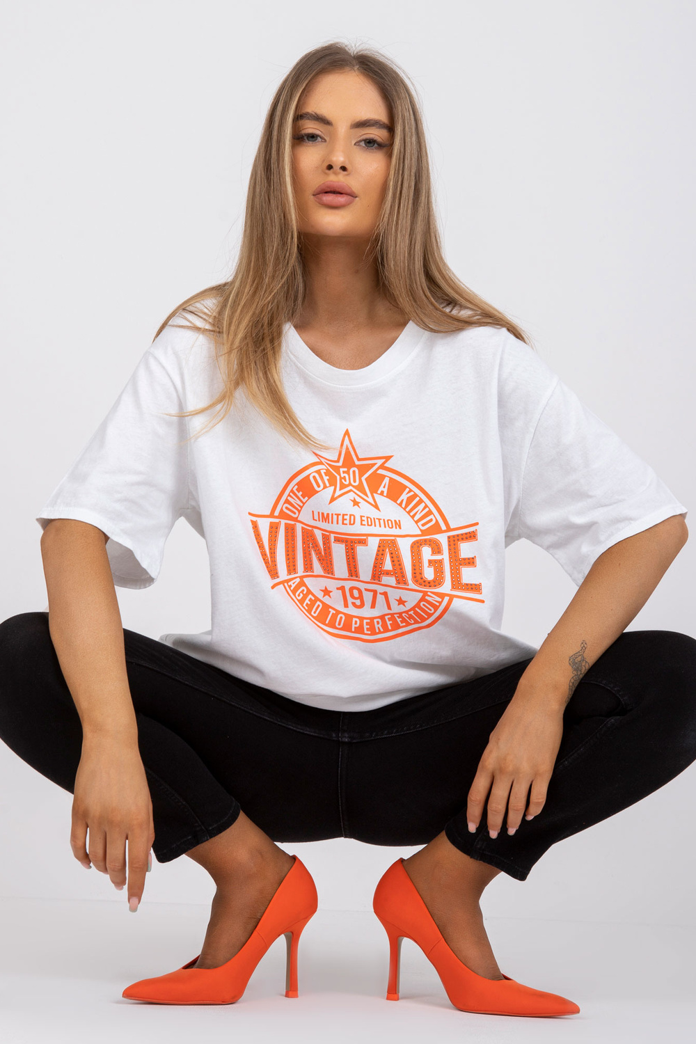 Balts un oranžs kokvilnas T-krekls ar aplikāciju.