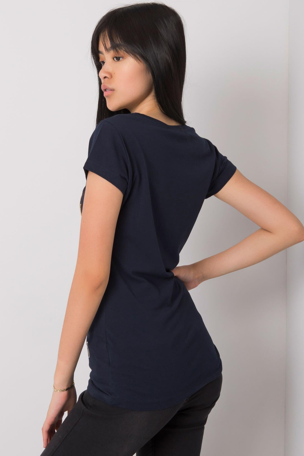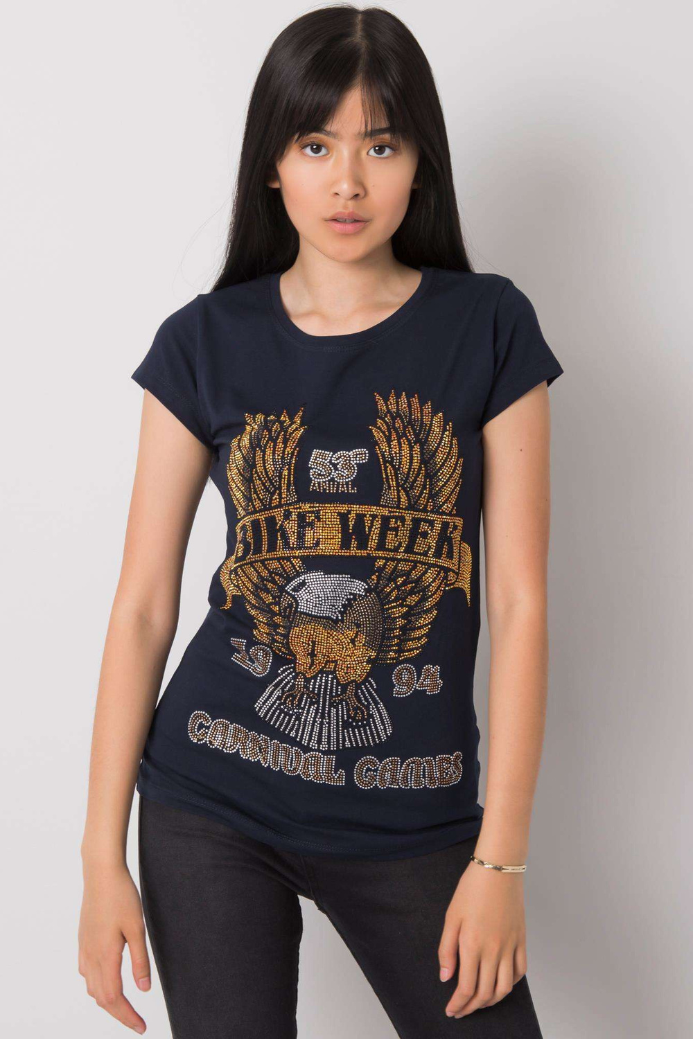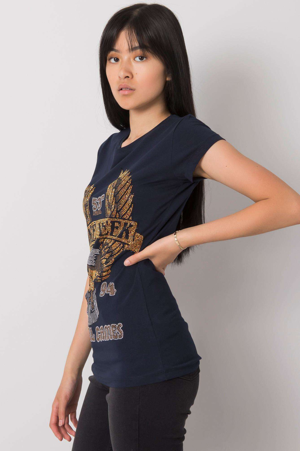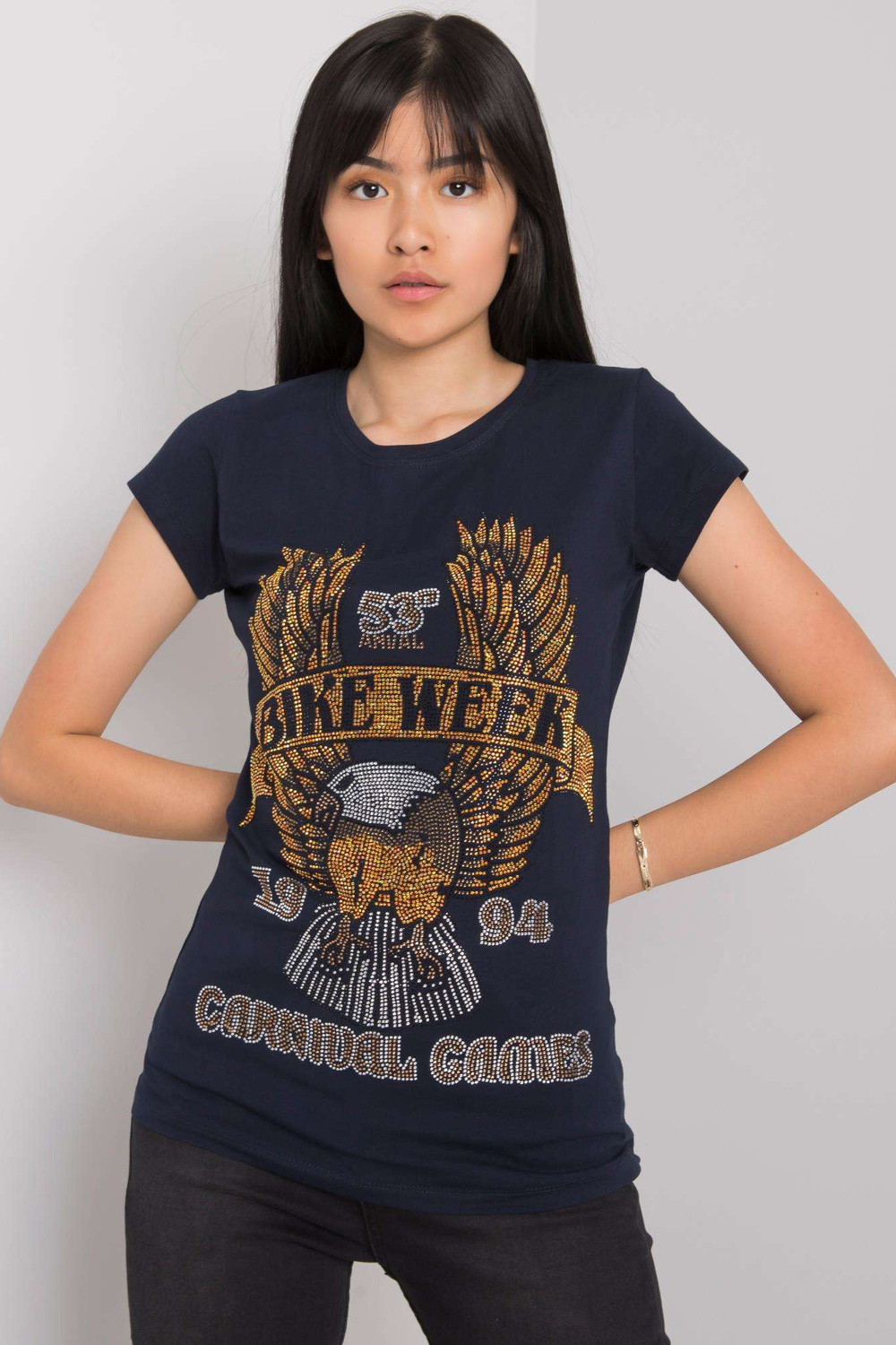 Navyblue T-krekls ar Haley aplikāciju. ekstras: rhinestones materiālssastāvs: 90% kokvilna, 10% elastāns mazgāšanas metode: veļas mašīna 30°C Modelis valkā S izmēru. Modeļa izmēri: augums 167 cm, krūtis 73 cm, viduklis 64 cm, gurni 91 cm. Izmērs