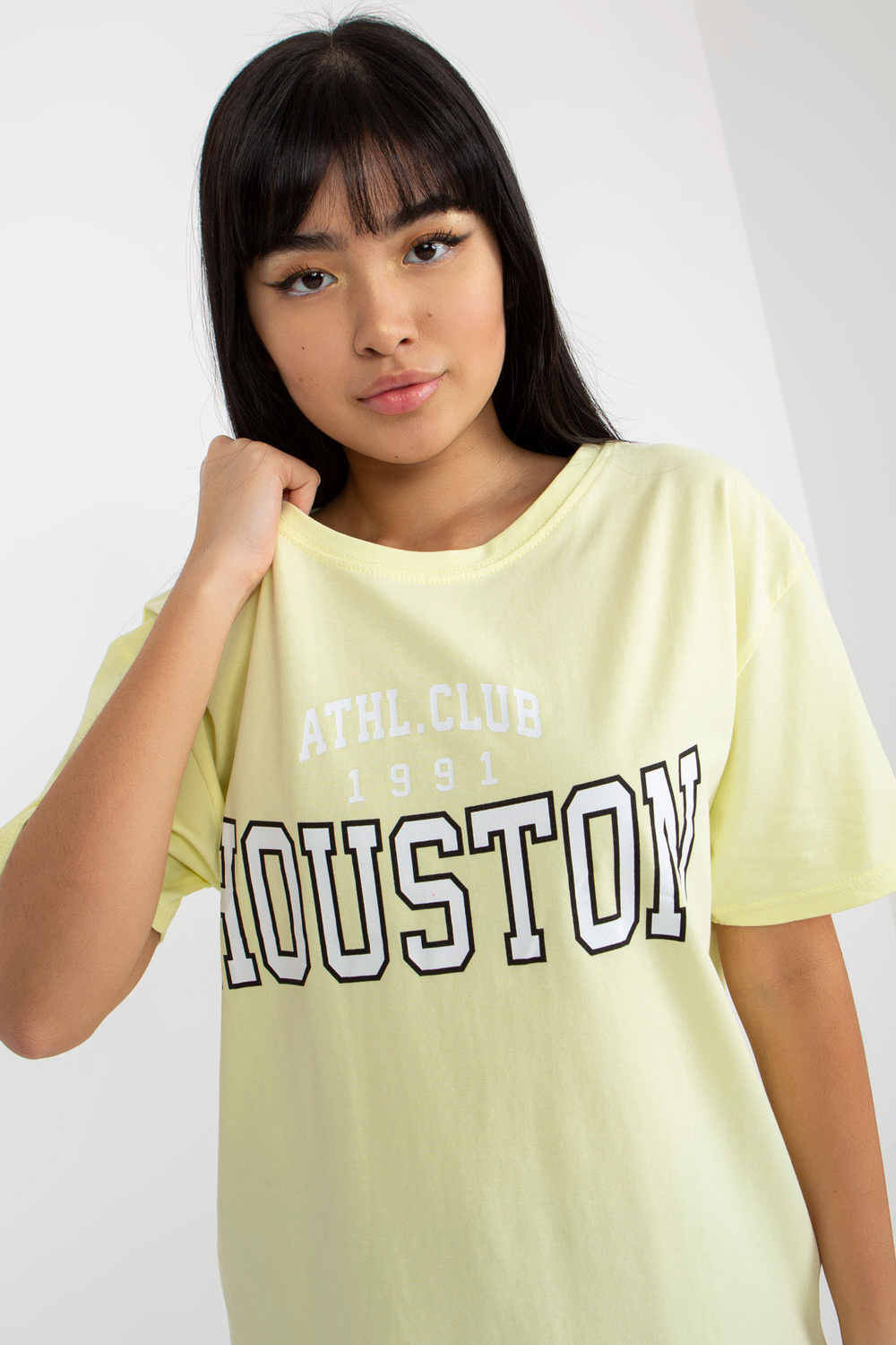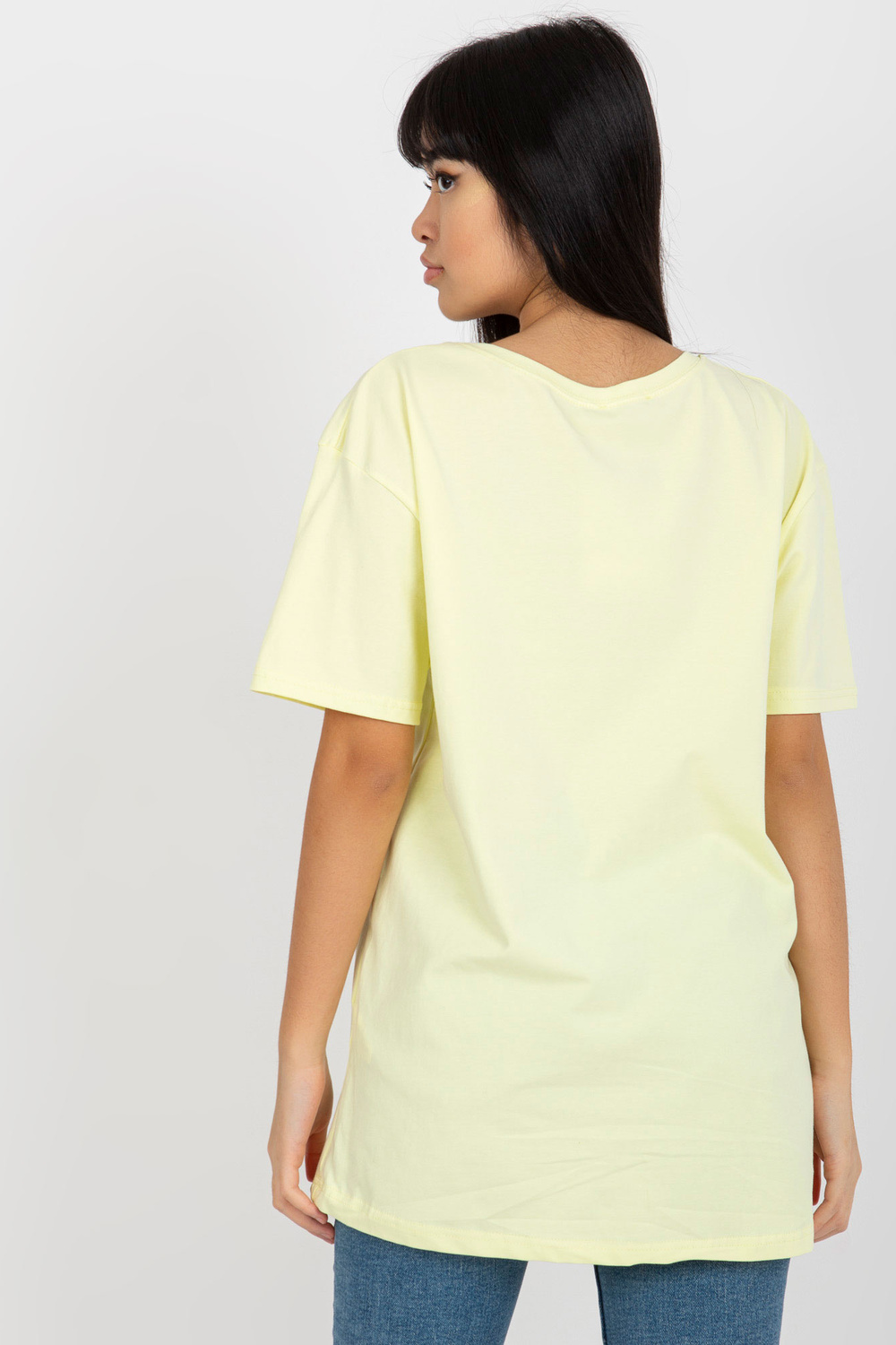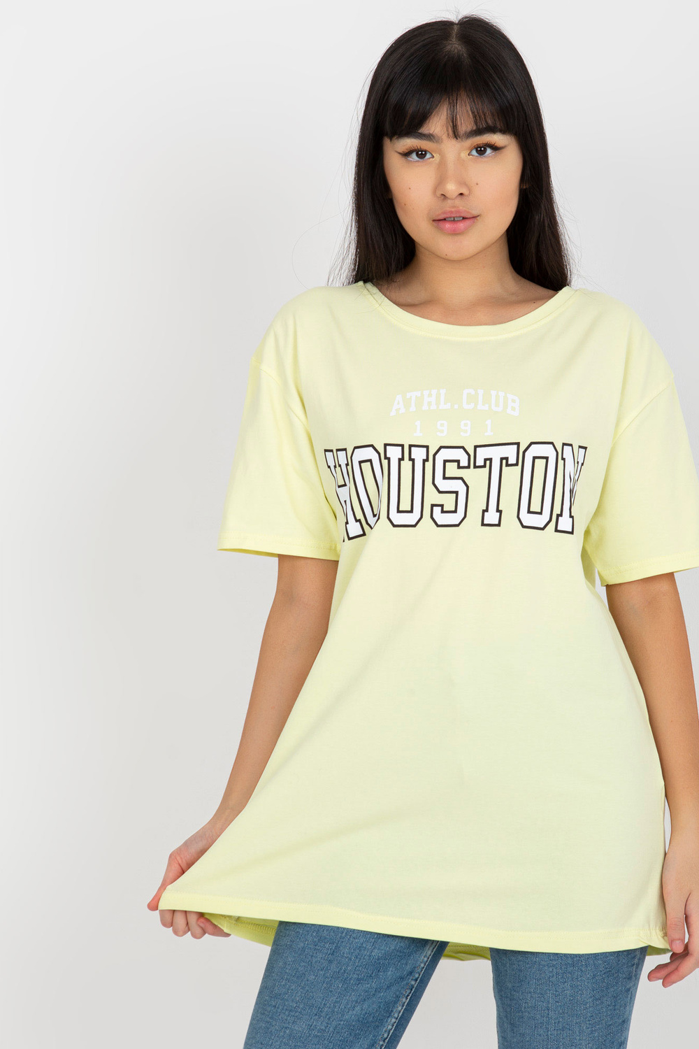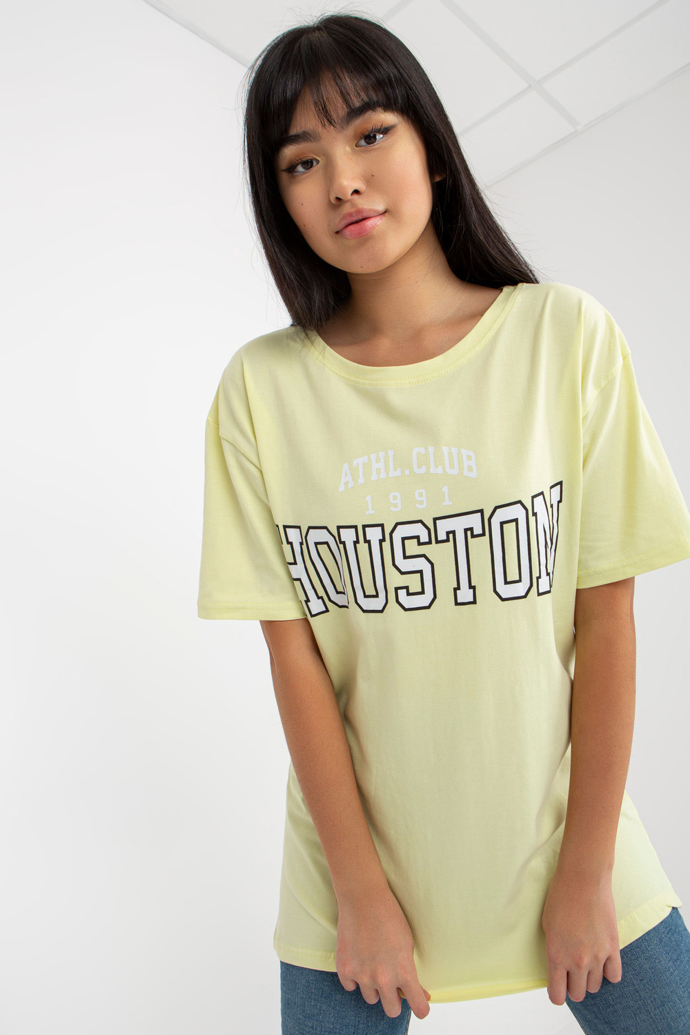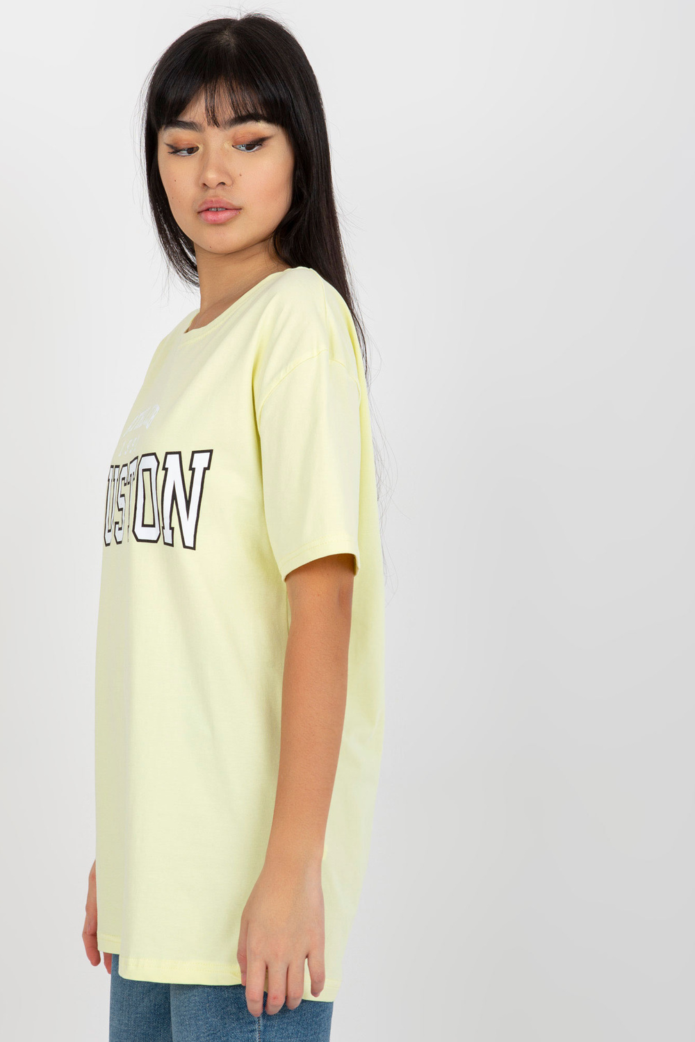Dzeltens brīvs T-krekls ar uzrakstu.