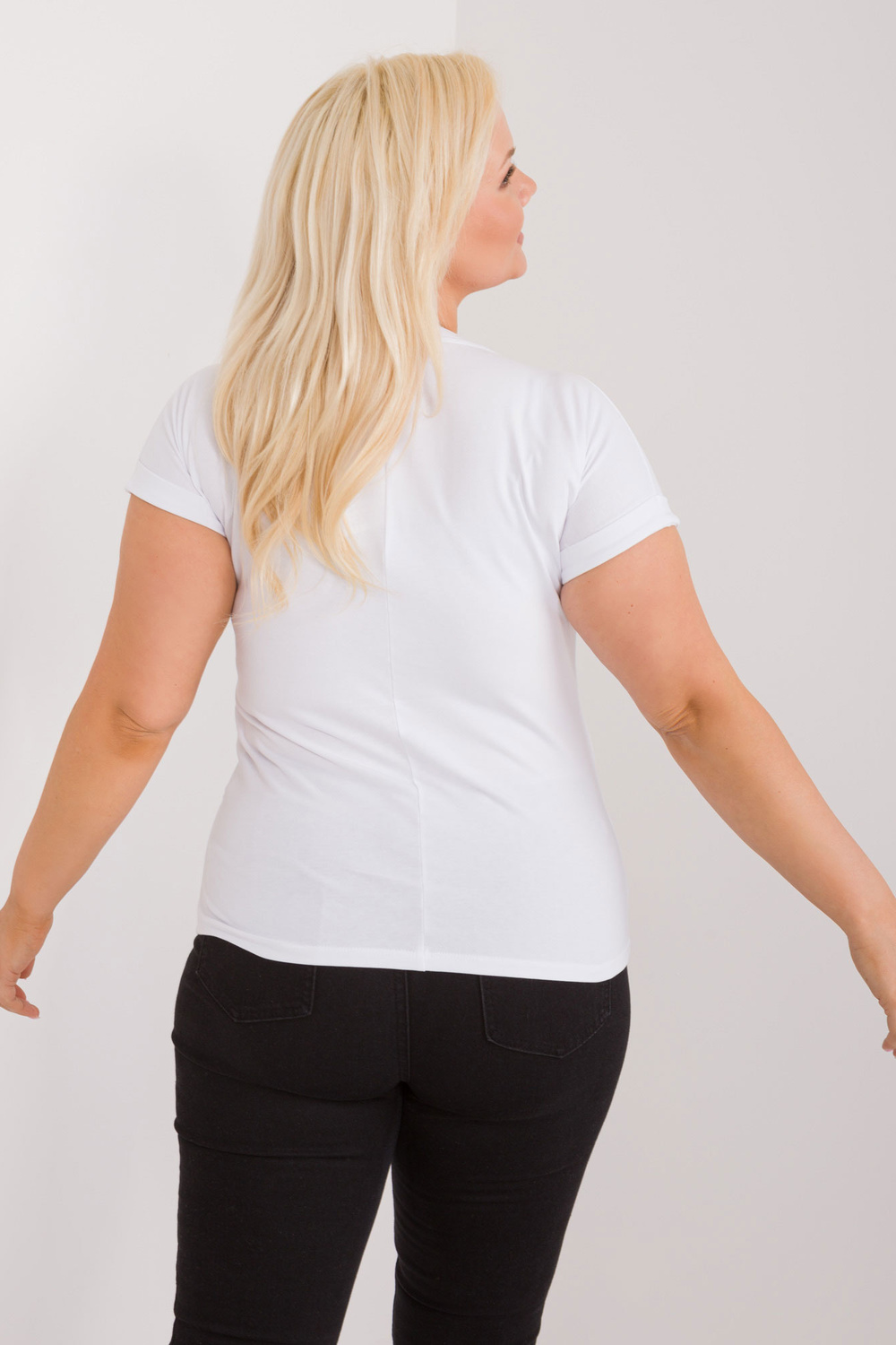 Viena izmēra T-krekla izmēri mērīti plakaniski: paduses platums - 55 cm, kopējais garums - 60 cm.